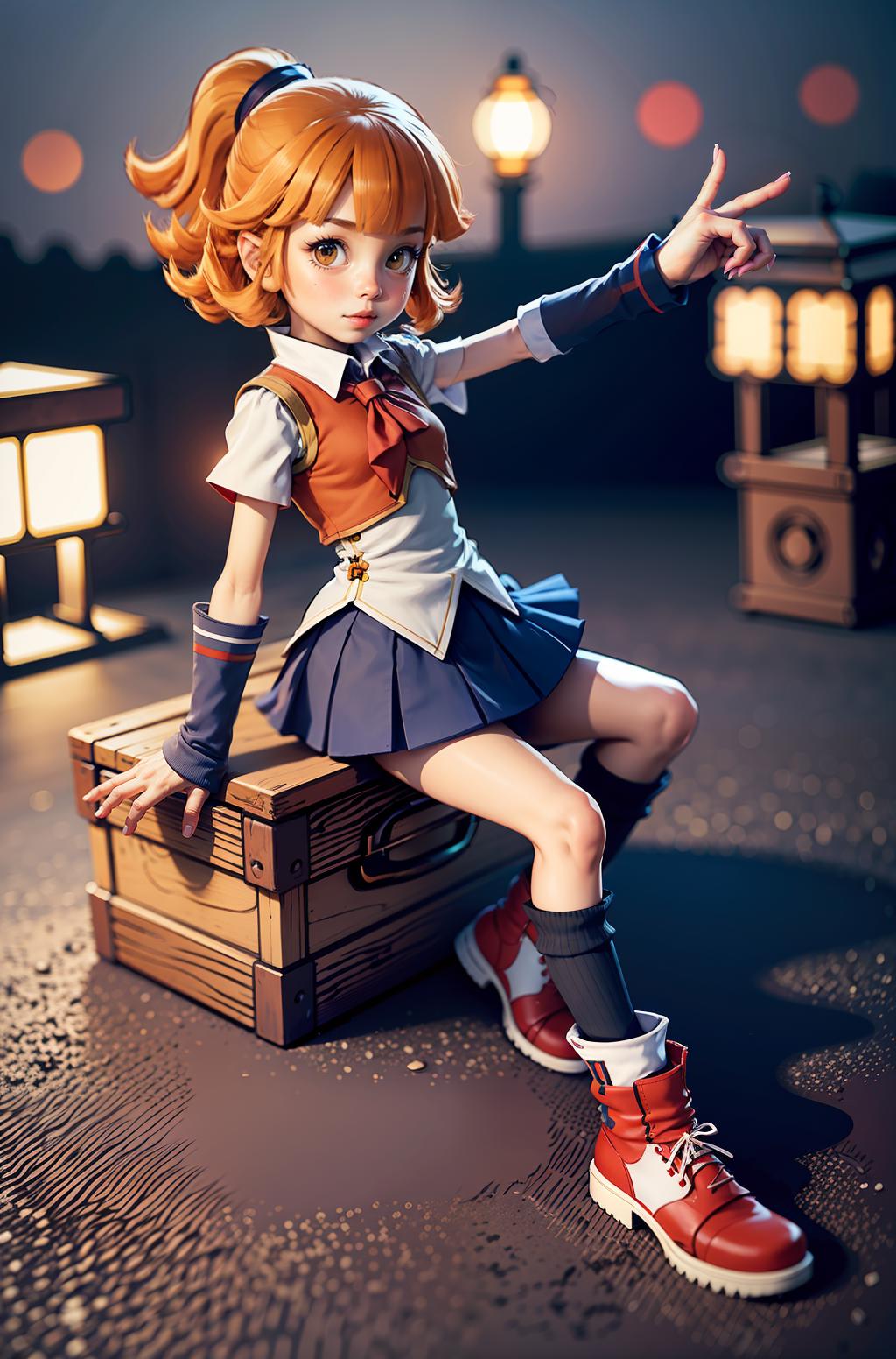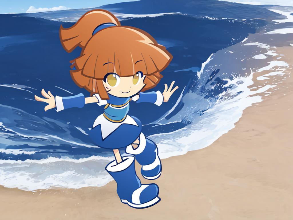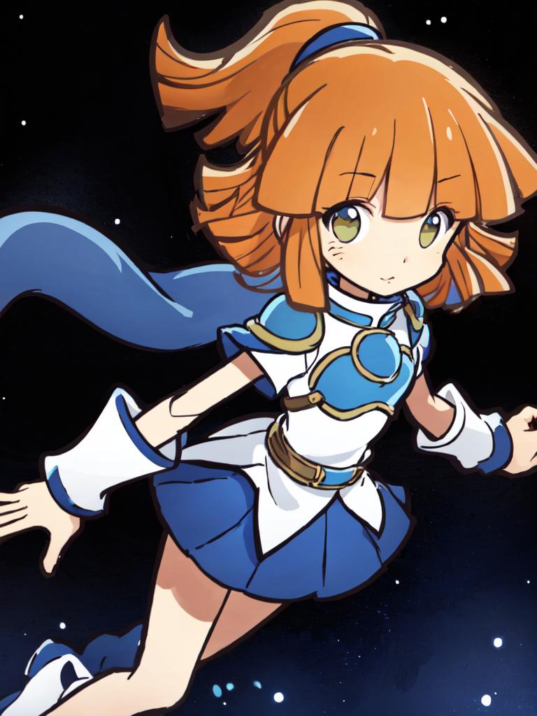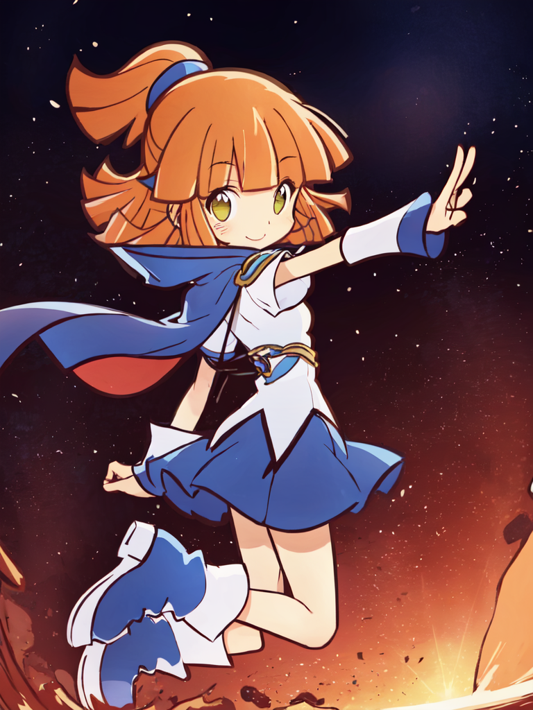 <lora:arle:0.7> arle nadja kawaii petit cute girl yellow eyes brown hair,half updo short topknot blue skirt, blue short sleeves, blue breast armor, white shirt, wrist cuffs blue capelet blue boots :> style parody