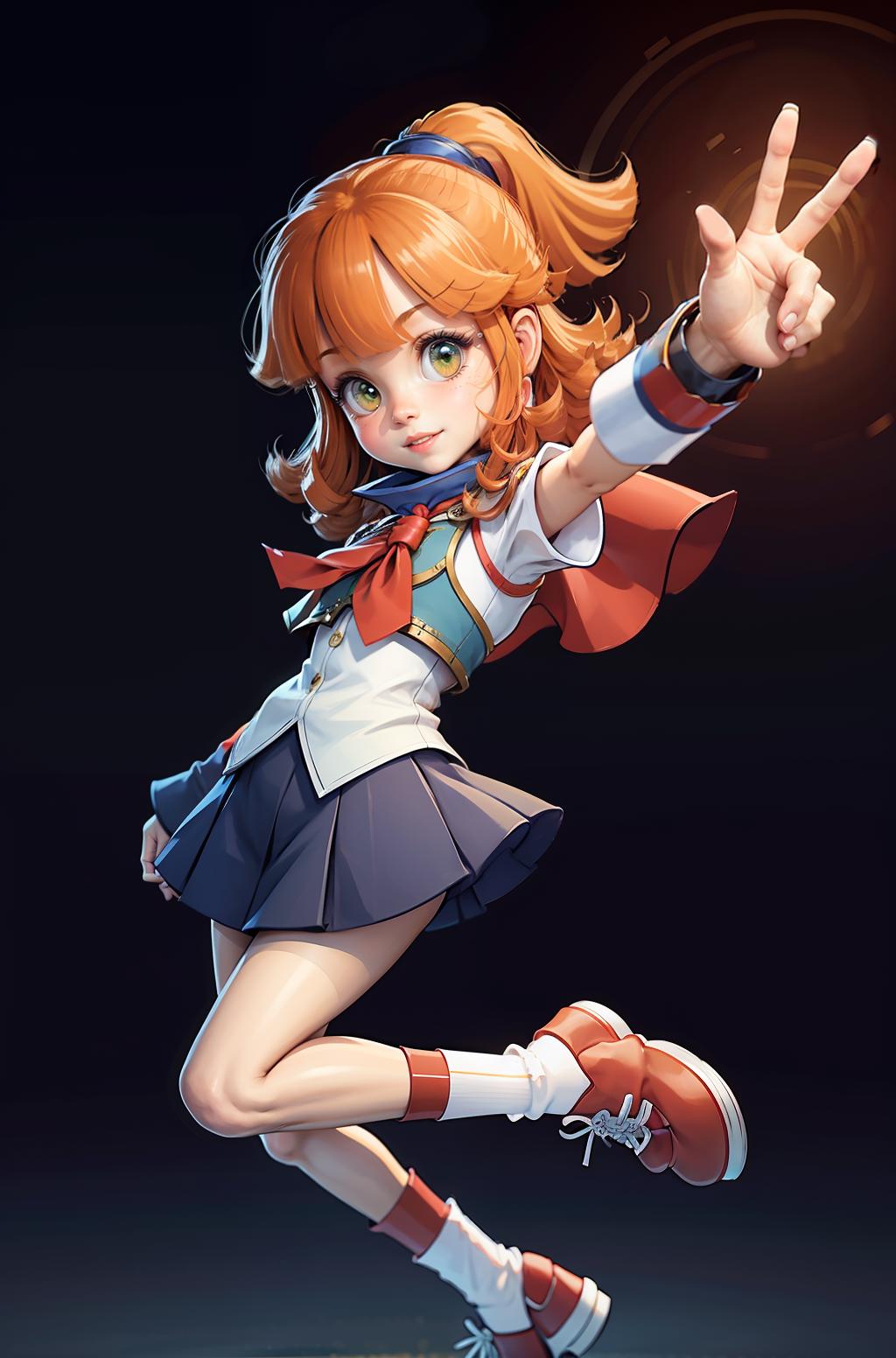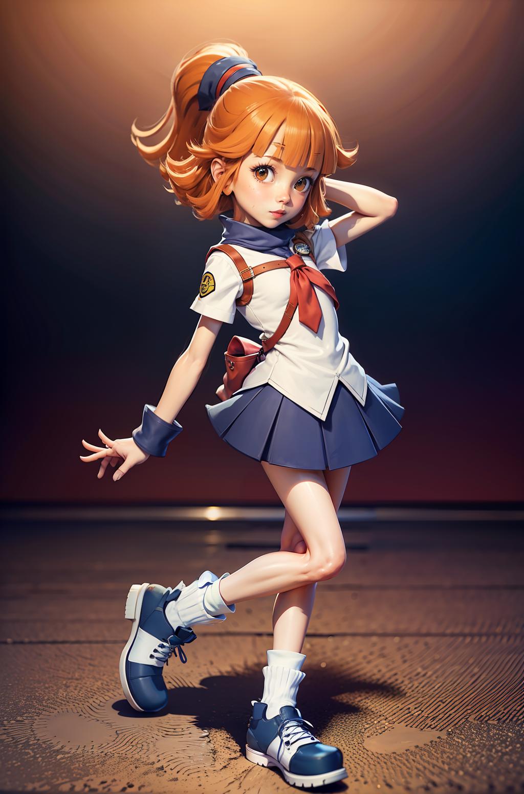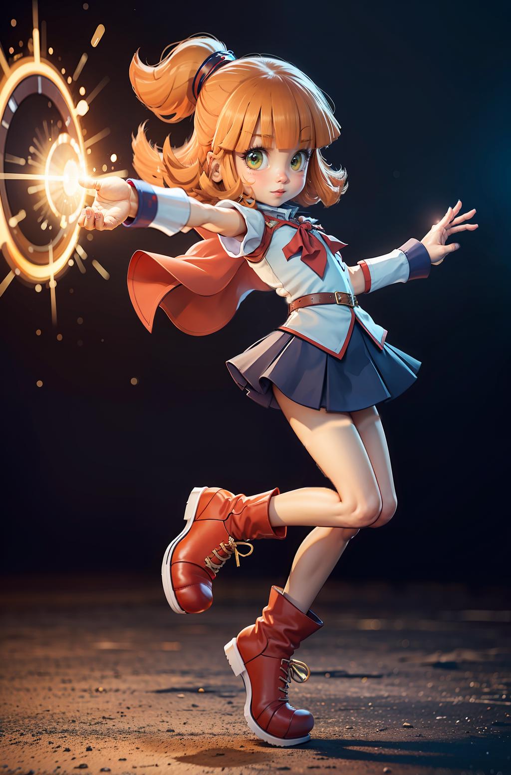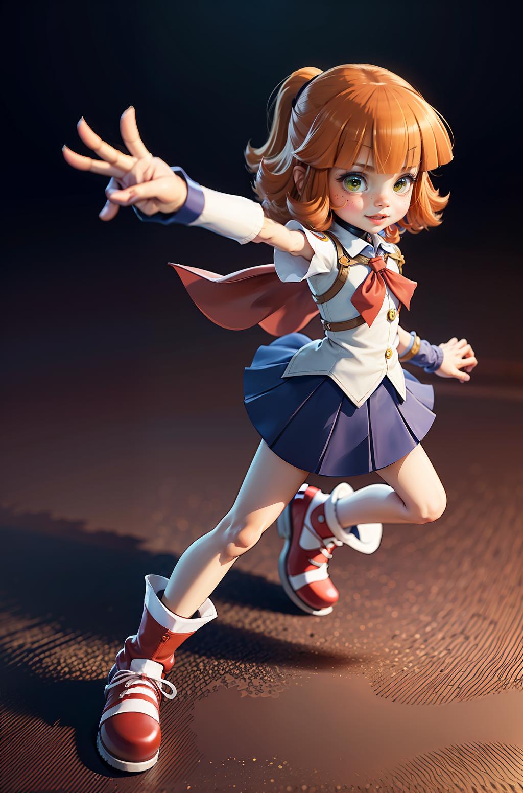 <lora:arle:0.7> arle nadja kawaii petit cute girl yellow eyes brown hair,half updo short topknot blue skirt, blue short sleeves, blue breast armor, white shirt, wrist cuffs blue capelet blue boots :> style parody