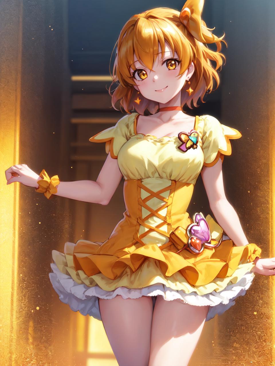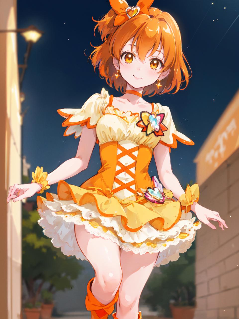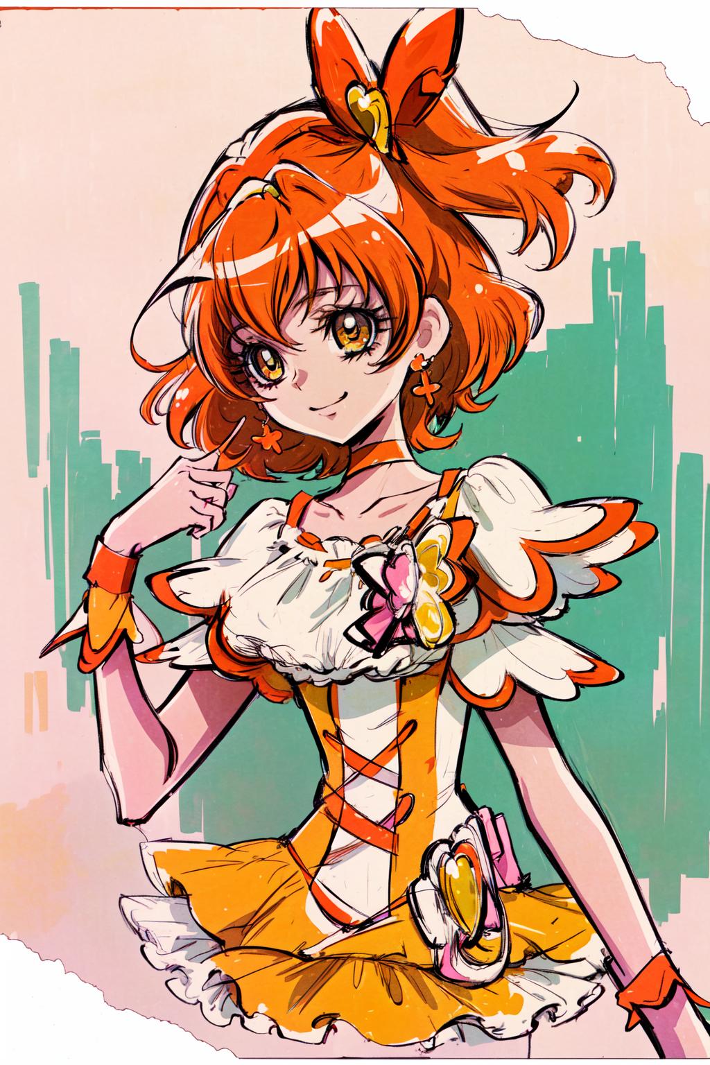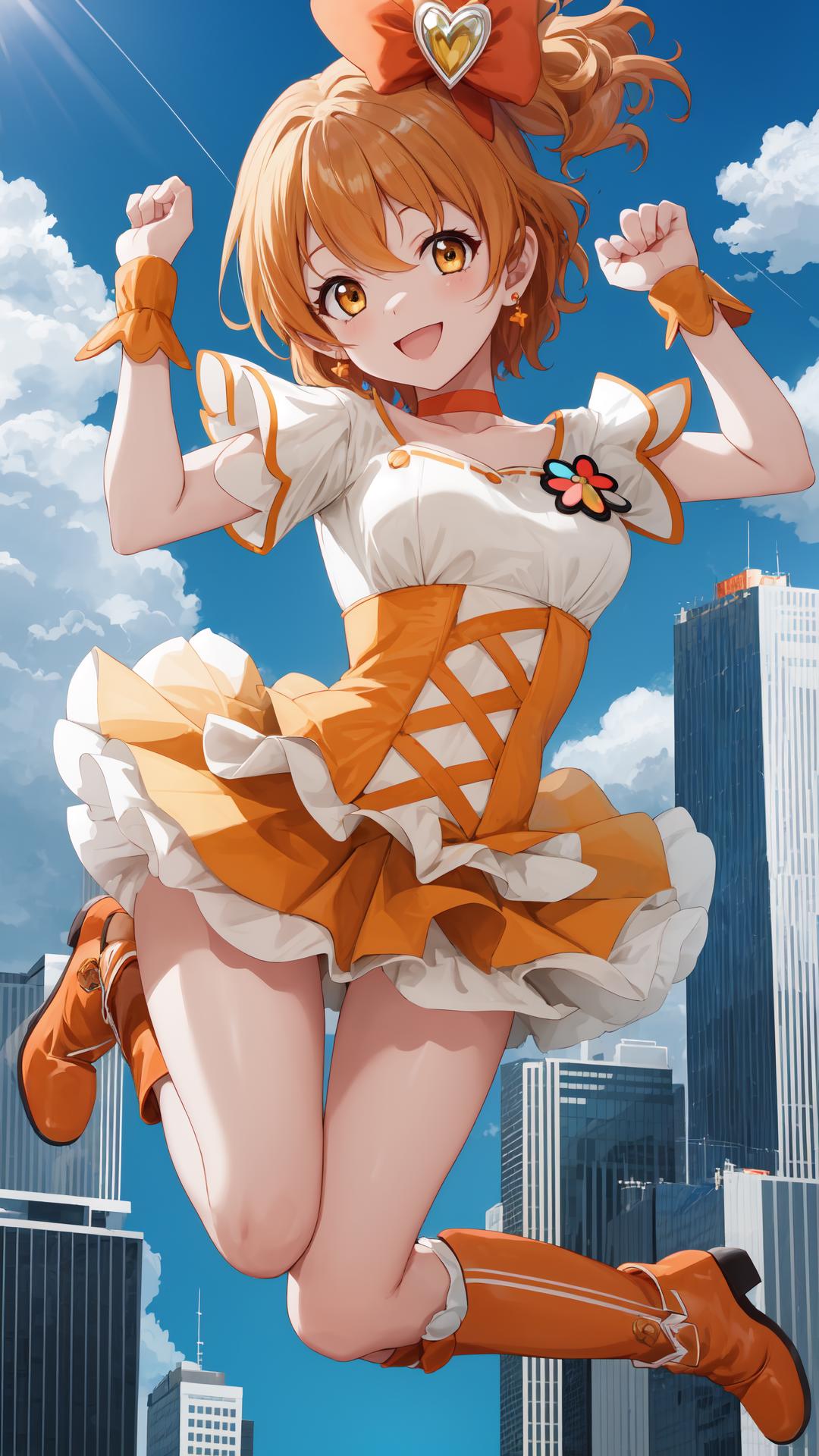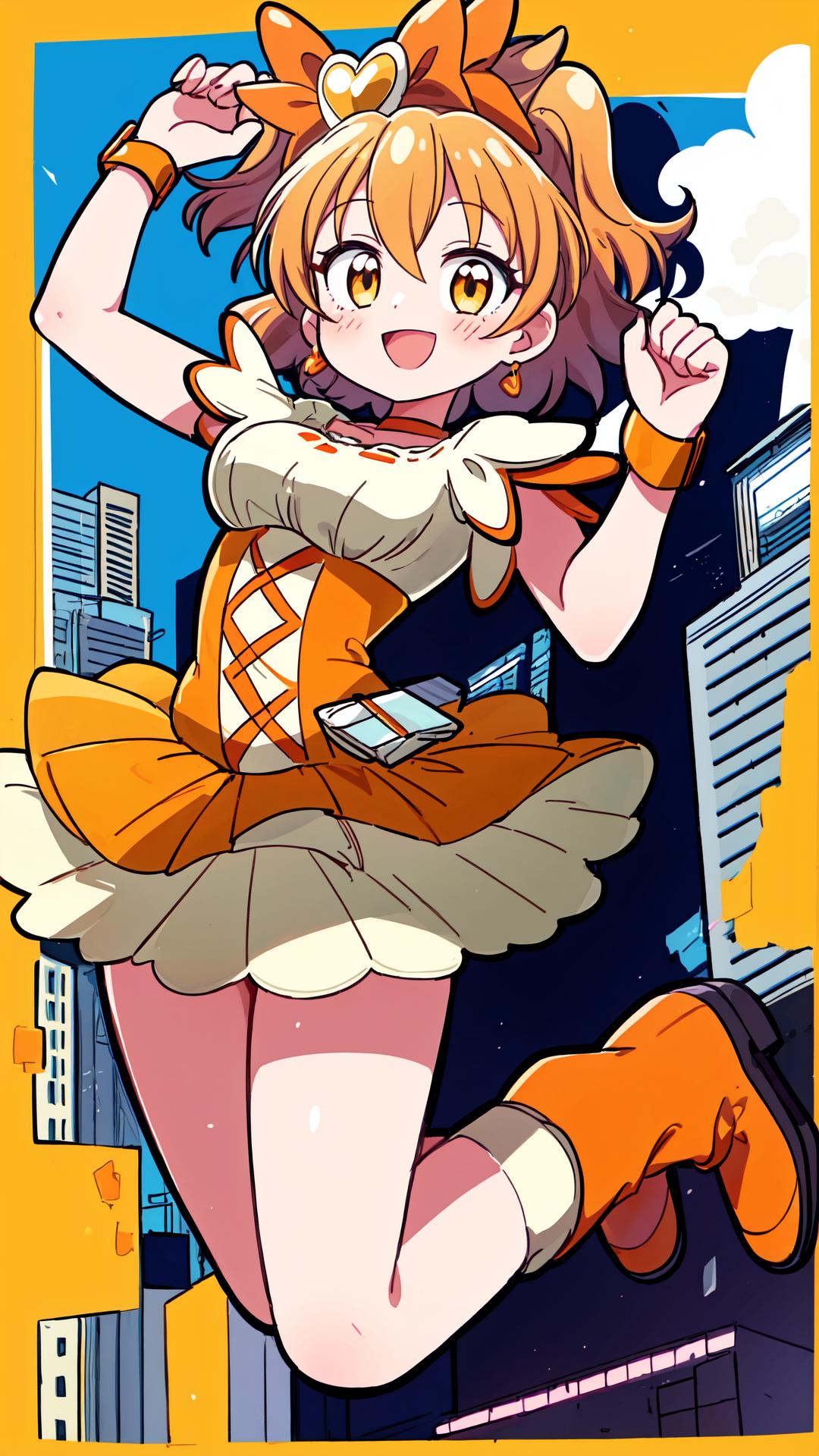 precure, one side up, short hair, hair ribbon, frills, short sleeves, wrist cuffs, orange choker, orange boots, yellow skirt,