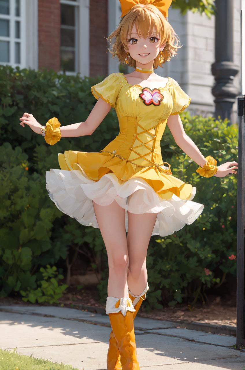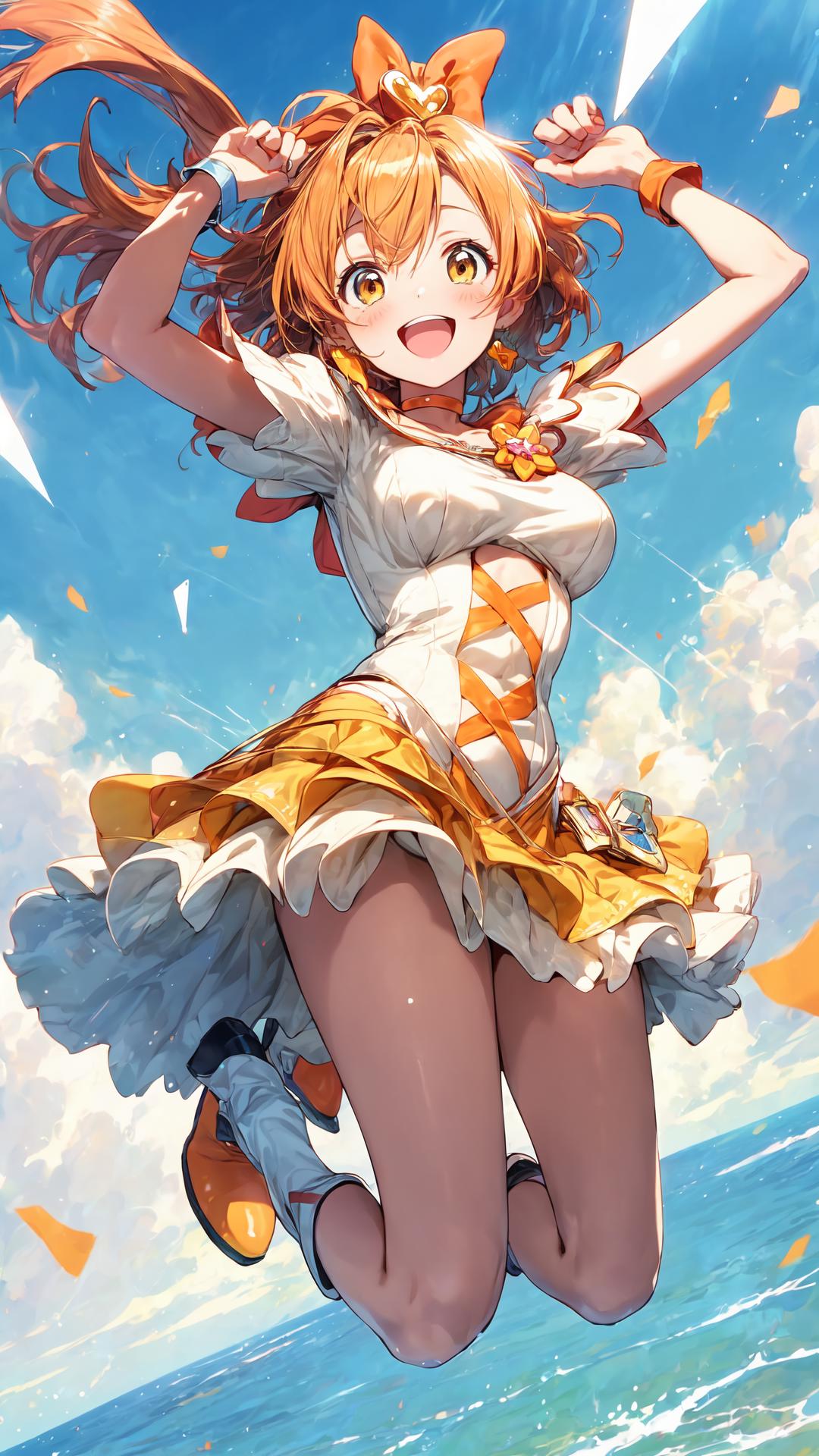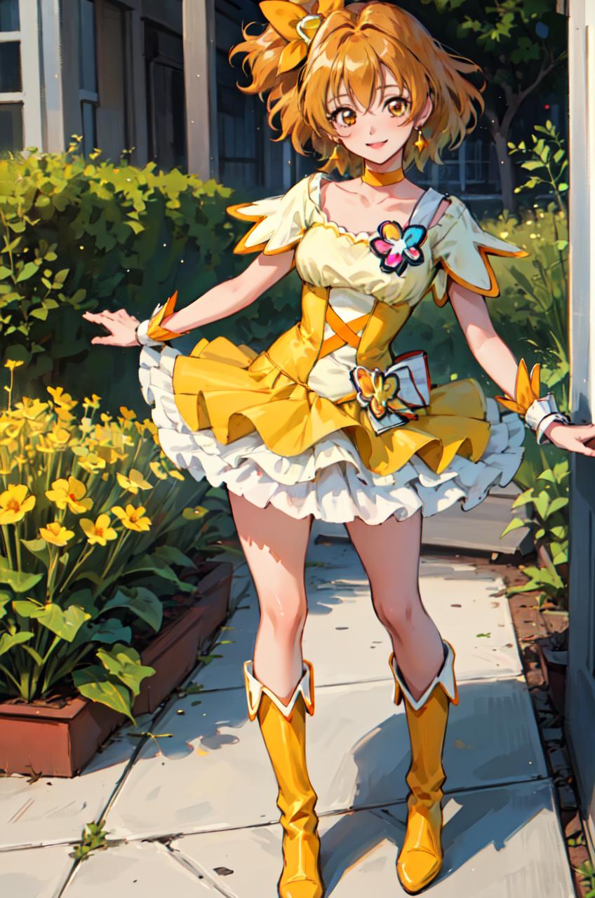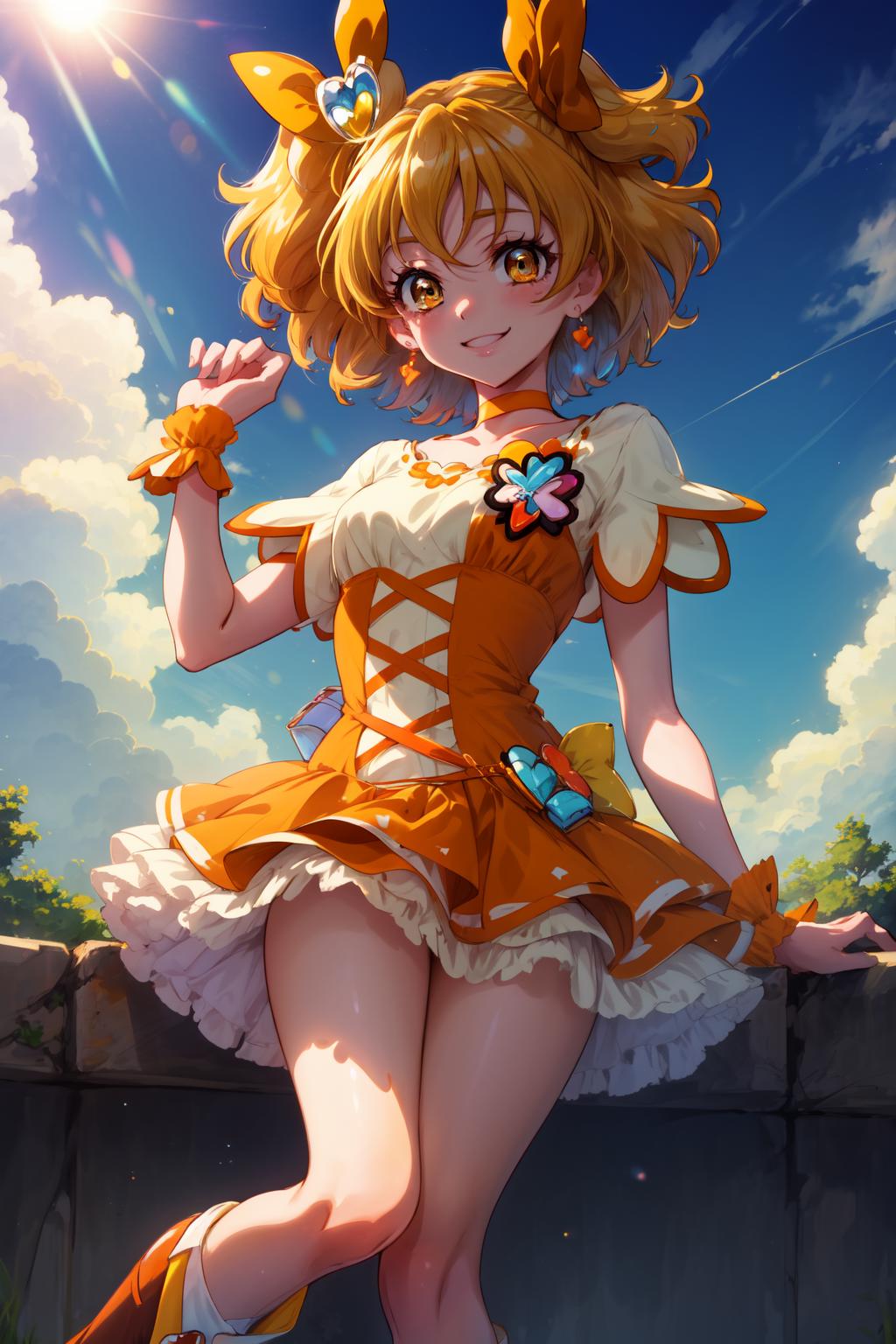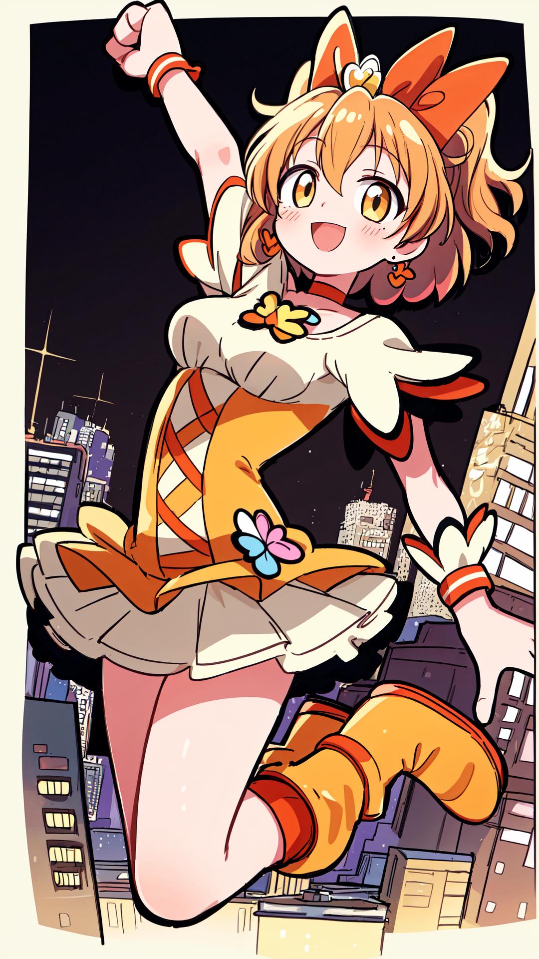 precure, one side up, short hair, hair ribbon, frills, short sleeves, wrist cuffs, orange choker, orange boots, yellow skirt,