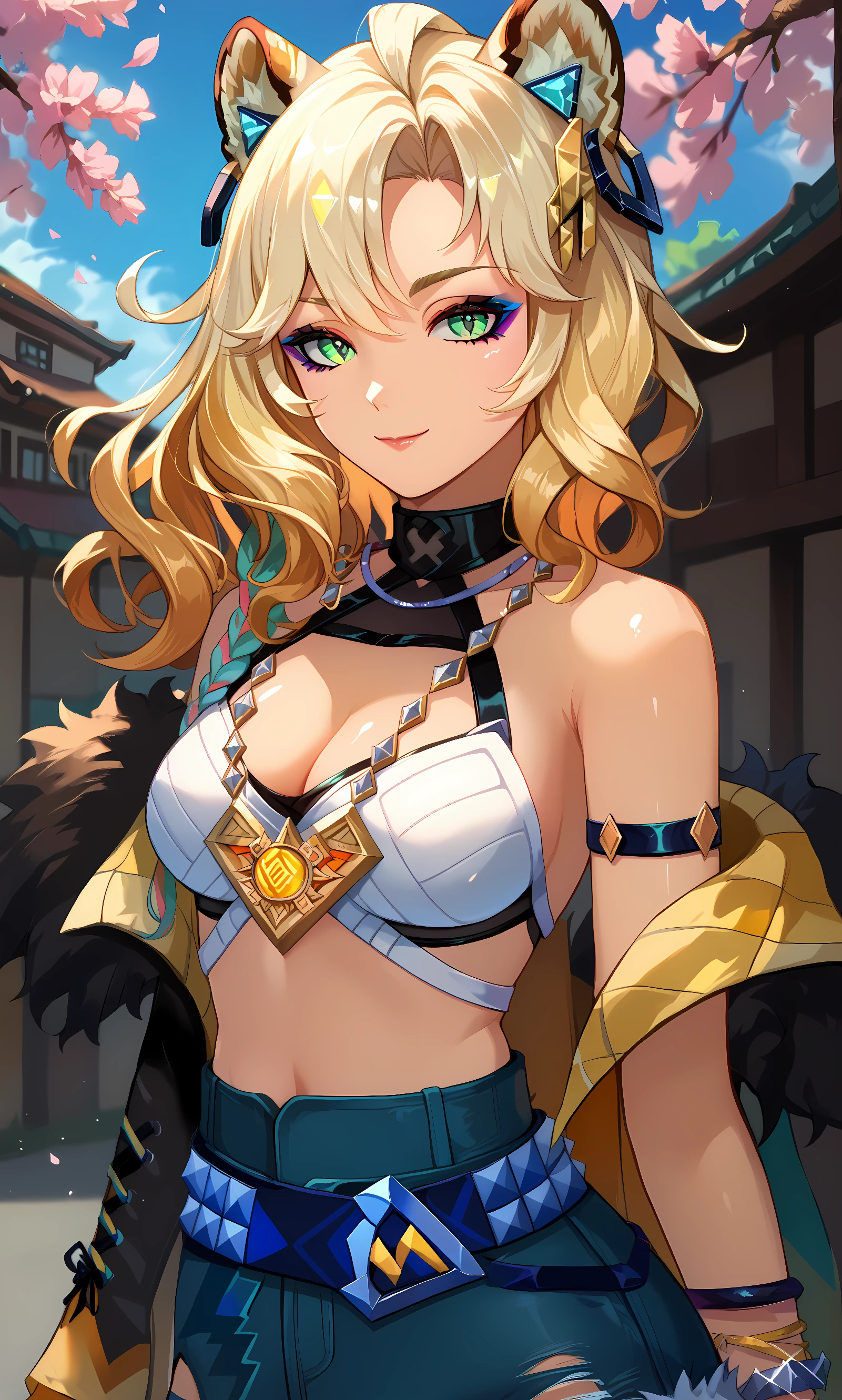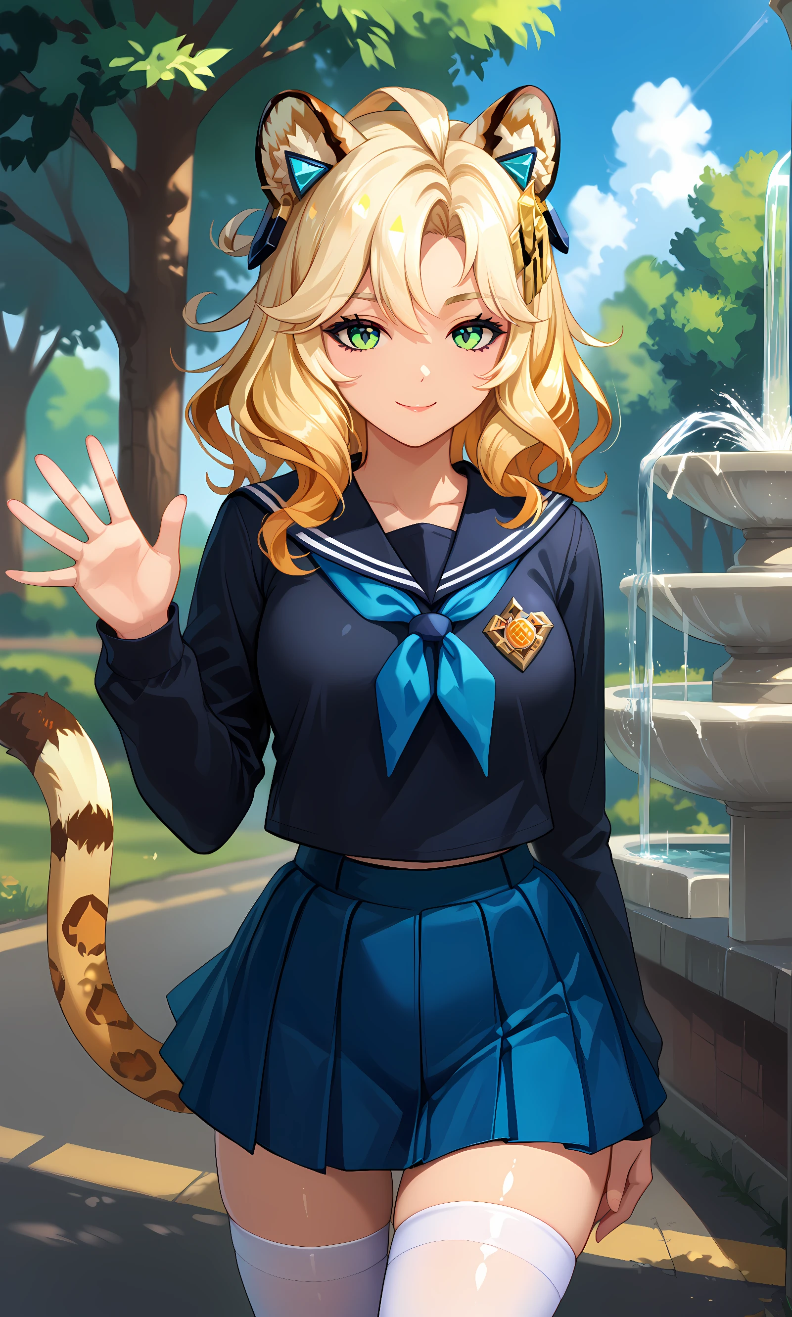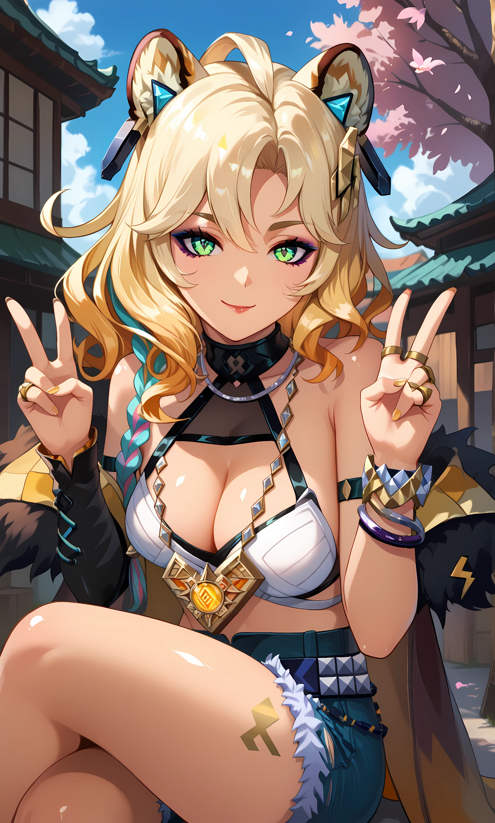 xilonen, green eyes, blonde hair, wavy hair, ahoge, multicolored hair, side braid, jaguar ears, jaguar tail, earrings