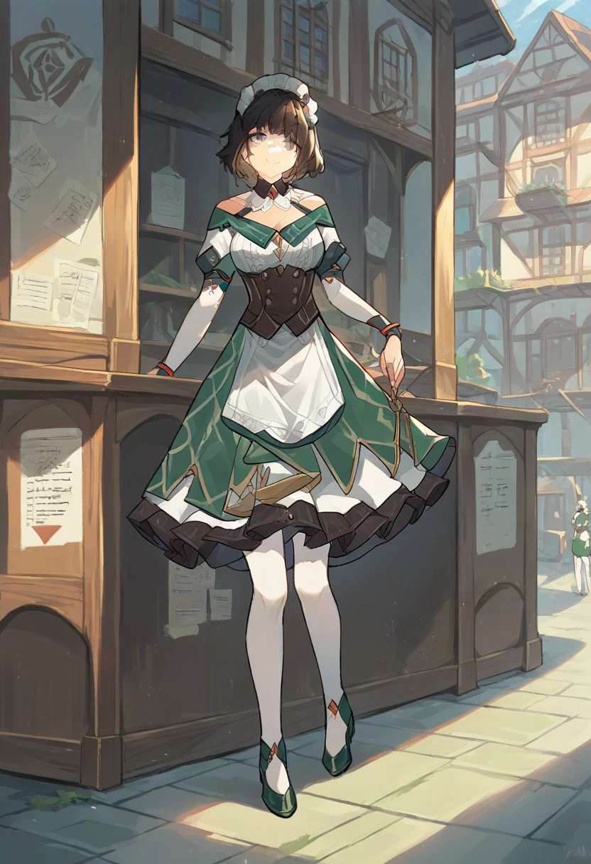 1girl, katheryne_genshin_impact, short hair, black hair, grey eyes, maid headdress, perfect face, perfect eyes,