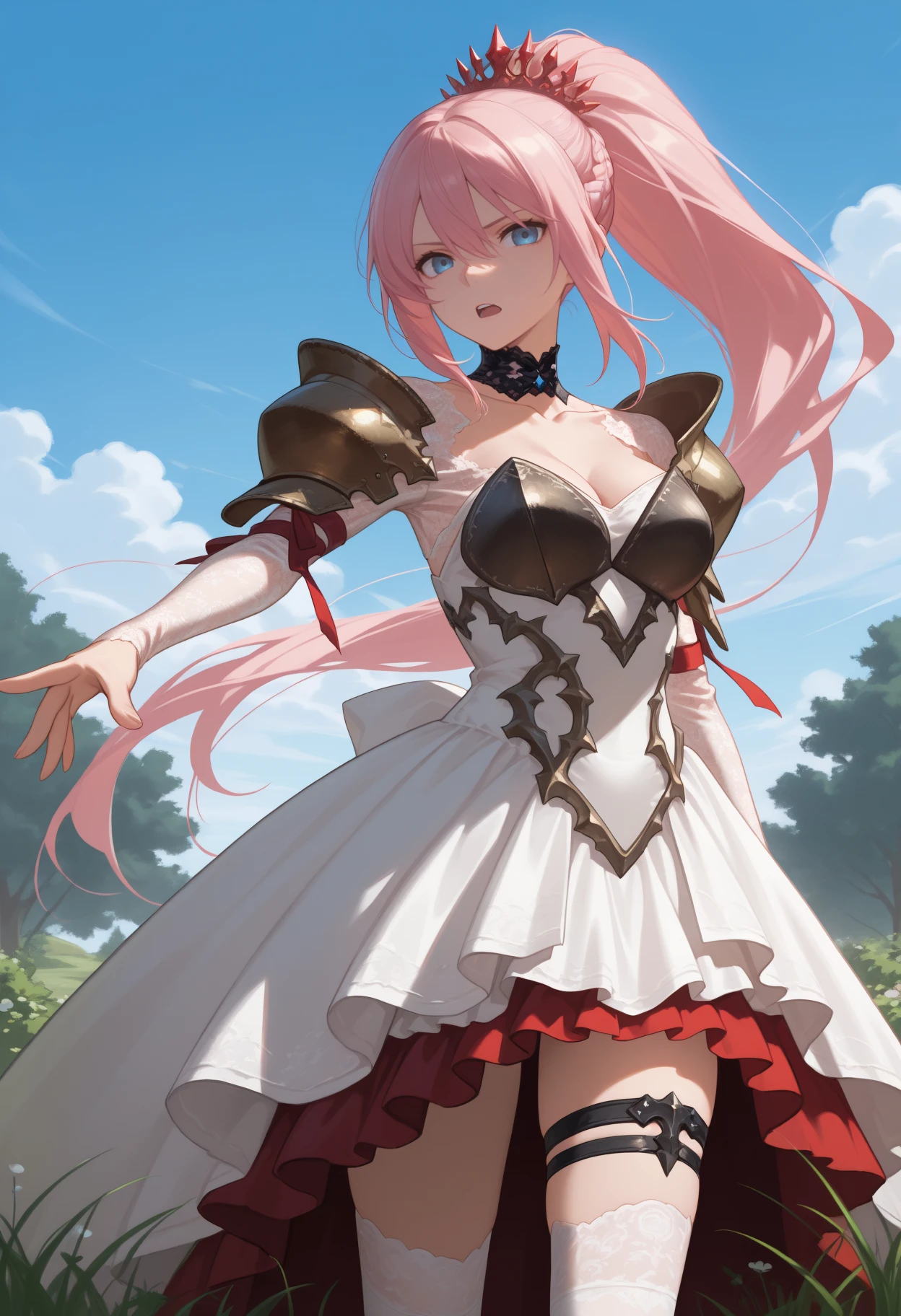 tiara, lace, black collar, layered dress, white dress, red dress, shoulder armor, pauldrons, breastplate, long sleeves, white thighhighs, thigh strap, collarbone, cleavage