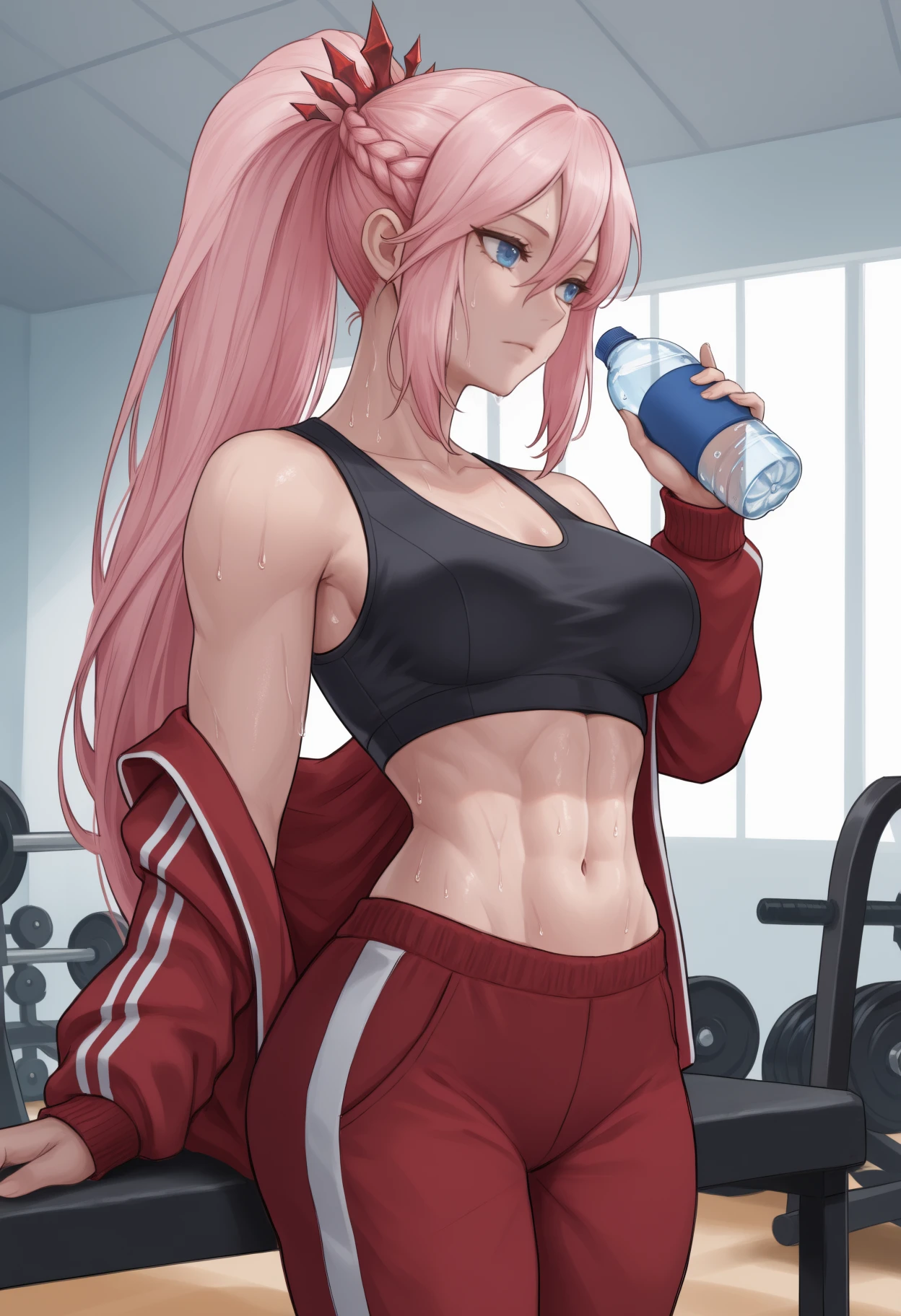 Trigger + Appearance: shi0nne, pink hair, hair between eyes, sidelocks, ponytail, braid, blue eyes