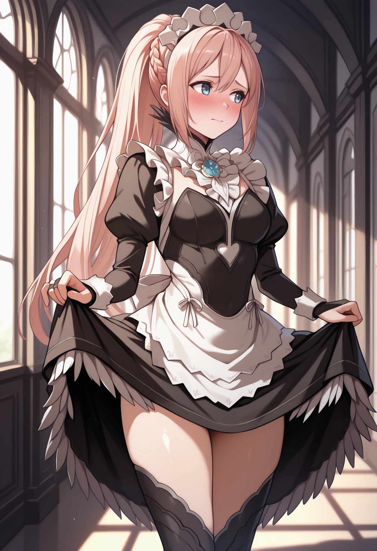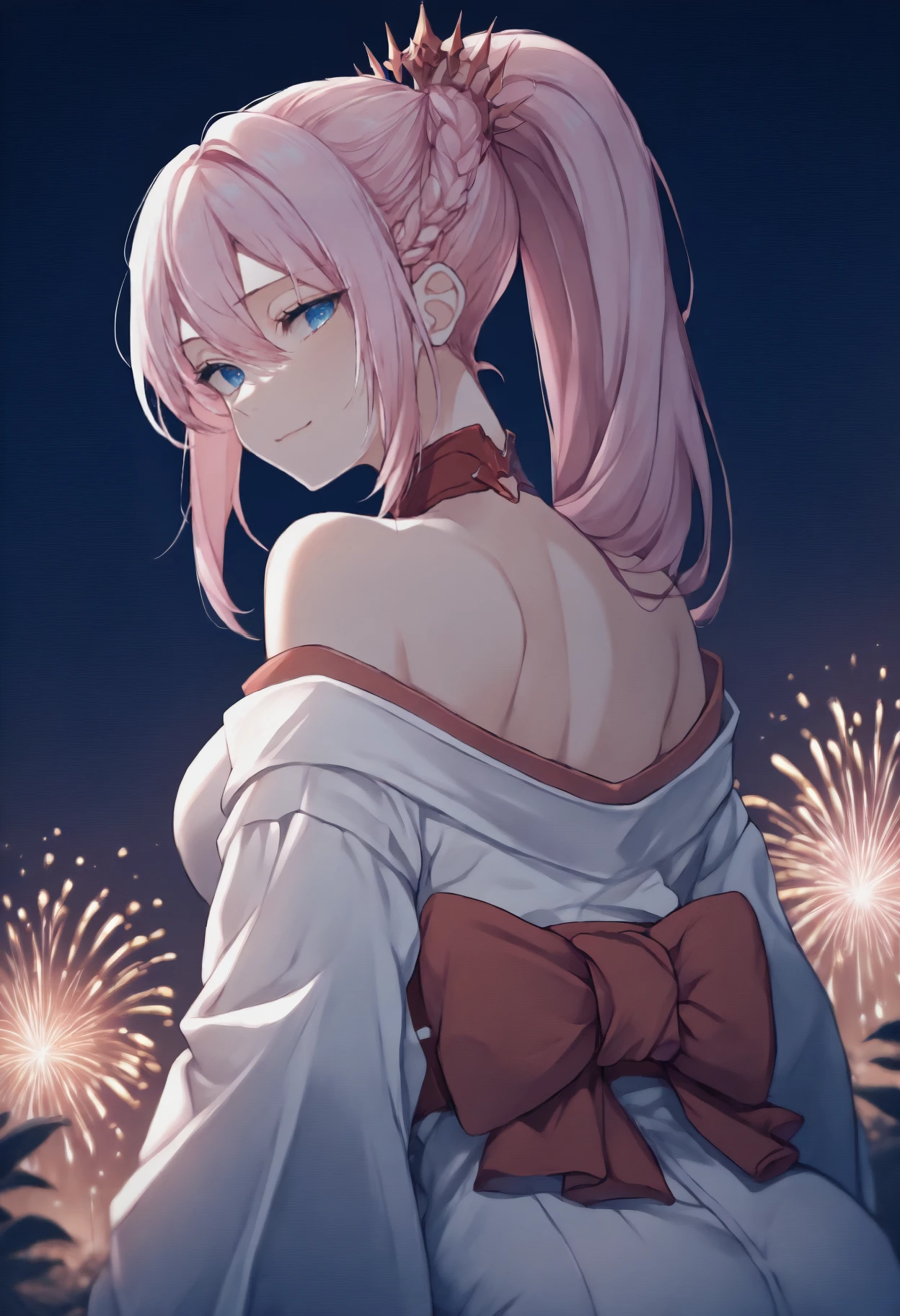shi0nne, pink hair, hair between eyes, sidelocks, ponytail, braid, blue eyes