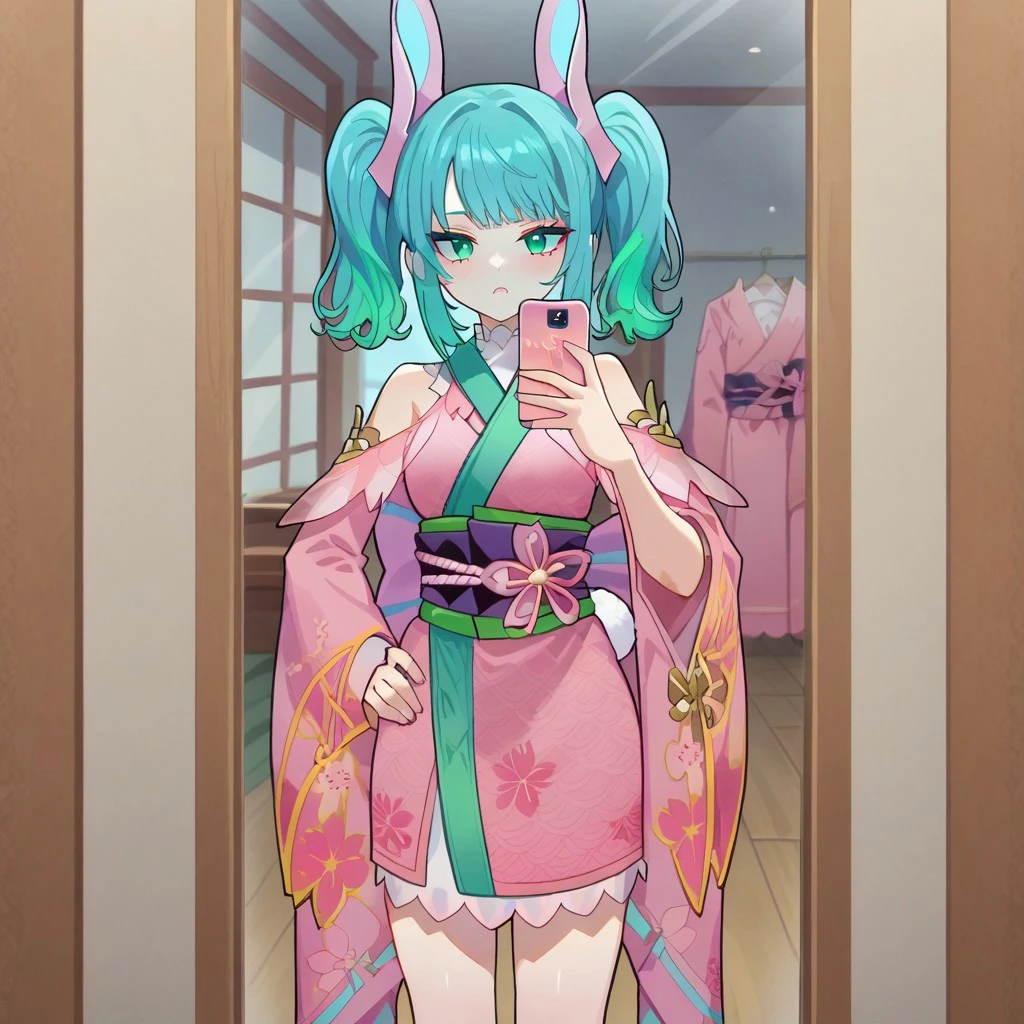 capkmn, green eyes, aqua hair, green hair, twintails, medium hair, rabbit tail, pink hair ornament, back bow, japanese clothes, pink kimono, short kimono, obi, detached sleeves, bare shoulders, wide sleeves, long sleeves, platform footwear, white socks,