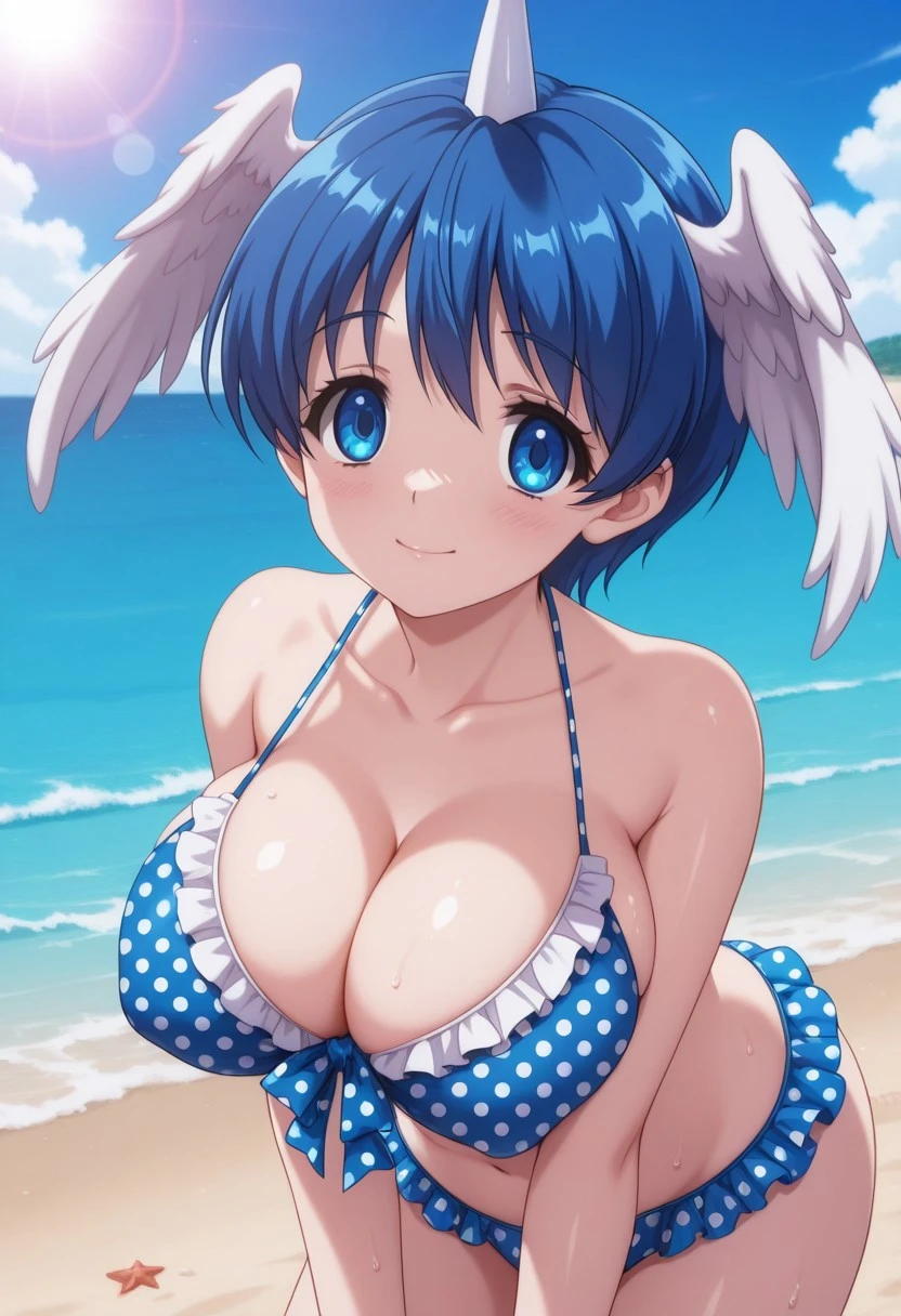 Unico, 1girl, solo, blue eyes, blue hair, single white horn, head wings, big breasts, uncensored,