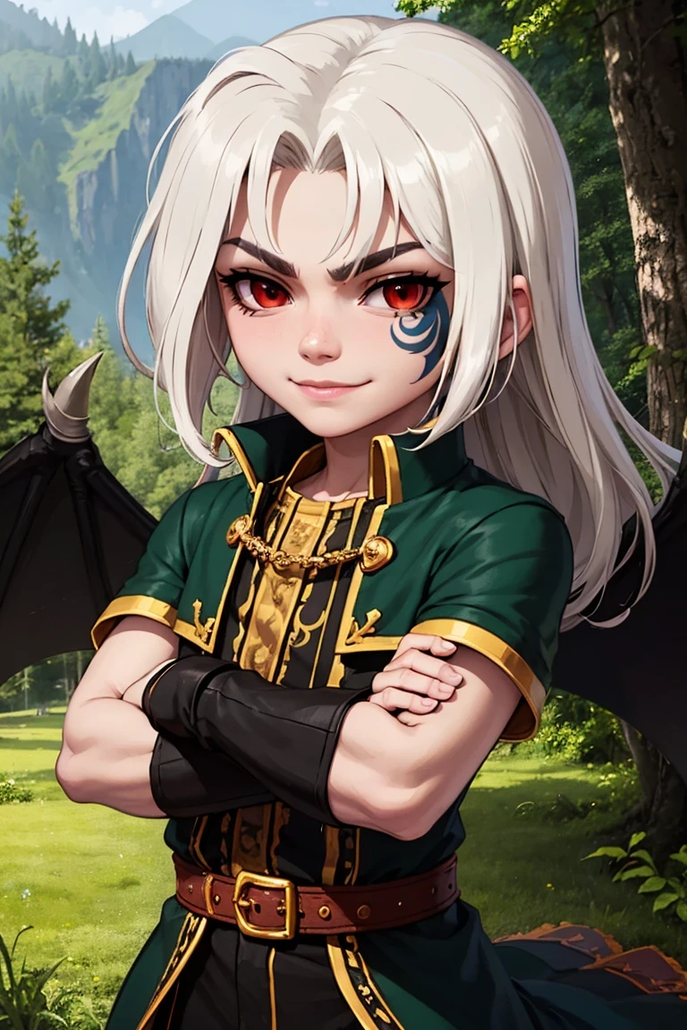 demonavenger, 1boy, facial mark, long hair, red eyes, gloves, white hair, male focus, wings, fingerless gloves, chibi, tattoo, colored skin
