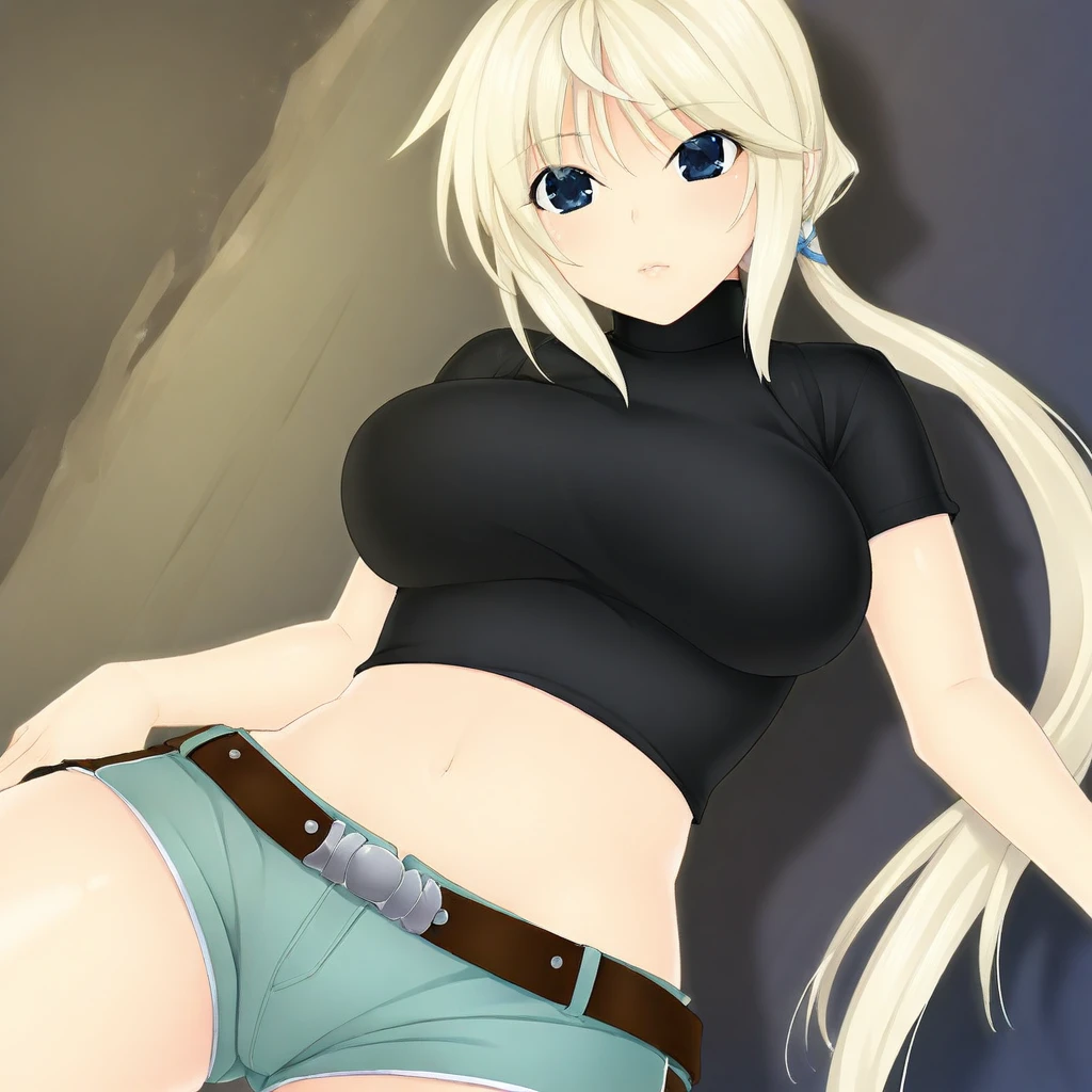 kanon-casual, turtleneck, crop top, short sleeves, midriff, short shorts, belt,