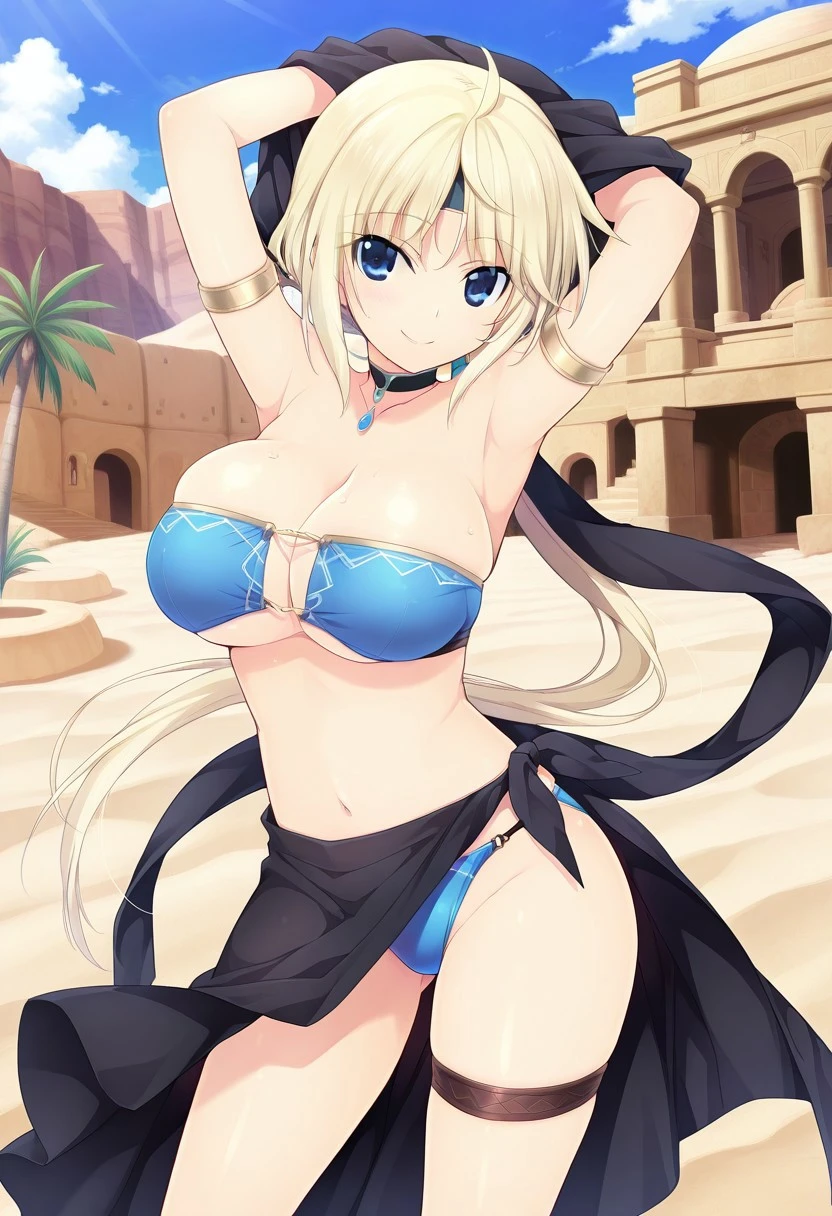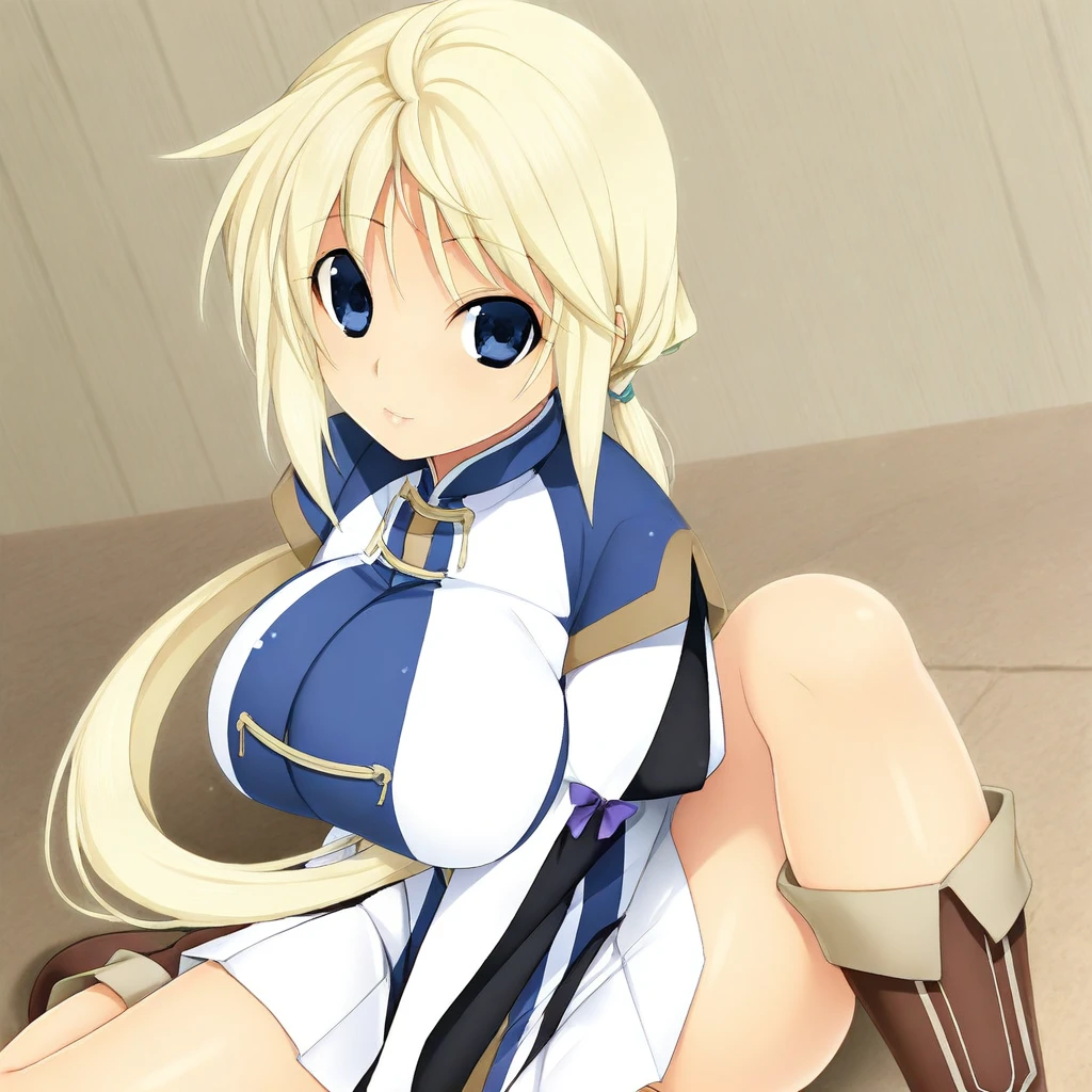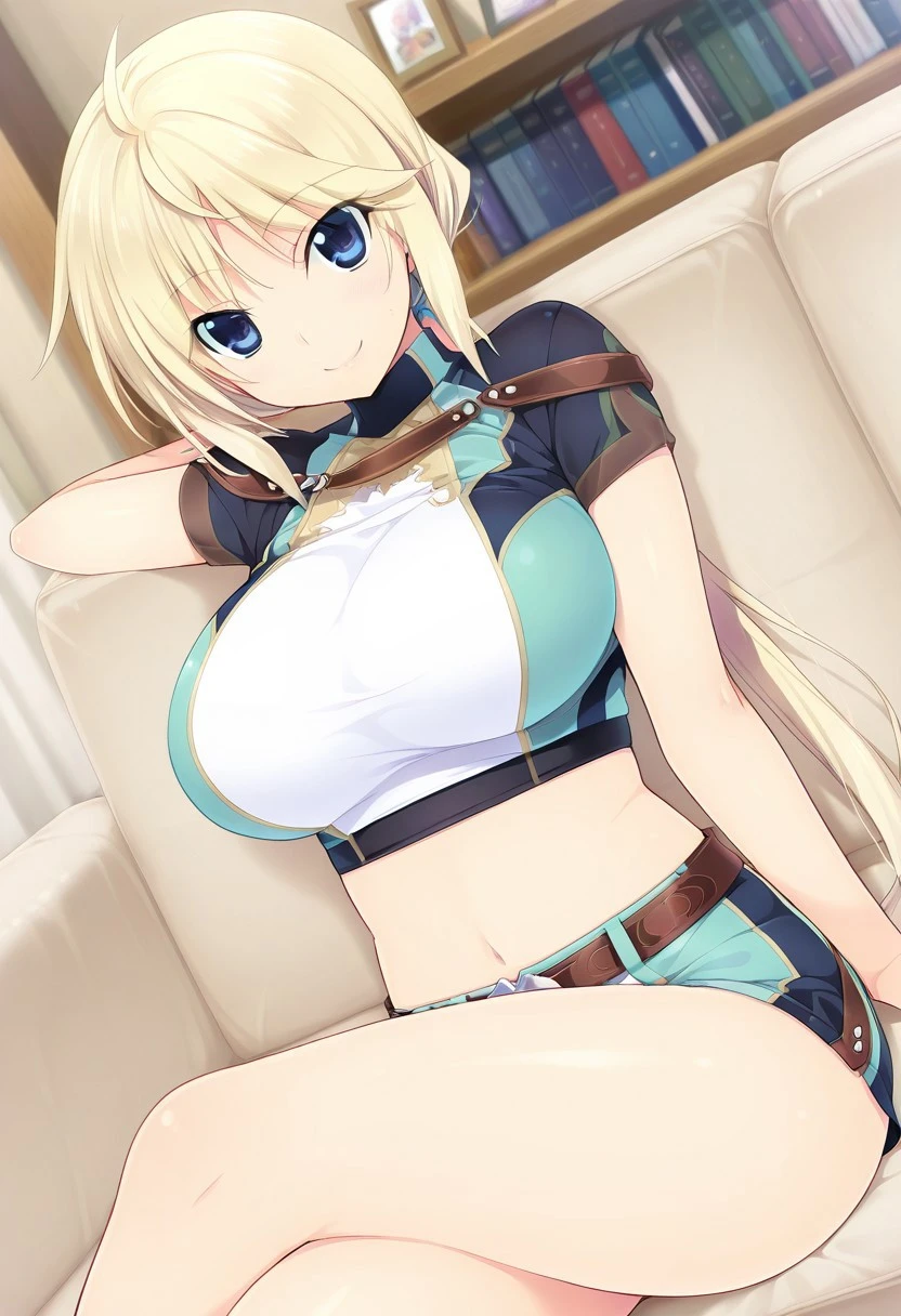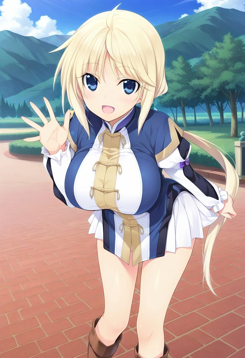 blond hair, long hair, bangs, hair between eyes, side locks, low ponytail, blue eyes, large breasts,