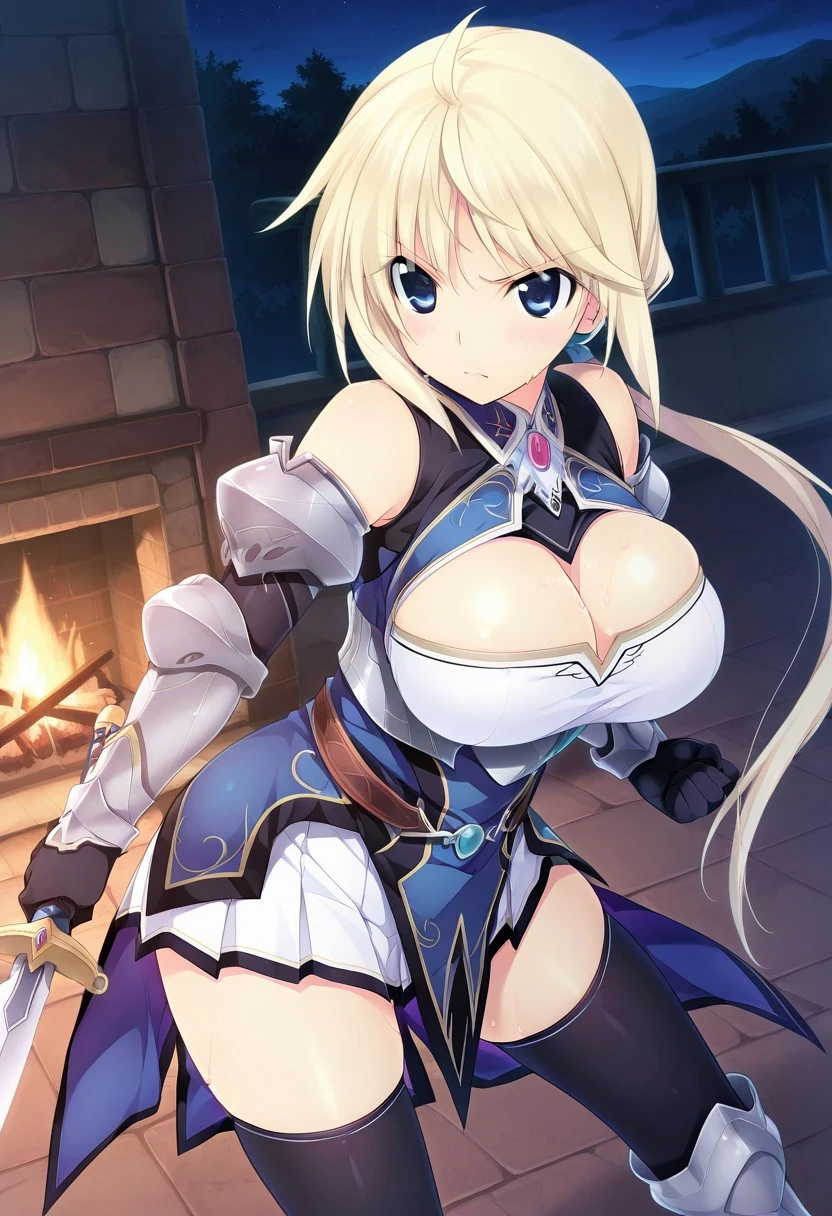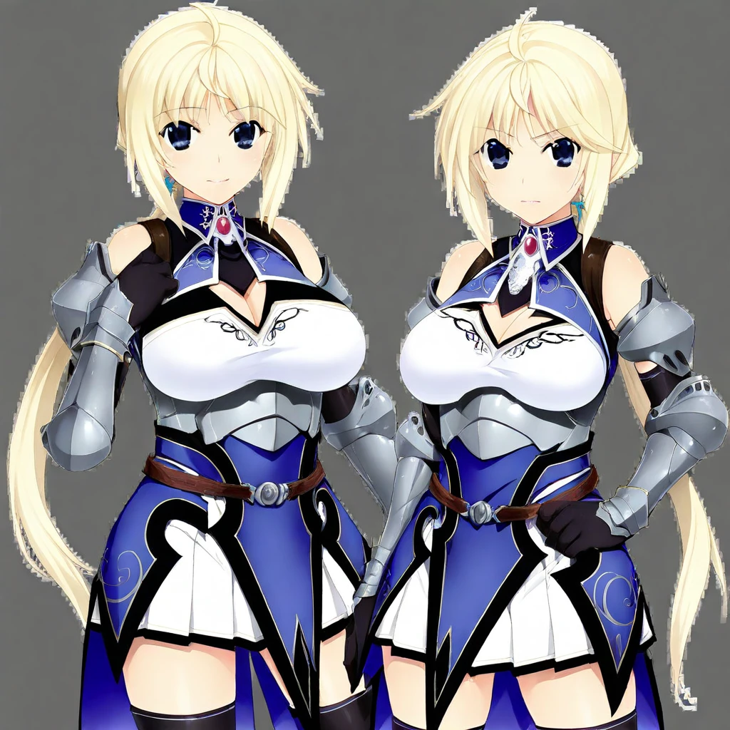 kanon-combat, collar, cleavage cutout, black elbow gloves, armor, vambraces, white pleated skirt, black thighhighs, armored boots,
