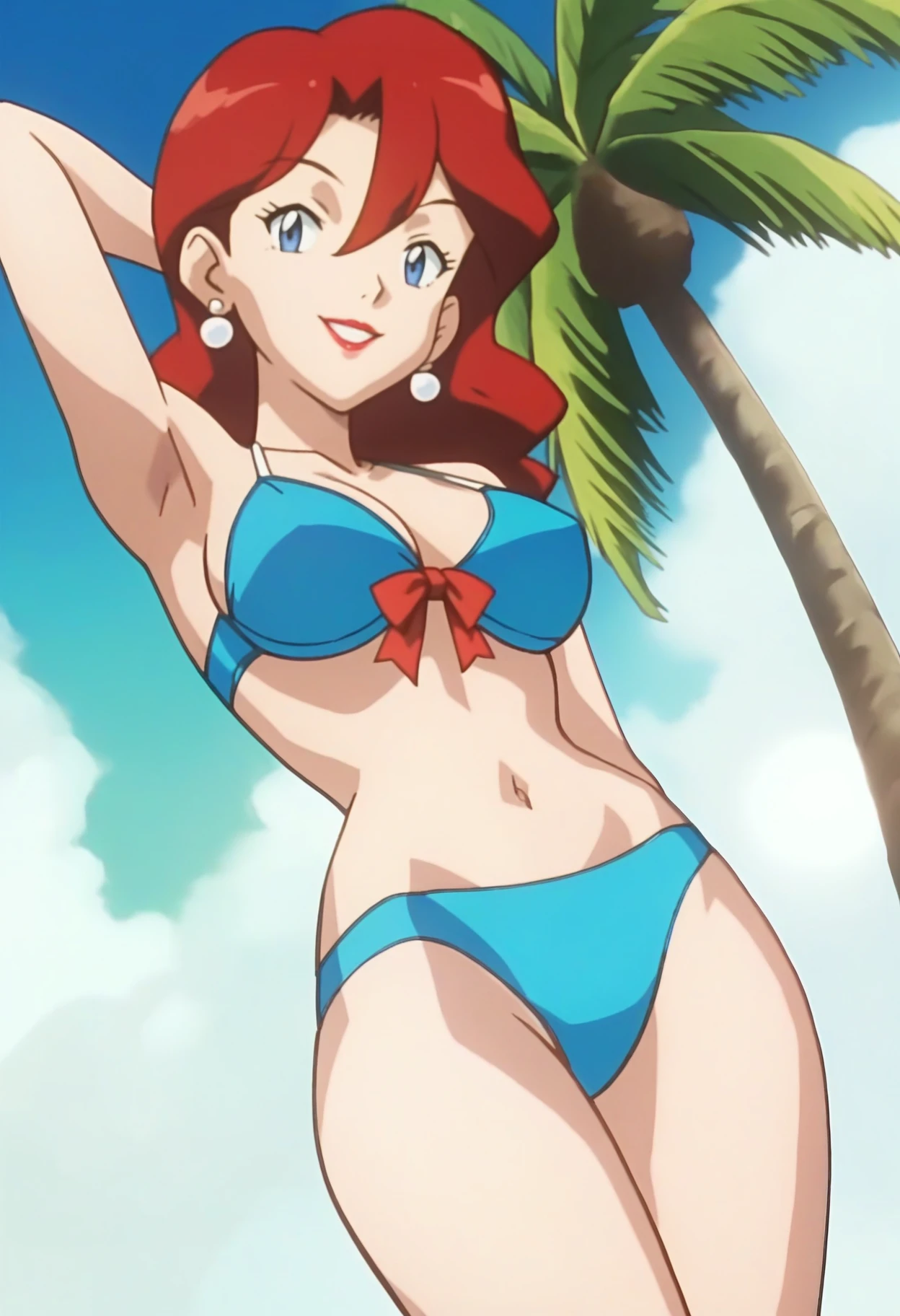 PMGC2, red hair, hair between eyes, blue eyes, white earrings, lipstick, light blue bikini, red ribbon, navel,
