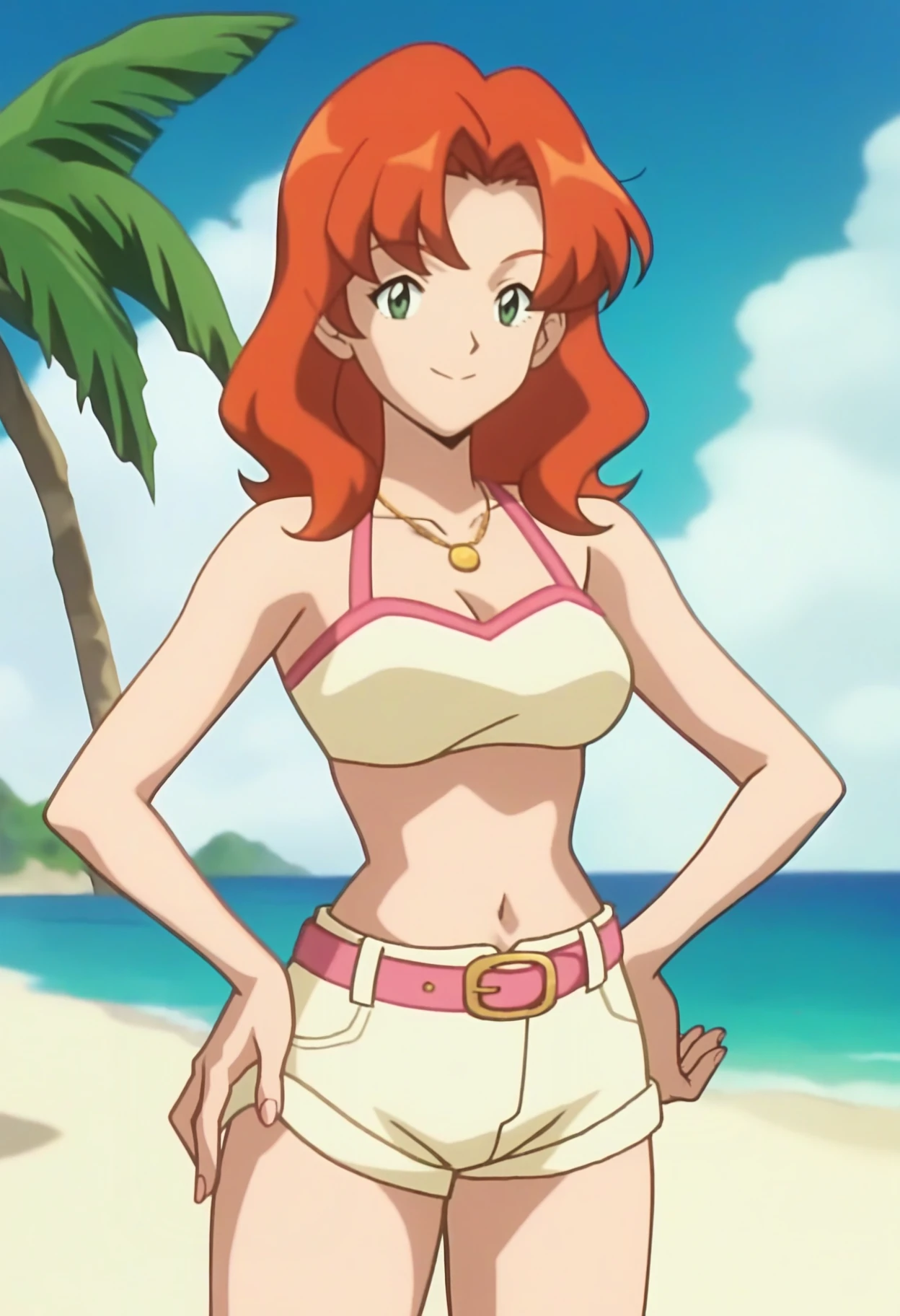 PMGC1, orange hair, bangs, medium hair, green eyes, aged up, gold necklace, crop top, navel, midriff, pink belt, shorts,