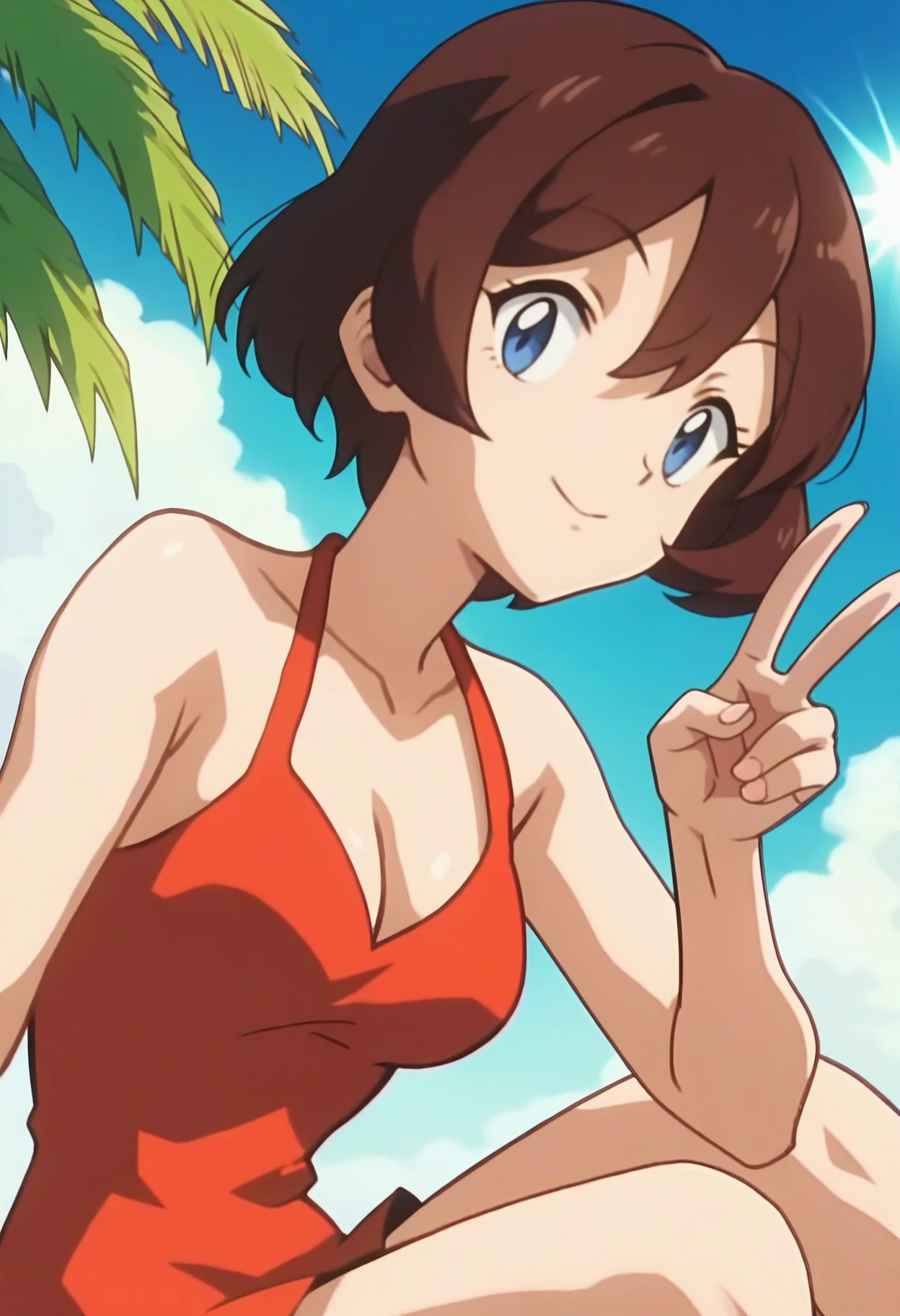 PMGC6, brown hair, short hair, hair between eyes, blue eyes, red dress, short dress, cleavage, bare shoulders,