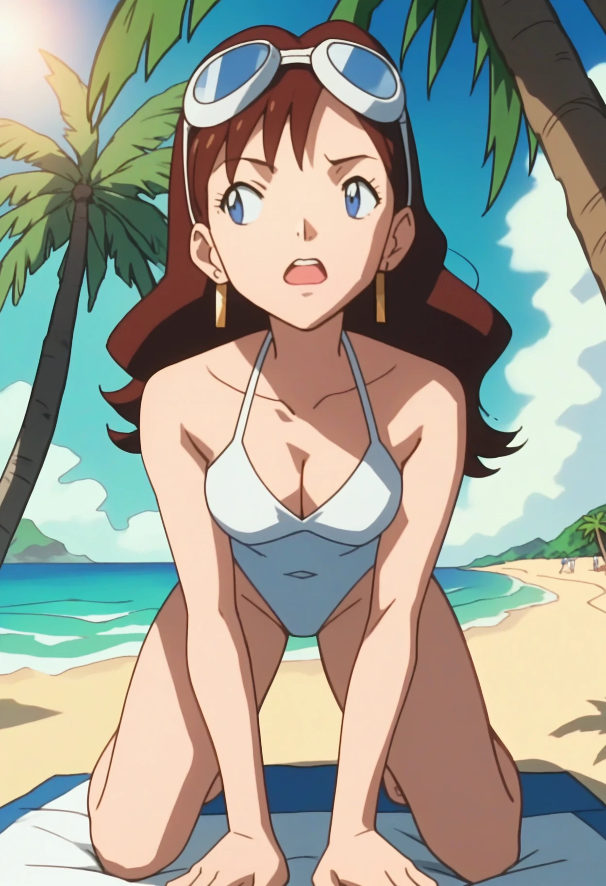 PMGC5, brown hair, long hair, blue eyes, gold earrings, goggles on head, white leotard, cleavage,