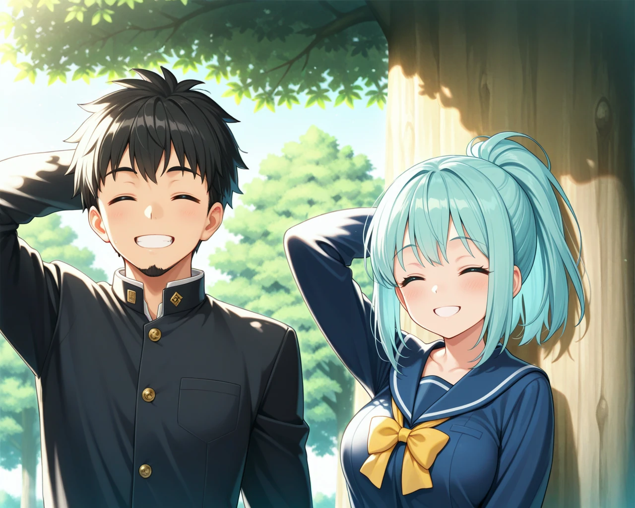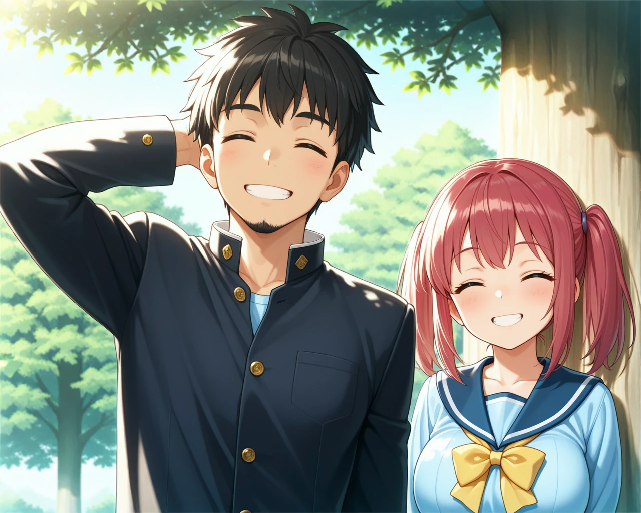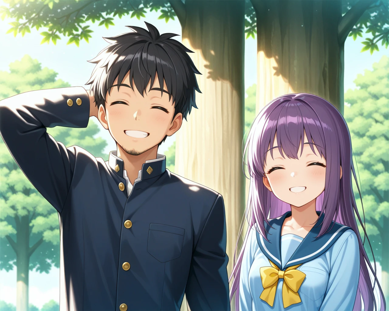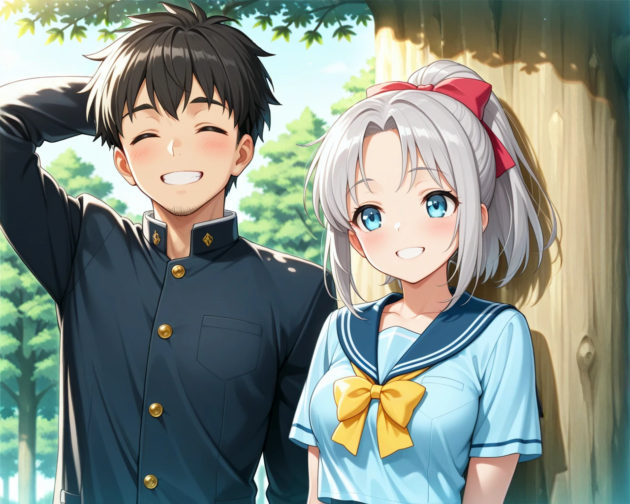 LoRA01: A shy boy (on the left of the screen) with his hand behind his head, and a girl, with the legendary tree (large tree) in the right-side background.