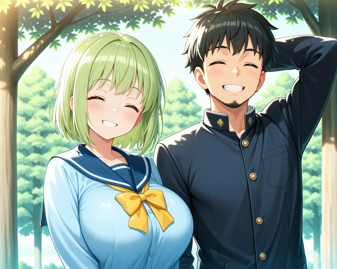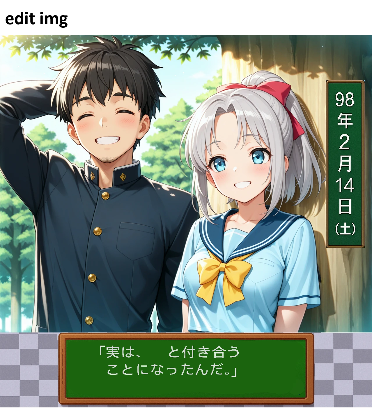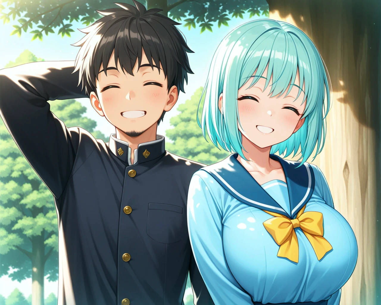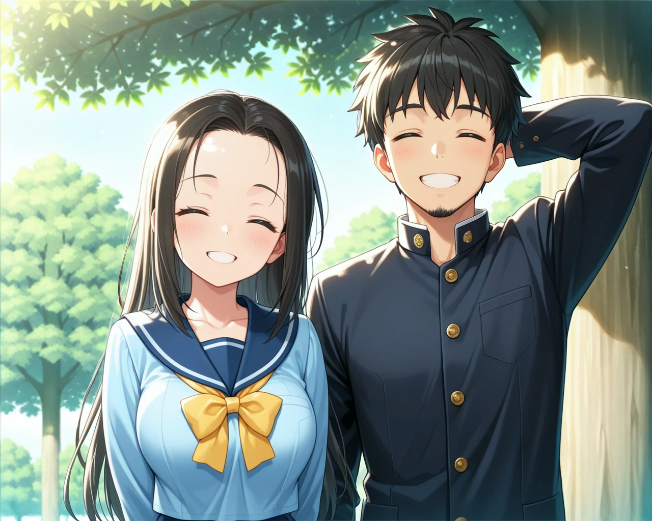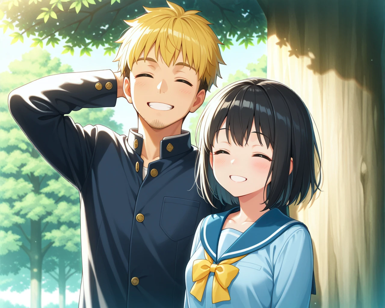 LoRA01: A shy boy (on the left of the screen) with his hand behind his head, and a girl, with the legendary tree (large tree) in the right-side background.