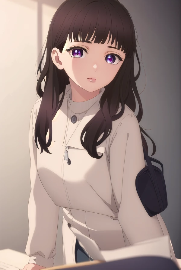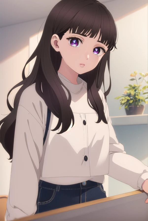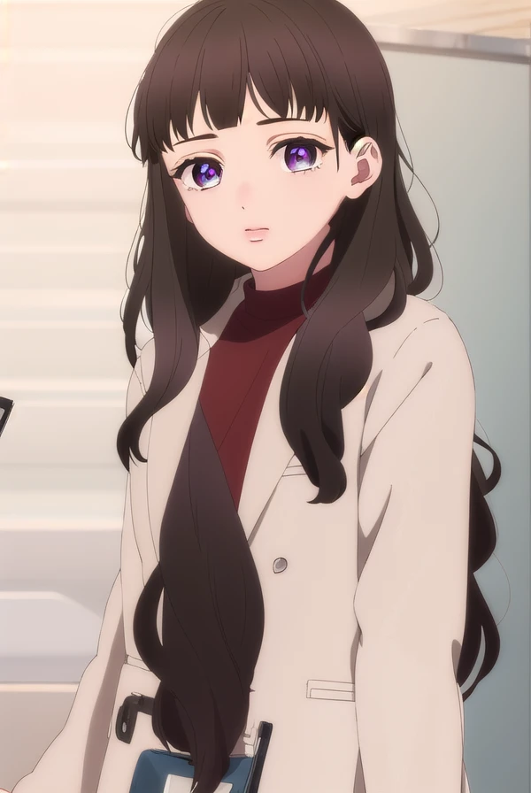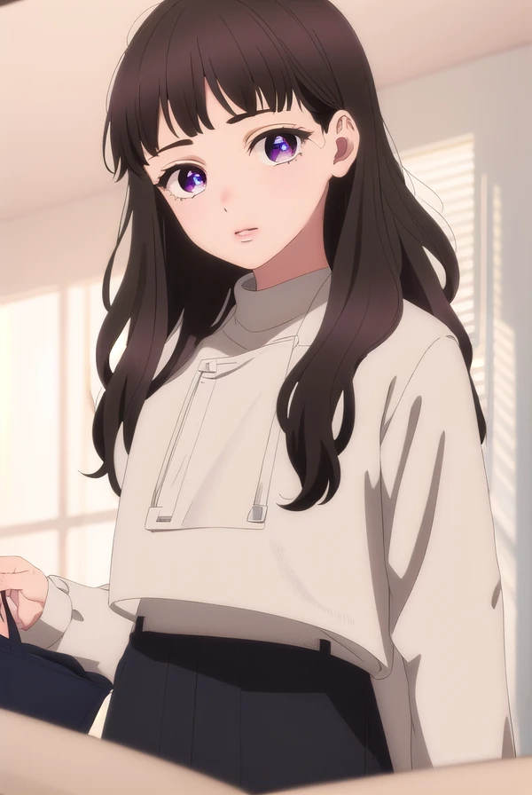 emma nakazono, long hair, bangs, brown hair, black hair, (purple eyes:1.1), blunt bangs, wavy hair,