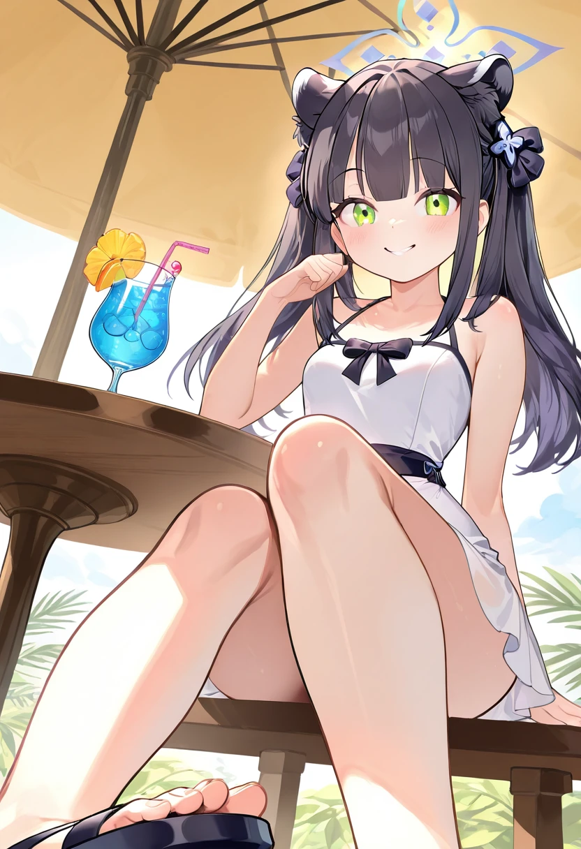 zzShun, green eyes, black hair, blunt bangs, long hair, animal ears, tiger ears, halo, animal ear fluff, twintails, tiger girl, extra ears, black dress, black footwear, china dress, shoes, short sleeves, white thighhighs,