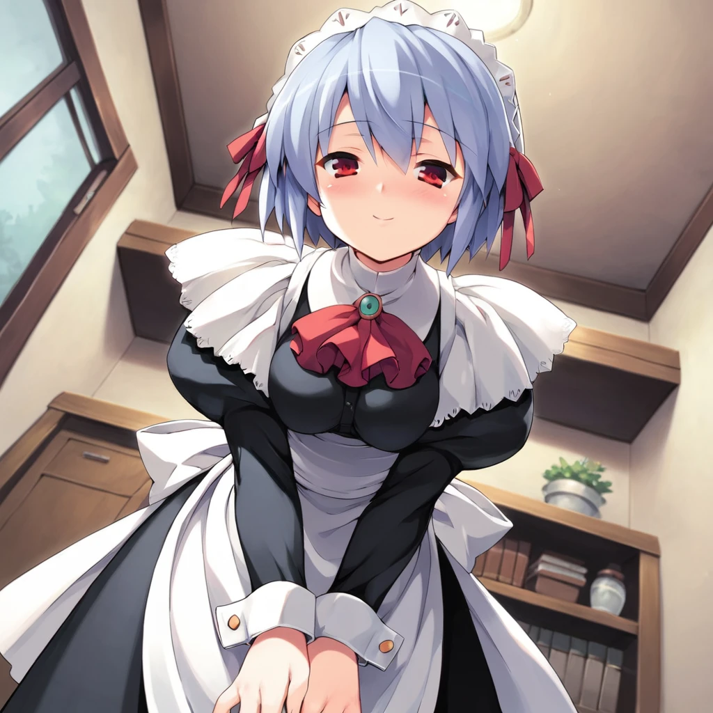 yuki, blue hair, short hair, red eyes, maid headdress, hair ribbon,