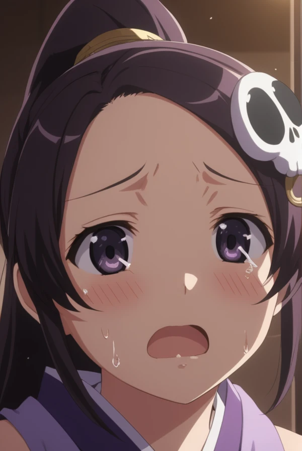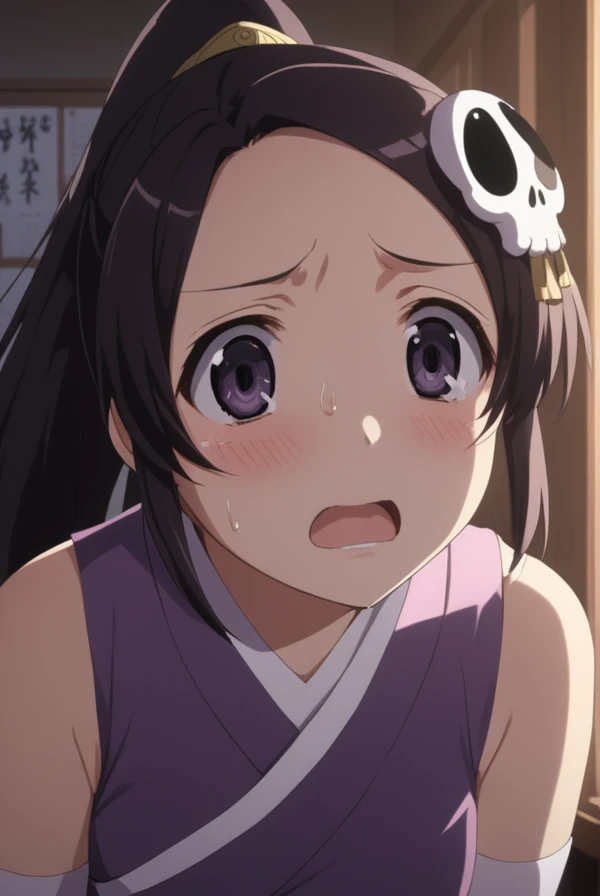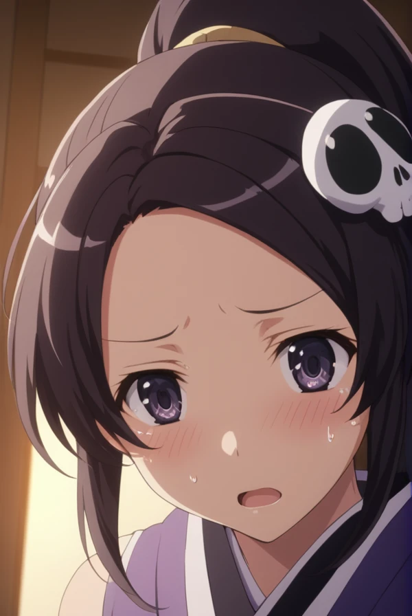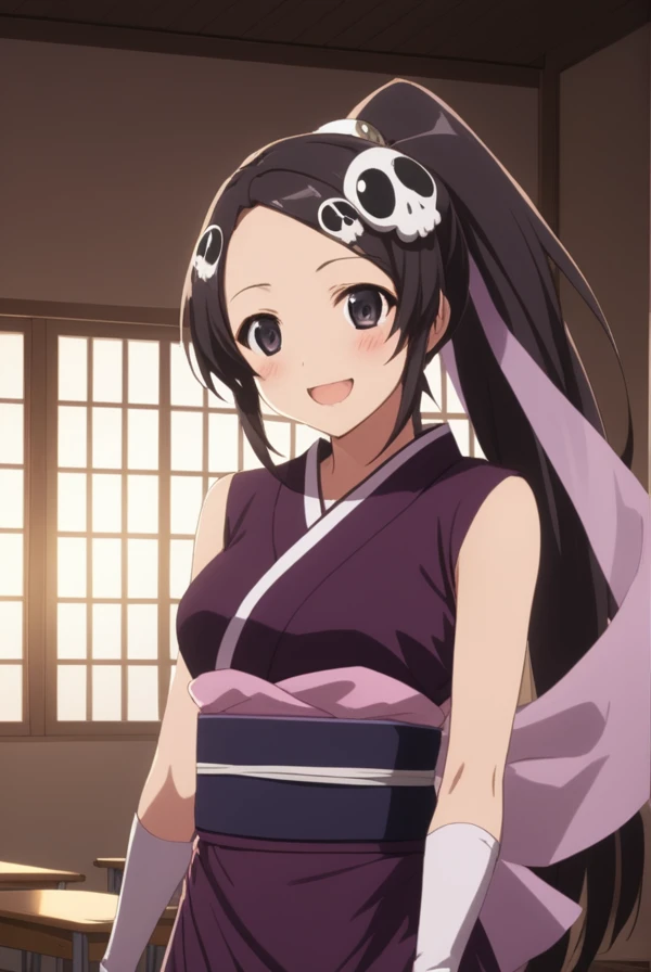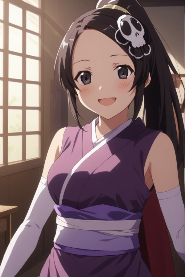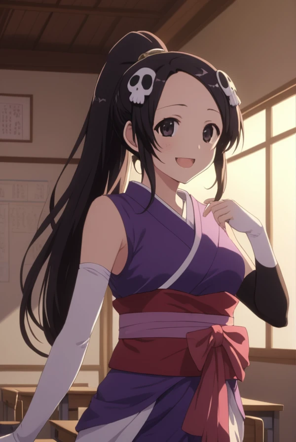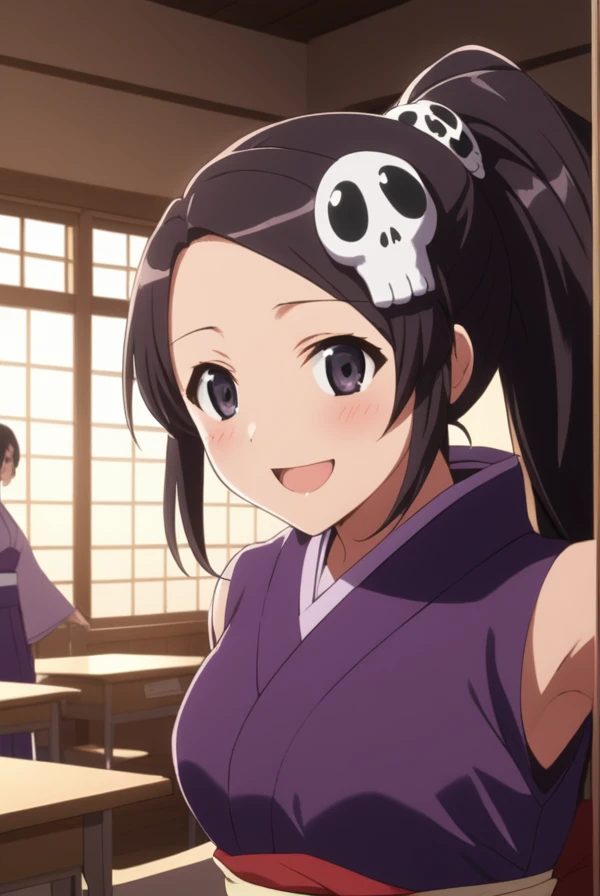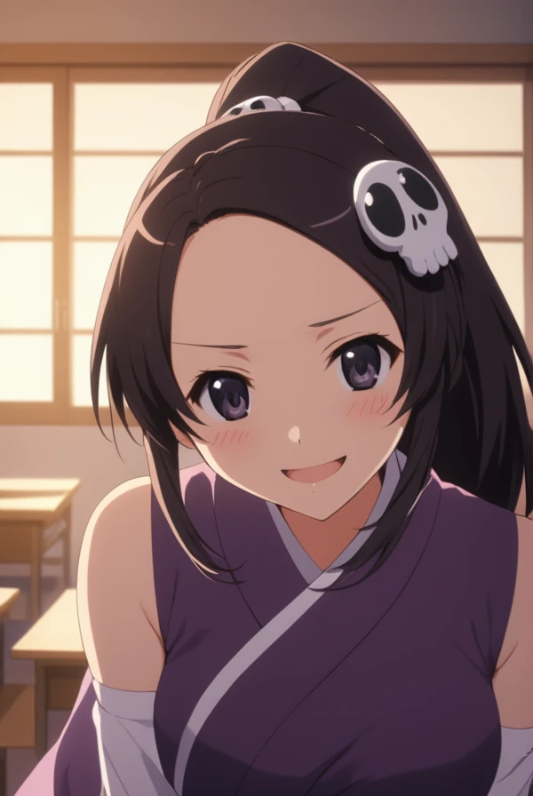 elucia de lute ima, forehead, black hair, black eyes, hair ornament, skull hair ornament, ponytail, smile,