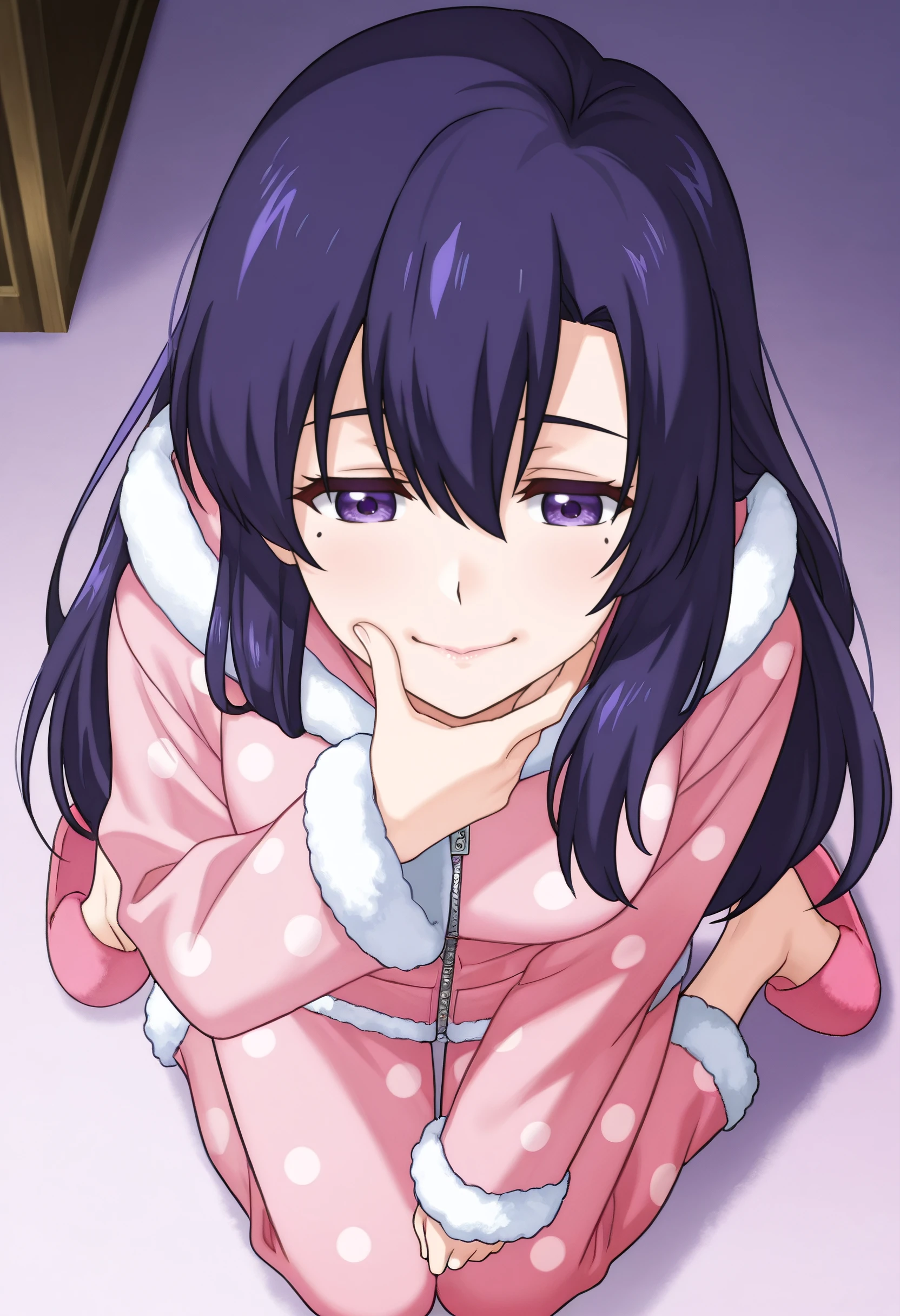 RebeccaPajama, pajamas, hood, polka dot pajamas, long sleeves, polka dot, pink pajamas, fur trim, pink coat, fur-trimmed sleeves, hoodie, sleepwear, slippers, polka dot dress, hood down, pink pants, pink footwear, pants, zipper, zipper pull tab, hair down,