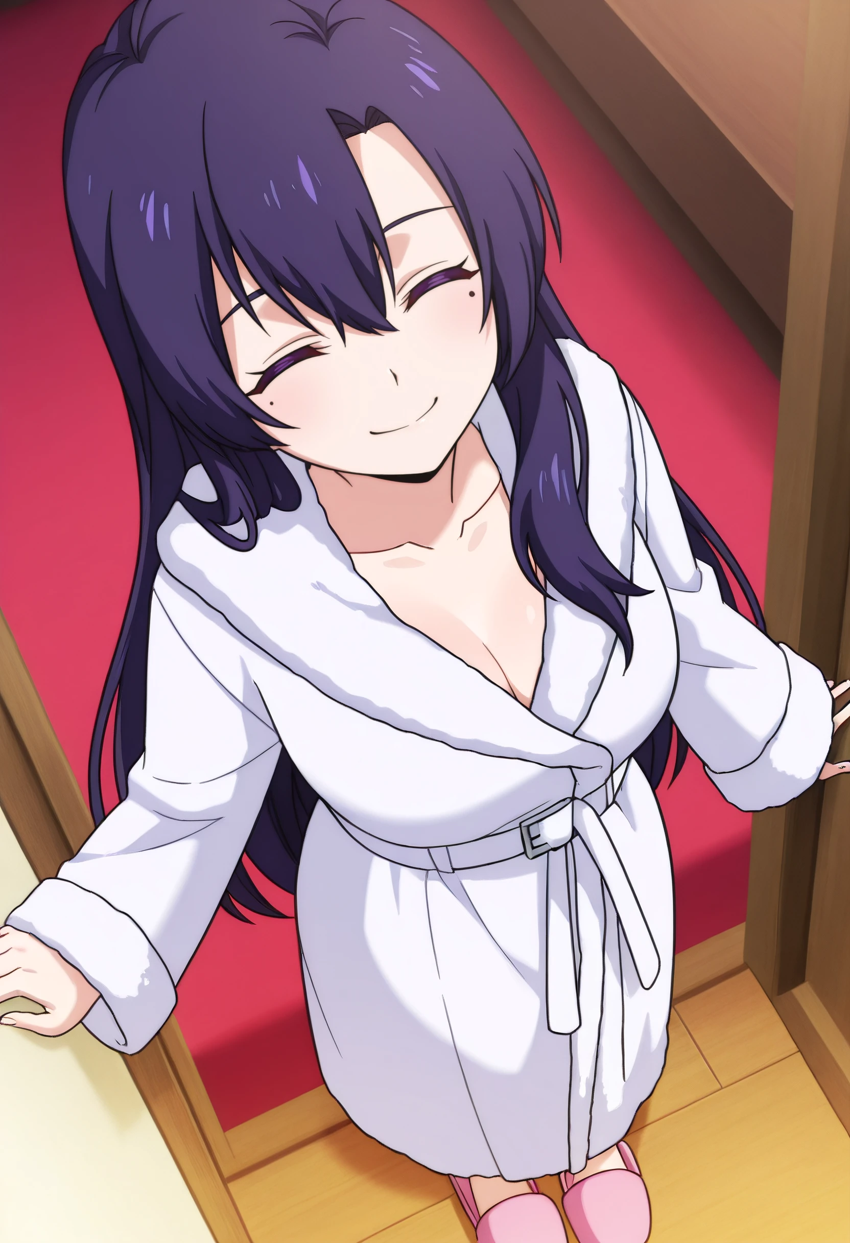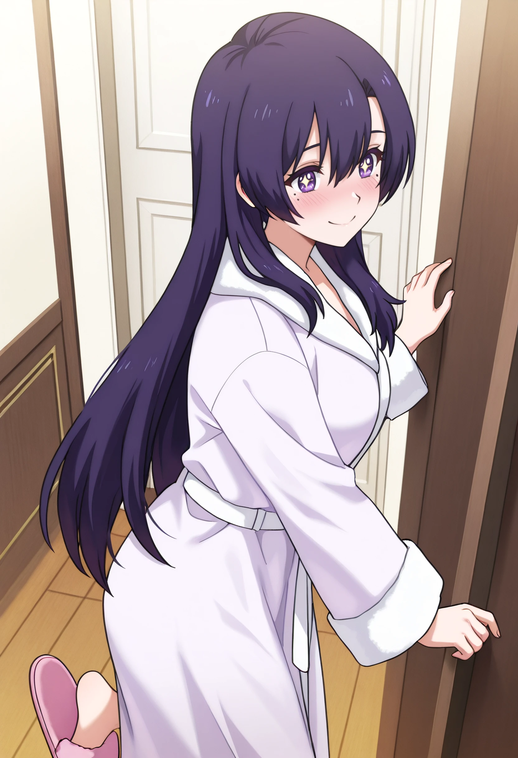 RebeccaRobe, long sleeves, slippers, bathrobe, robe, shoes, pink footwear, white belt, belt, nightgown,