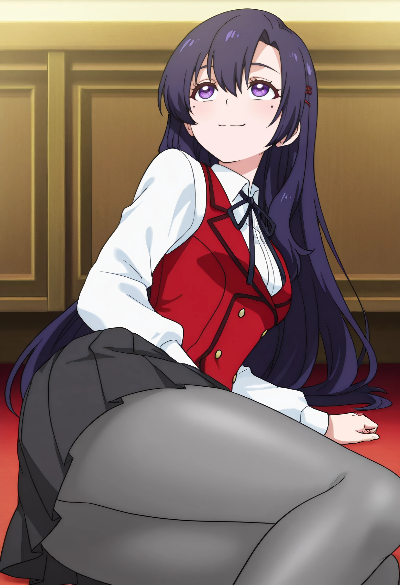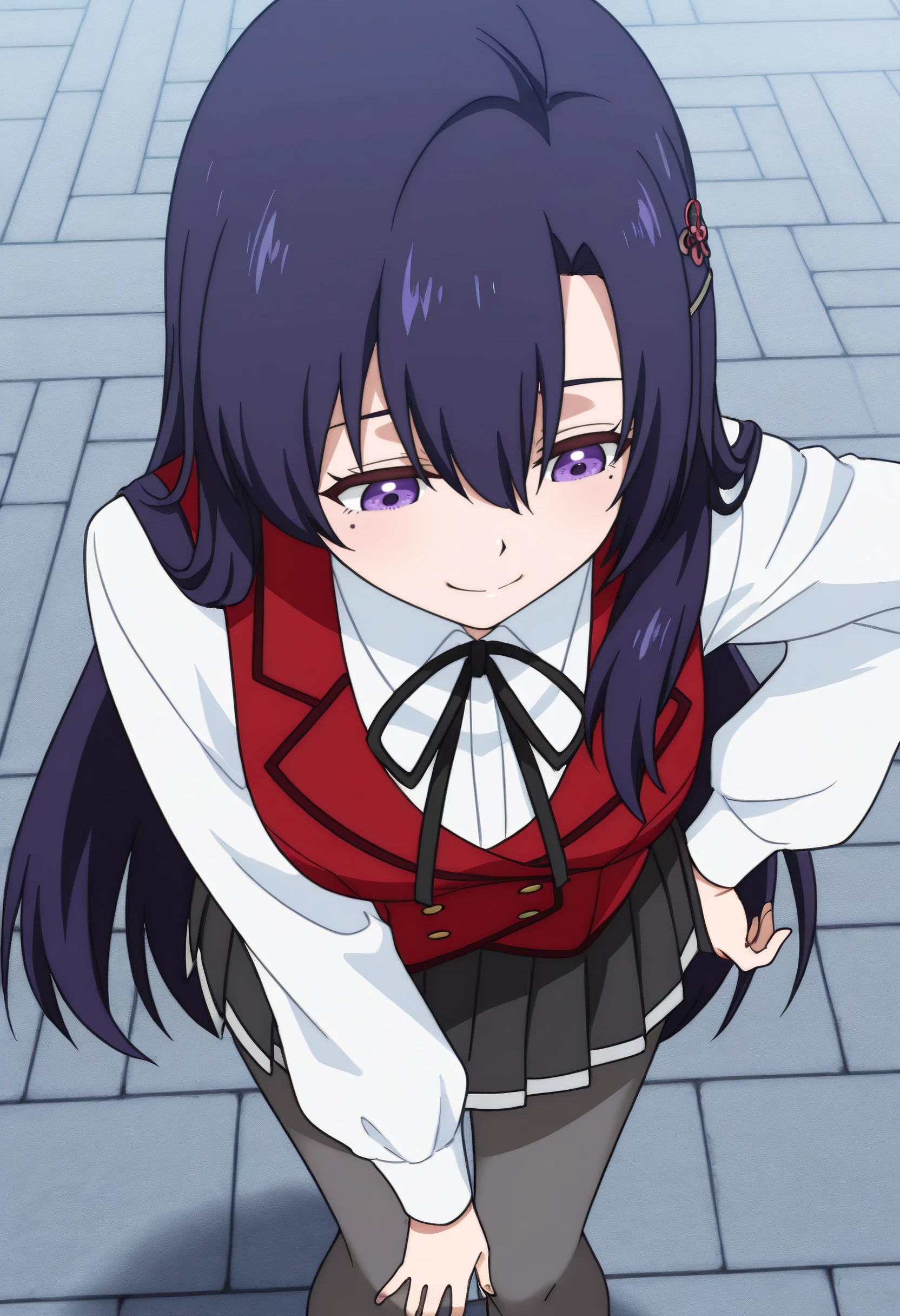 RebeccaSchoolA, school uniform, shirt, white shirt, neck ribbon, ribbon, vest, black ribbon, red vest, collared shirt, long sleeves, hair ornament, hairclip, skirt, black skirt, grey pantyhose, pleated skirt, pantyhose, buttons, miniskirt,