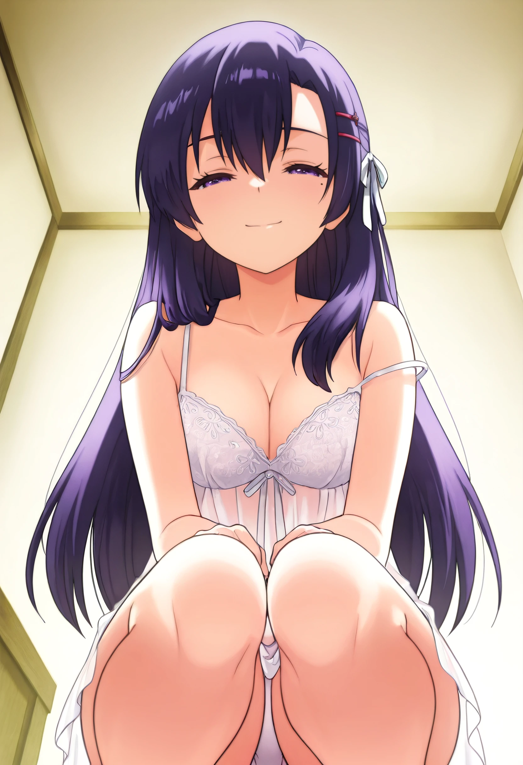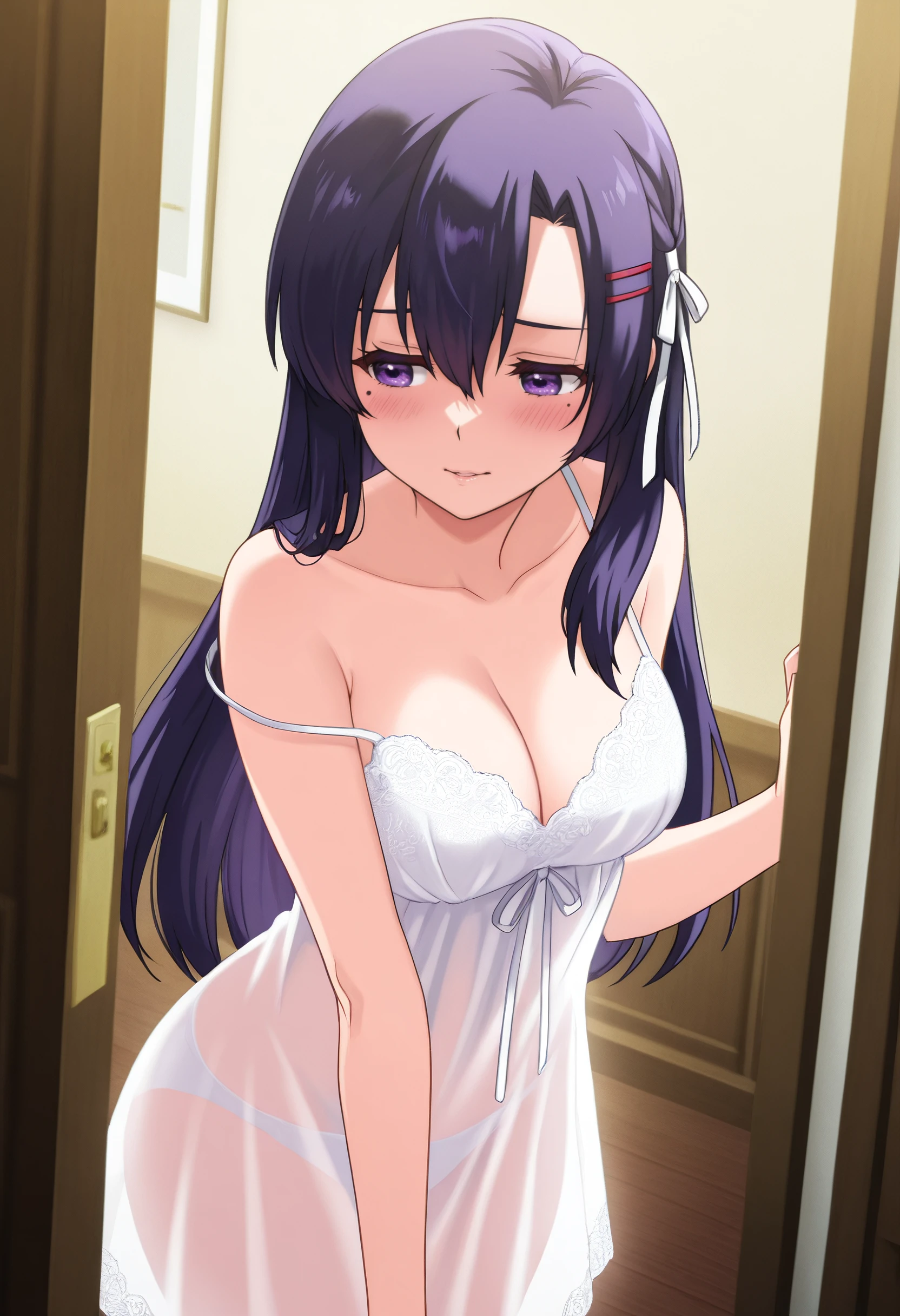 RebeccaUnderwear, hair ornament, hairclip, cleavage, strap slip, dress, underwear, white dress, see-through clothes, sleeveless, ribbon, spaghetti strap, nightgown, short dress, hair ribbon, chemise, negligee, panties, white ribbon, sleeveless dress, bare arms, bra, white bra, see-through dress,