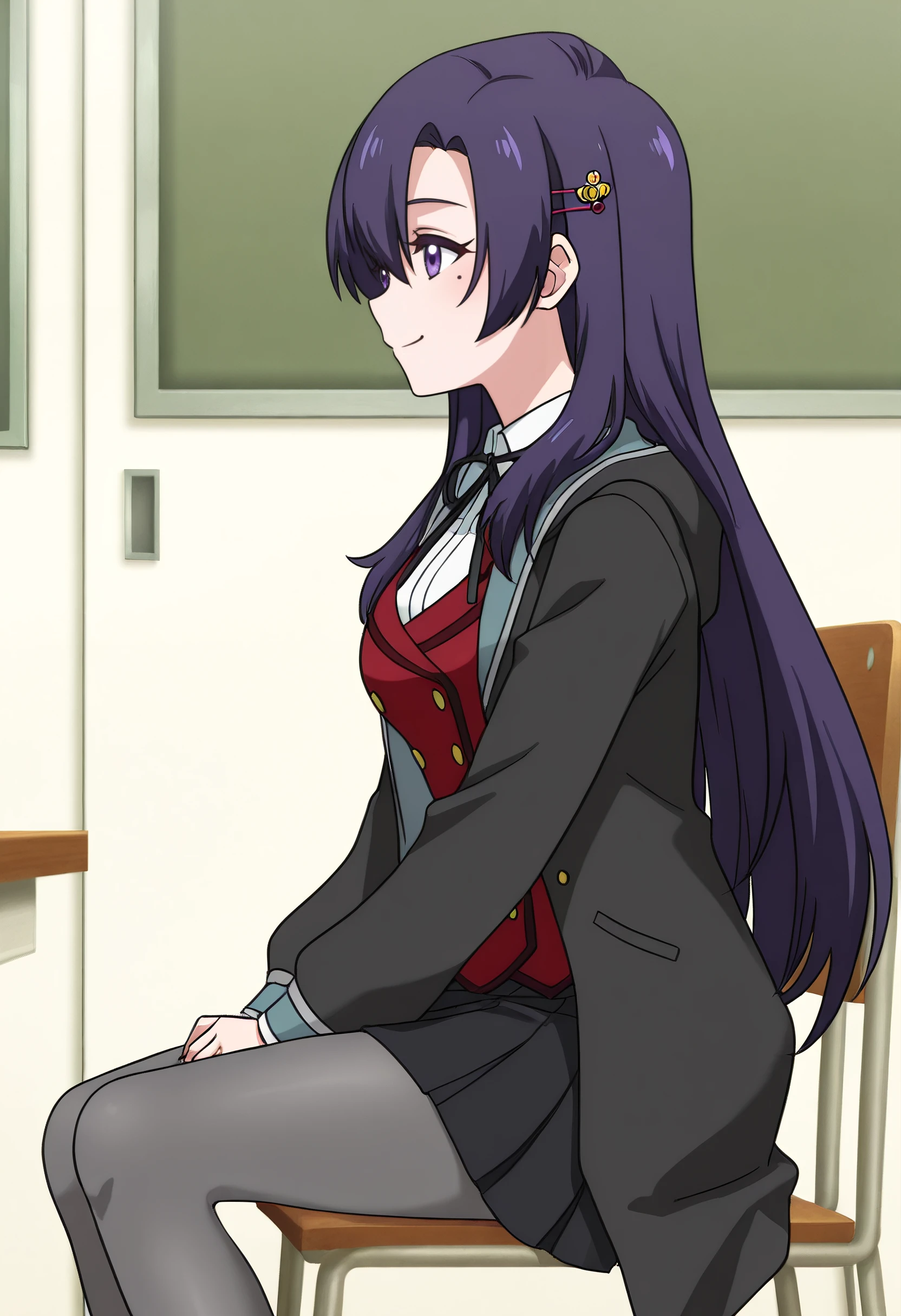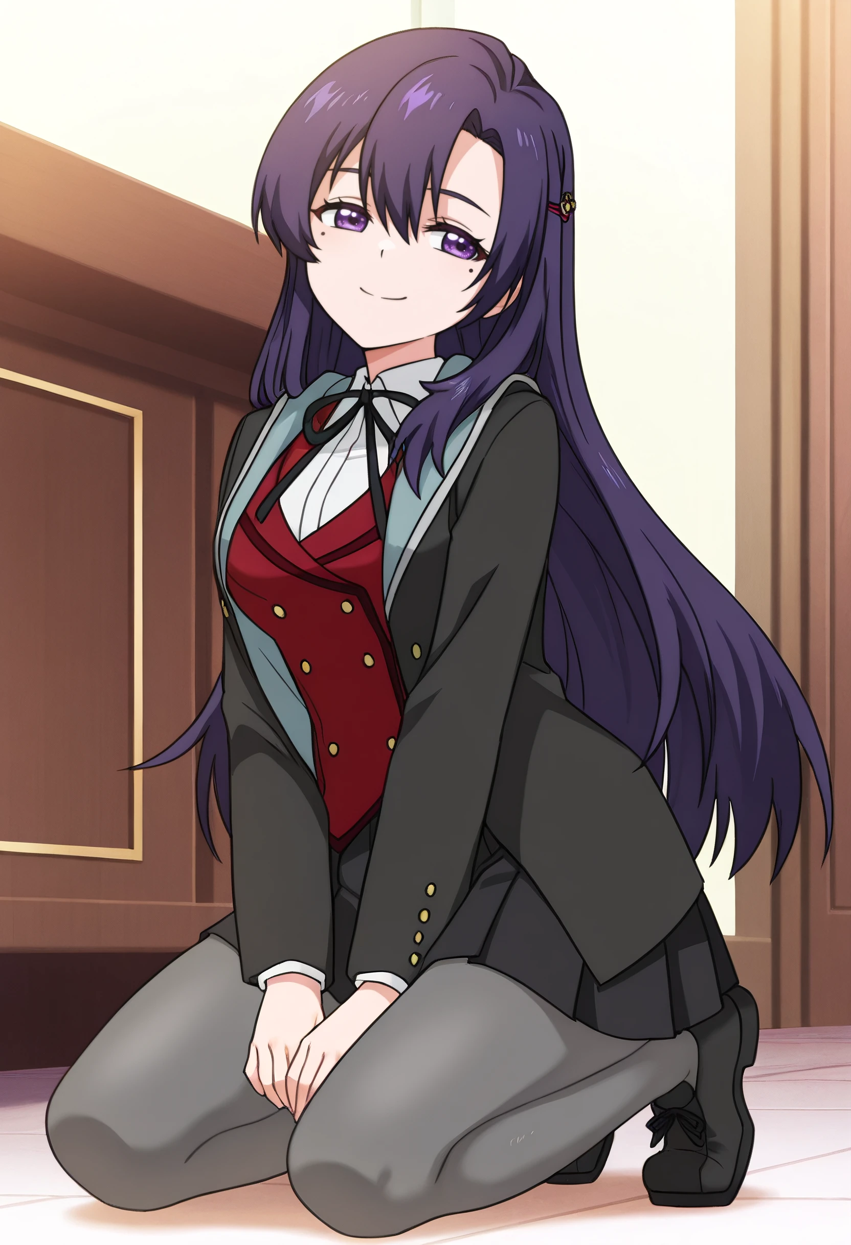 RebeccaSchoolB, black jacket, school uniform, neck ribbon, ribbon, black ribbon, white shirt, shirt, jacket, collared shirt, red vest, open clothes, vest, long sleeves, grey pantyhose, black footwear, buttons, blazer, hair ornament, hairclip, open jacket, pantyhose, black skirt, skirt, shoes, miniskirt, pleated skirt,