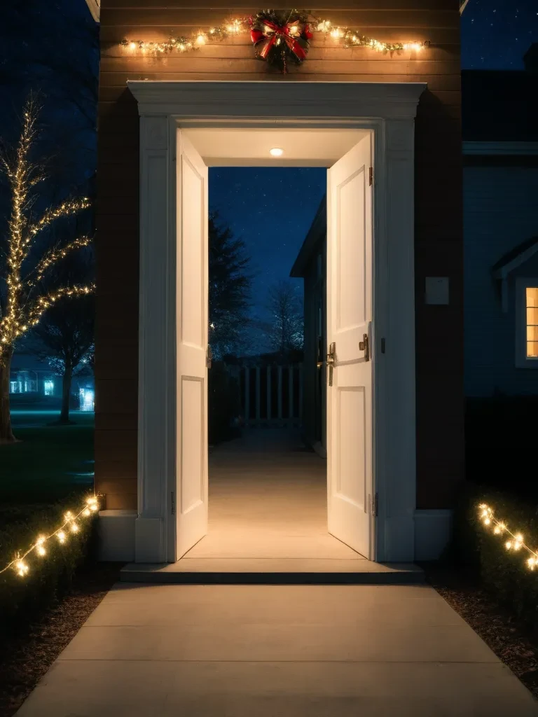 indoors, illumination, christmas lights, entrance, front door, shrine, lamppost,