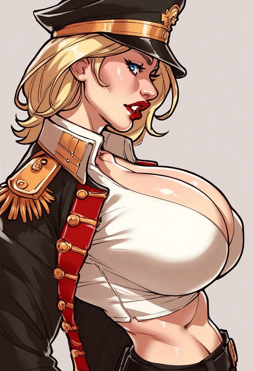 major_kyra, blonde hair, blue eyes, red lips, huge breasts, pale skin, officer cap, epaulettes, white top, bare midriff, military jacket, tight black pants, belt, red boots