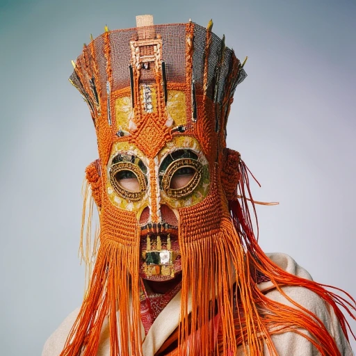 Digital myth-making: rigid mesh meets fluid yarn, pearl eyes stare from symmetrical brass geometry, fringe veils conceal speculative identities. Every mask a vessel of transformation, Dogon verticality, Yoruba ornamentation, Bwa glyphs all spliced into neon, metallic, dreamlike constructions.
