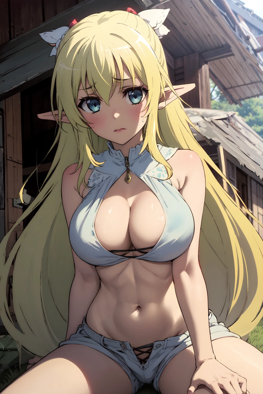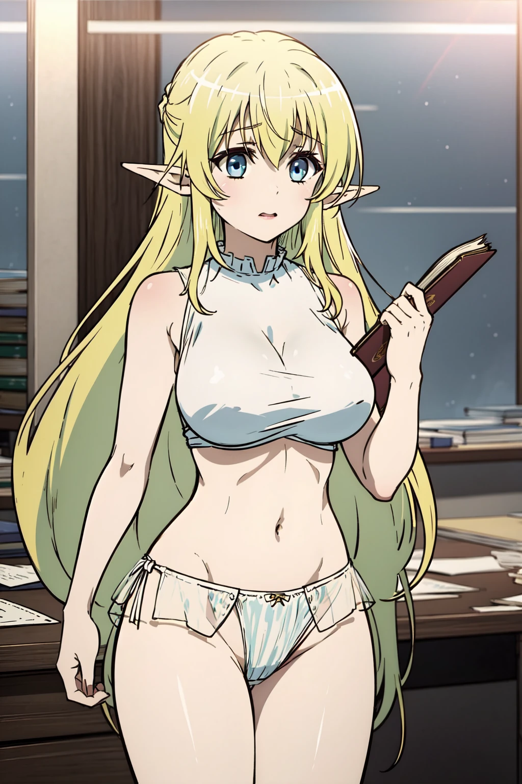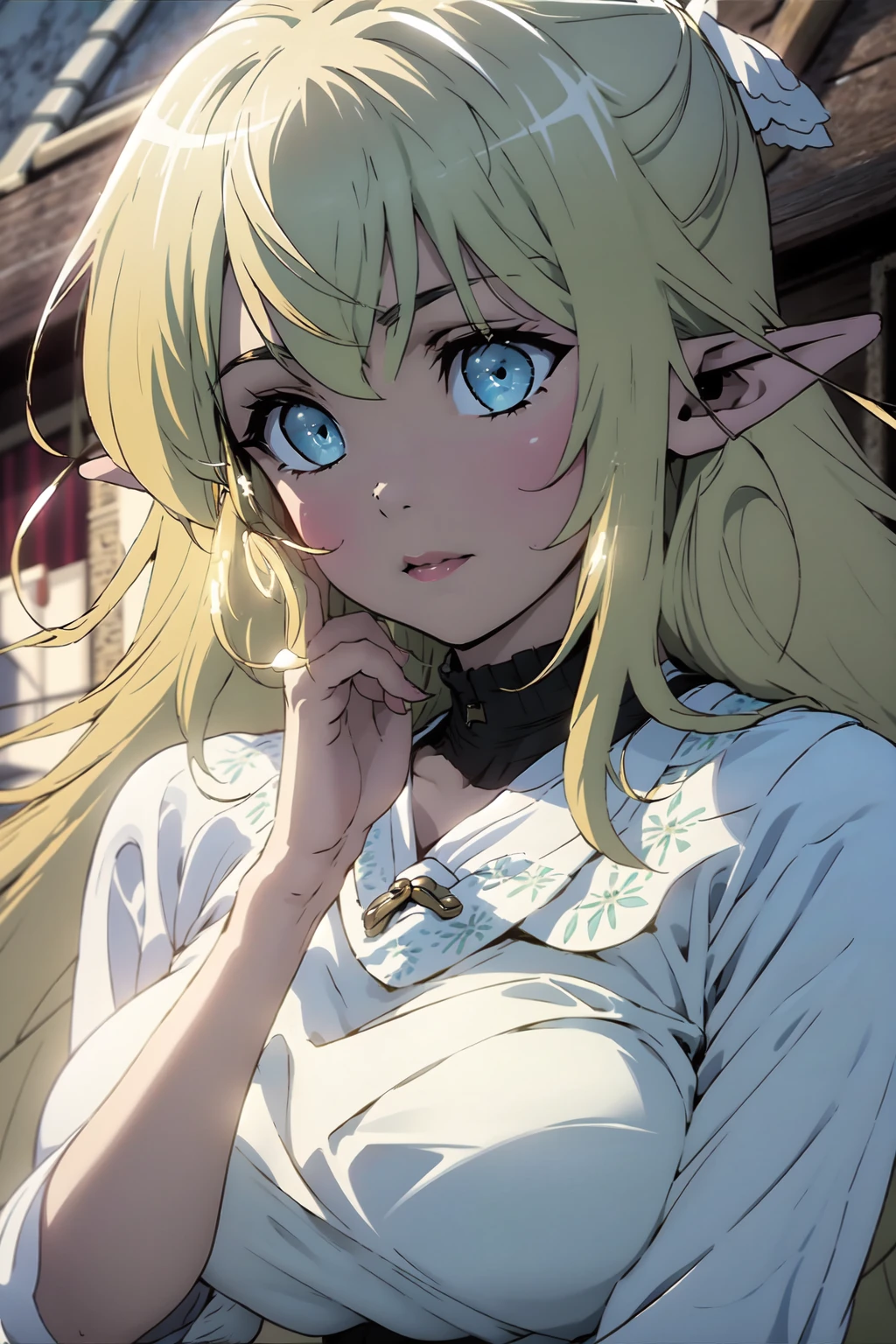 1girl, long hair, blue eyes, blonde hair, large breasts, pointy ears, elf, bangs, <lora:Lyrule-002:0.9>