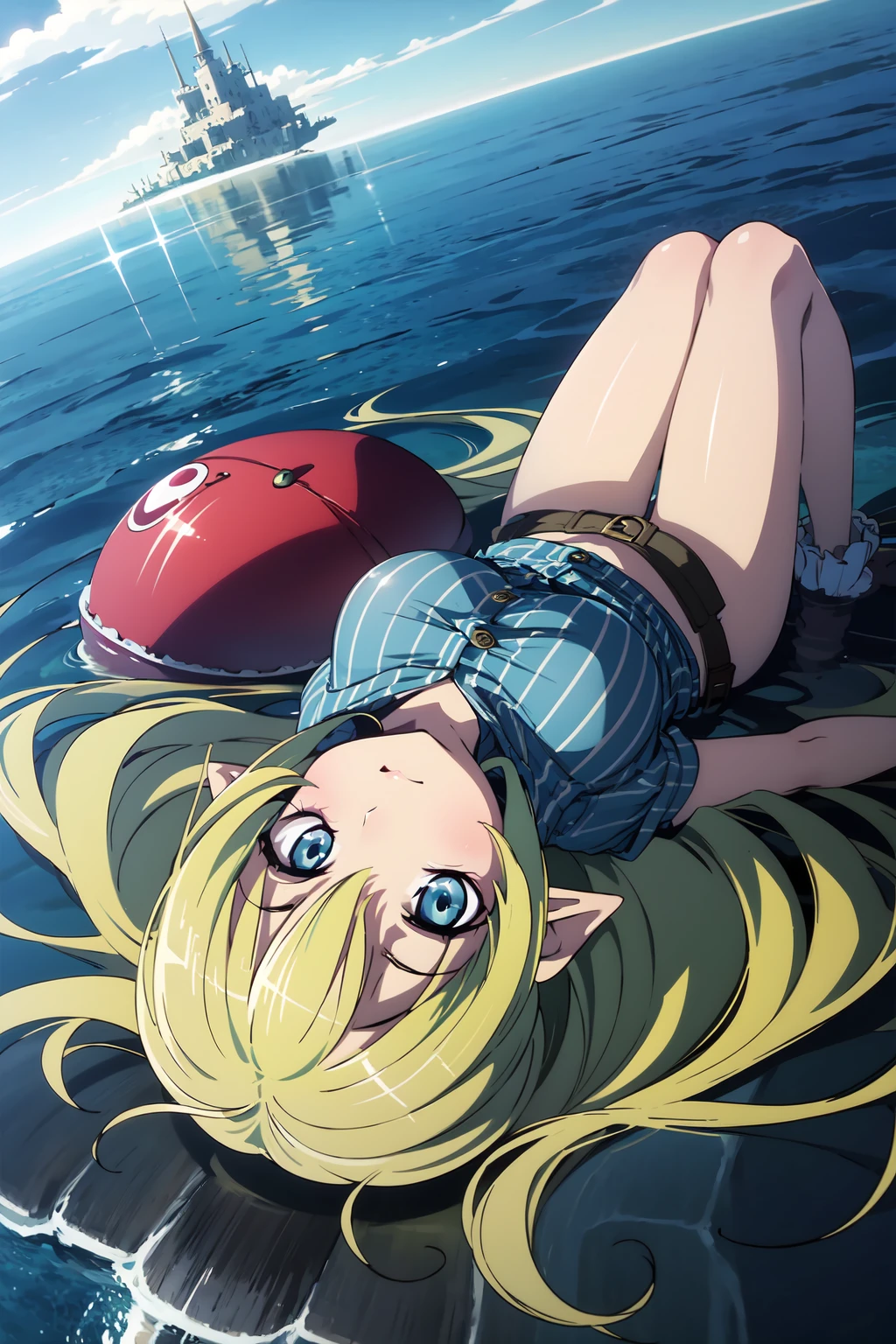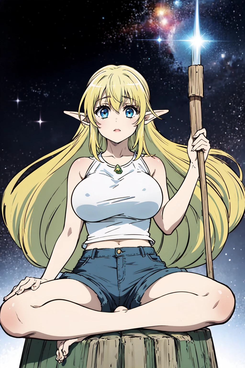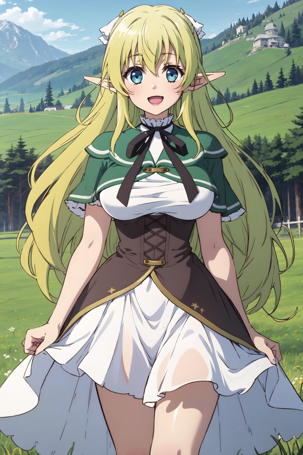 1girl, long hair, blue eyes, blonde hair, large breasts, pointy ears, elf, bangs, <lora:Lyrule-002:0.9>