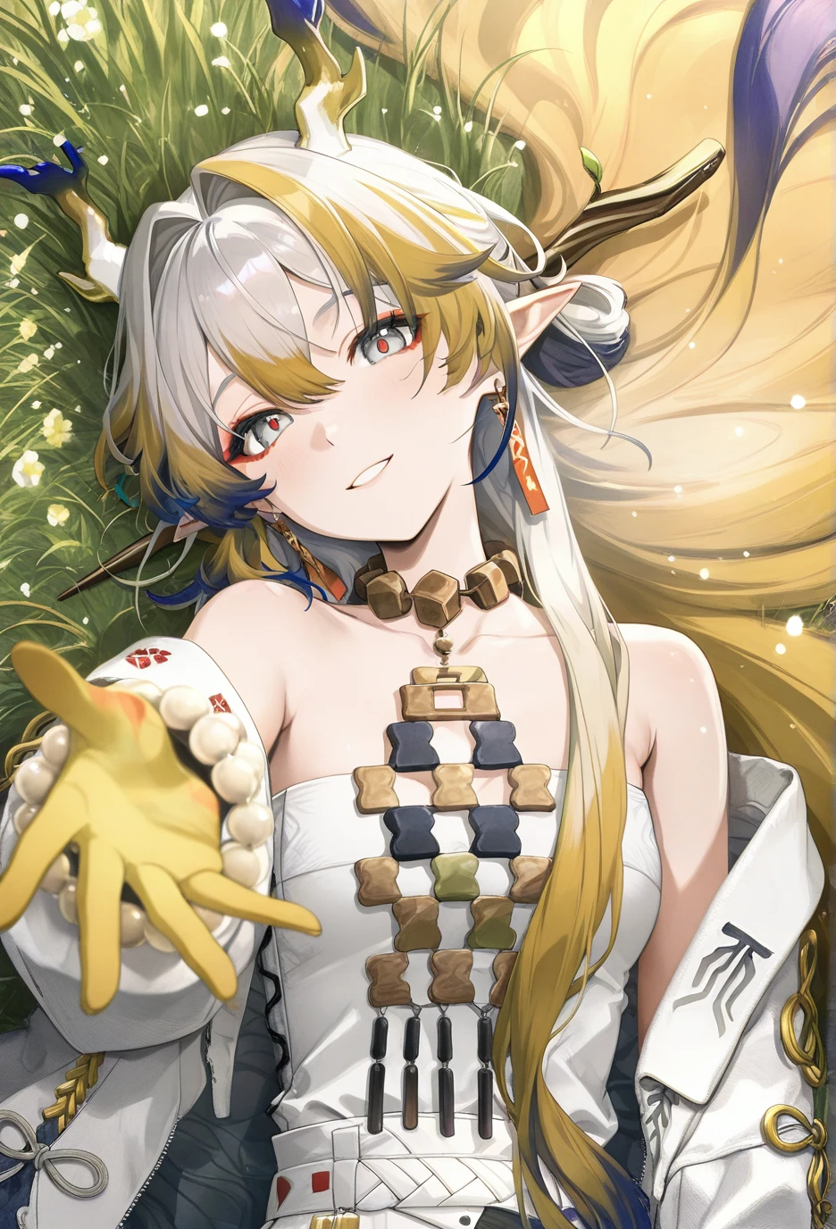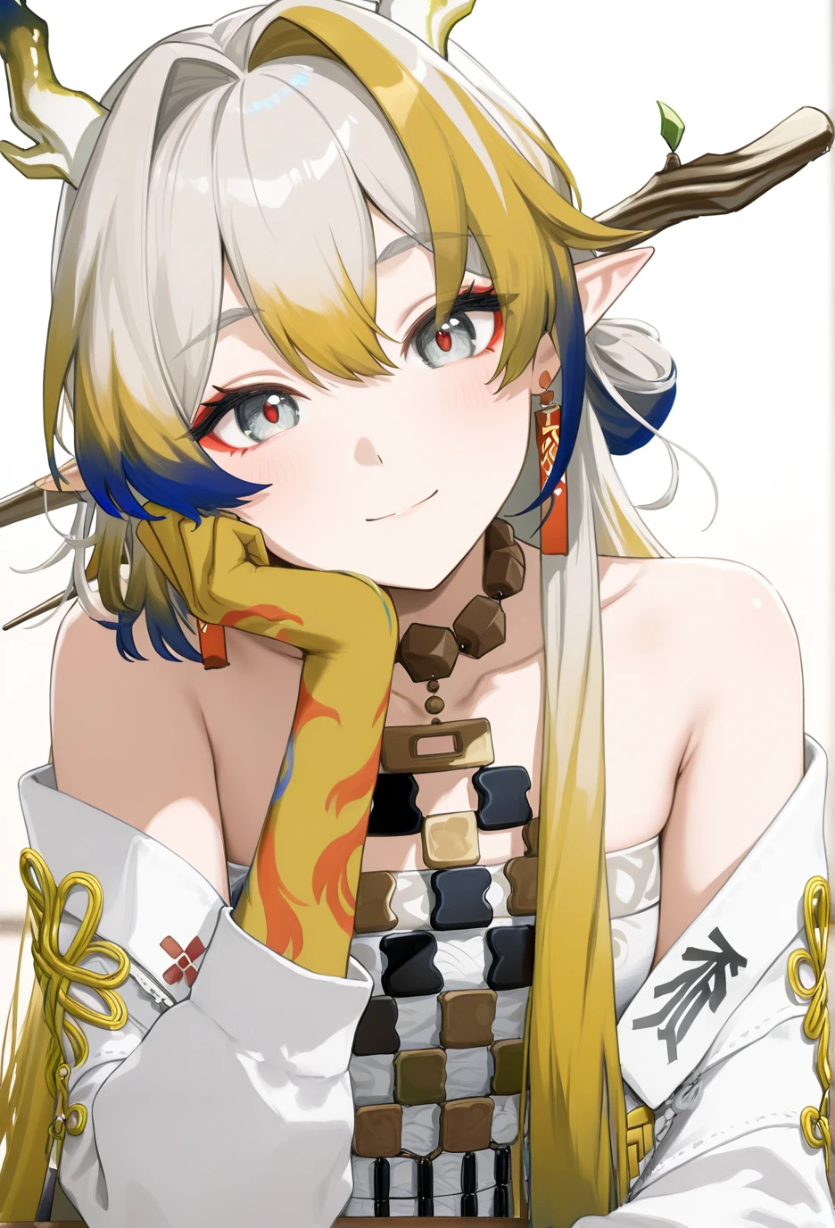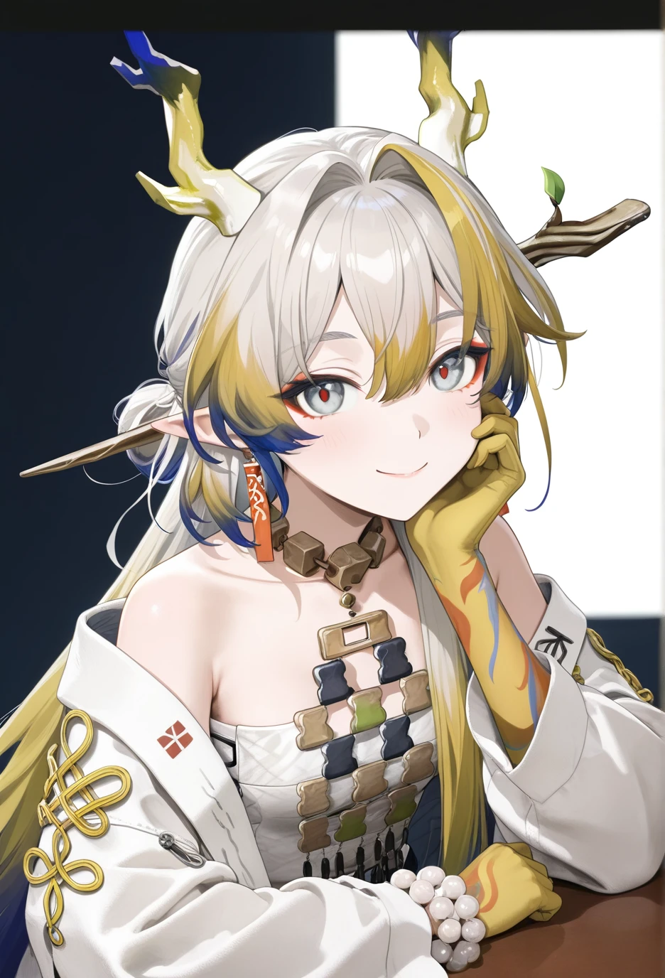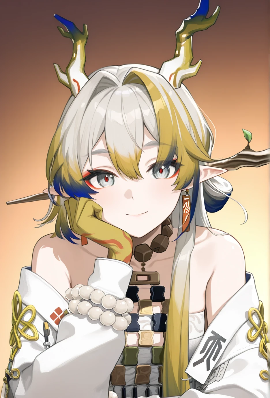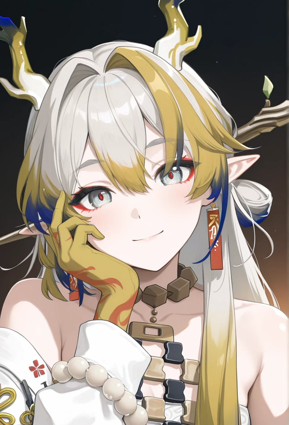 <lora:Arknights-ShuV1-Nuclear1811-IL>,tail,horns,makeup,eyeliner,Shu,grey eyes,red pupils,grey hair,multicolored hair,blonde hair,streaked hair,blue hair,colored tips,long hair,very long hair,red eyeliner,bangs,hair between eyes,hair intakes,dragon horns,pointy ears,dragon tail,dragon girl,df hair ornament,df branch,df hair stick,df leaf,df branch hair stick,df jewelry,df earrings,df tassel earrings,df collarbone,df bare shoulders,df off shoulder,df necklace,df tassel,df strapless,df strapless shirt,df bracelet,df bracelet on the right hand,df beads,df white beads,df prayer beads,df bead bracelet,df colored skin,df colored hands,df yellow hands,df gradient colored hands,df hand tattoo,df colorful hand tattoo,df pants,df white pants,df colored elbow,df gradient colored elbows,df socks,df black socks,df socks under pants,df shoes,df black footwear,df boots,df ankle boots,df cross-laced footwear,df lace-up boots,df shoelaces,df white shoelaces,lhDescription