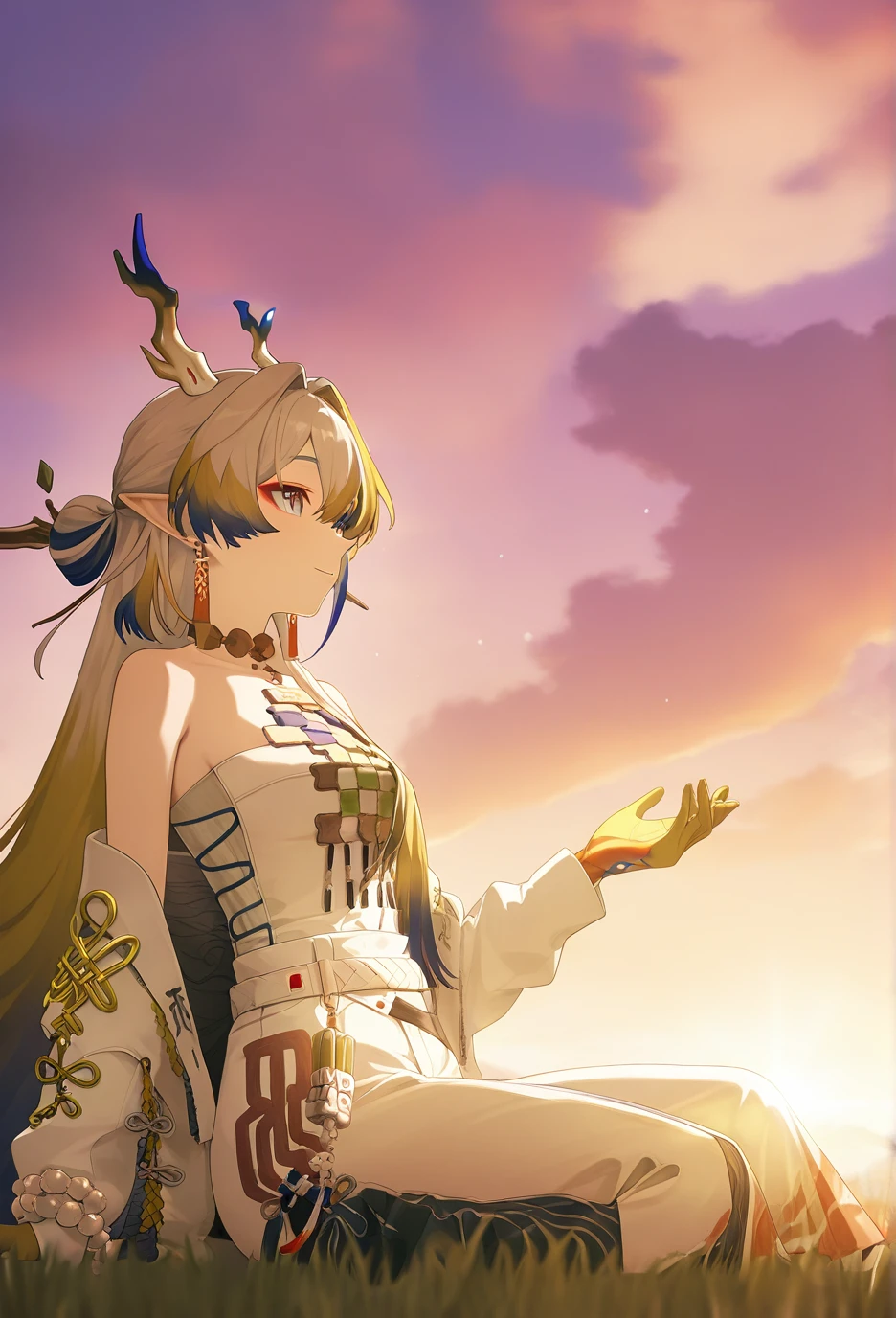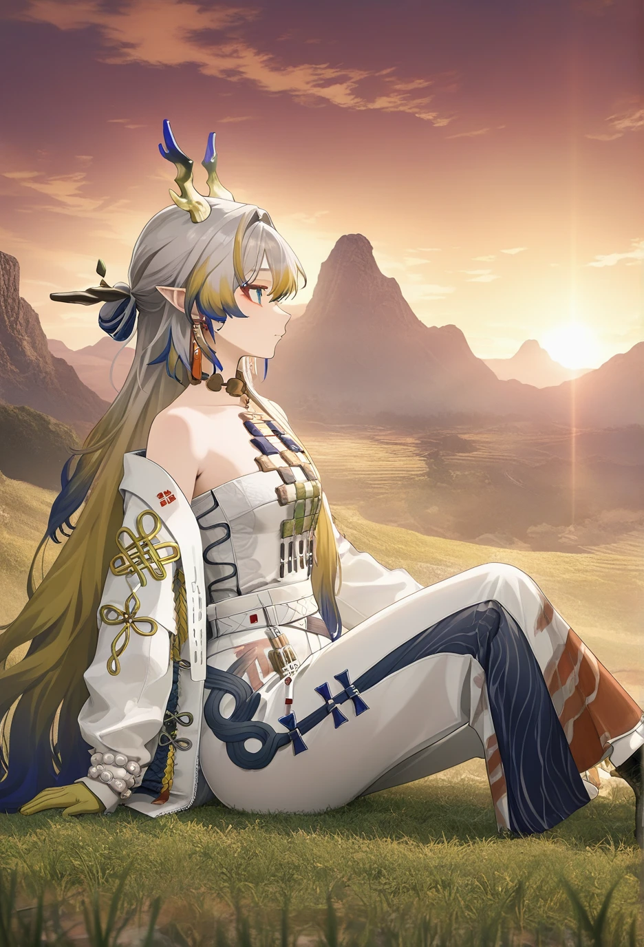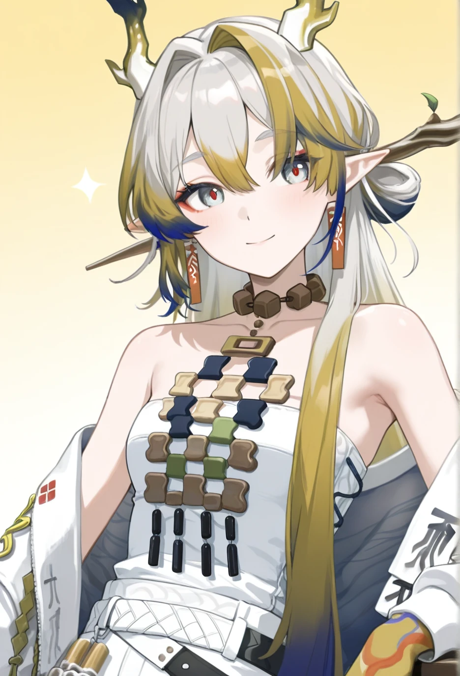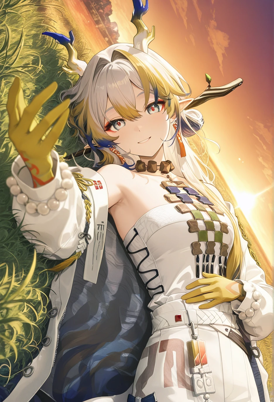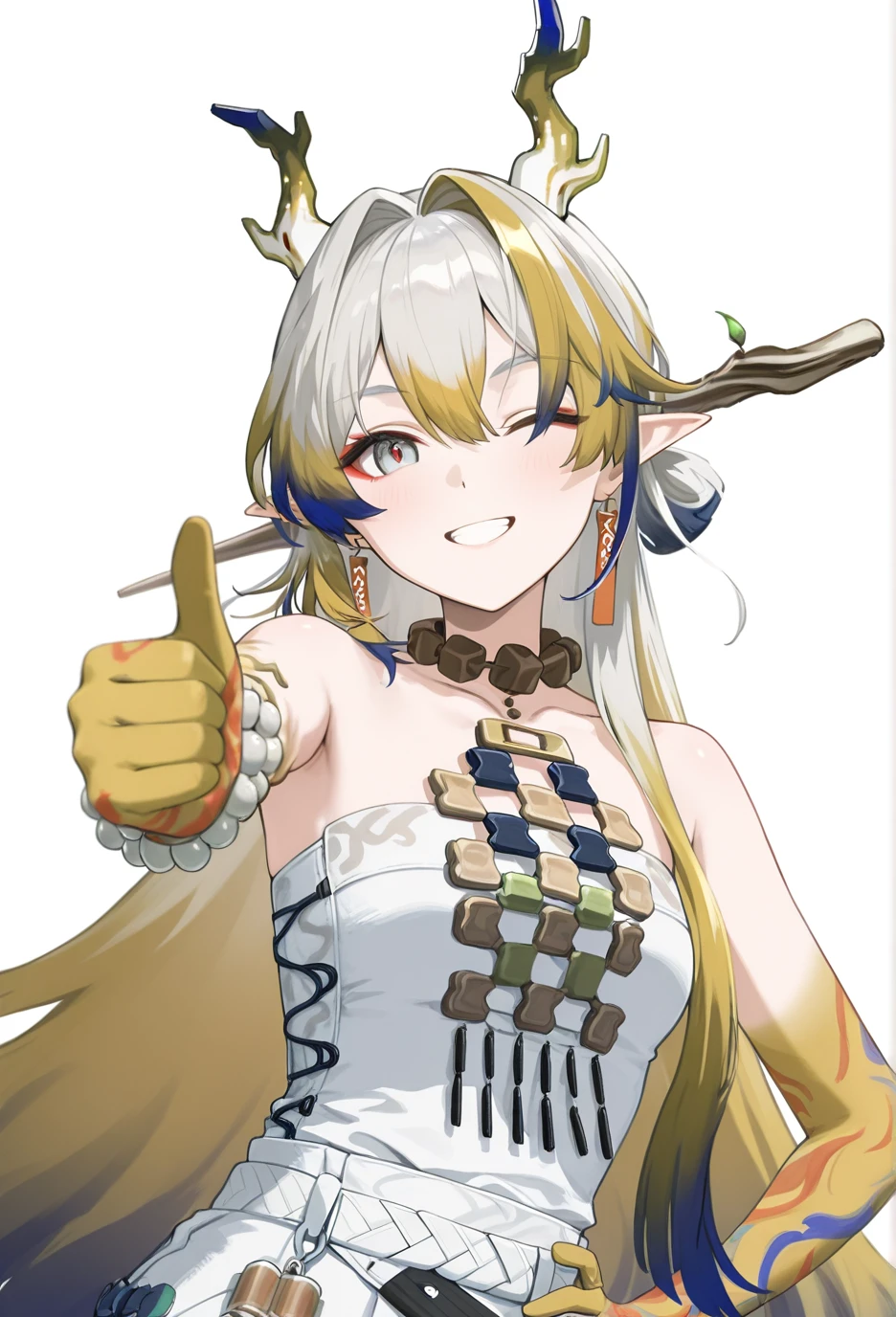 <lora:Arknights-ShuV1-Nuclear1811-IL>,tail,horns,makeup,eyeliner,Shu,grey eyes,red pupils,grey hair,multicolored hair,blonde hair,streaked hair,blue hair,colored tips,long hair,very long hair,red eyeliner,bangs,hair between eyes,hair intakes,dragon horns,pointy ears,dragon tail,dragon girl,df hair ornament,df branch,df hair stick,df leaf,df branch hair stick,df jewelry,df earrings,df tassel earrings,df collarbone,df bare shoulders,df off shoulder,df necklace,df tassel,df strapless,df strapless shirt,df bracelet,df bracelet on the right hand,df beads,df white beads,df prayer beads,df bead bracelet,df colored skin,df colored hands,df yellow hands,df gradient colored hands,df hand tattoo,df colorful hand tattoo,df pants,df white pants,df colored elbow,df gradient colored elbows,df socks,df black socks,df socks under pants,df shoes,df black footwear,df boots,df ankle boots,df cross-laced footwear,df lace-up boots,df shoelaces,df white shoelaces,lhDescription