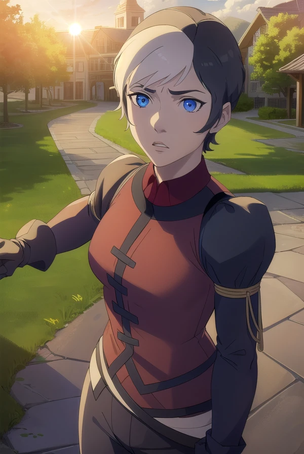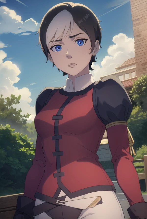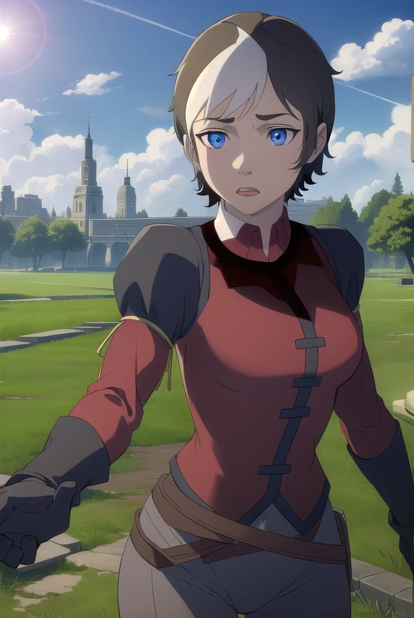 cassandra de rolo, short hair, blue eyes, black hair, white hair, multicolored hair, two-tone hair,