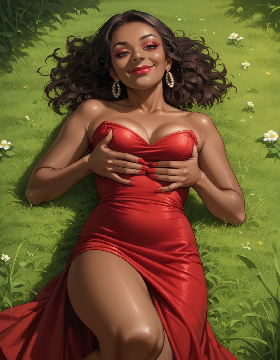 hud_cupp1ng_brst, 1girl, makeup, lipstick, solo, long red dress, holding SIZE breasts