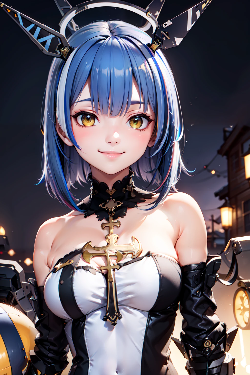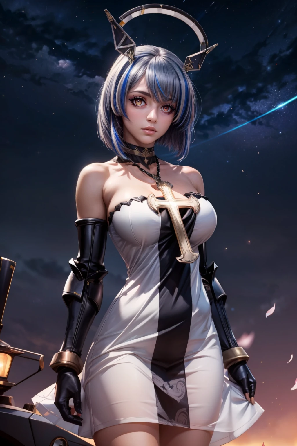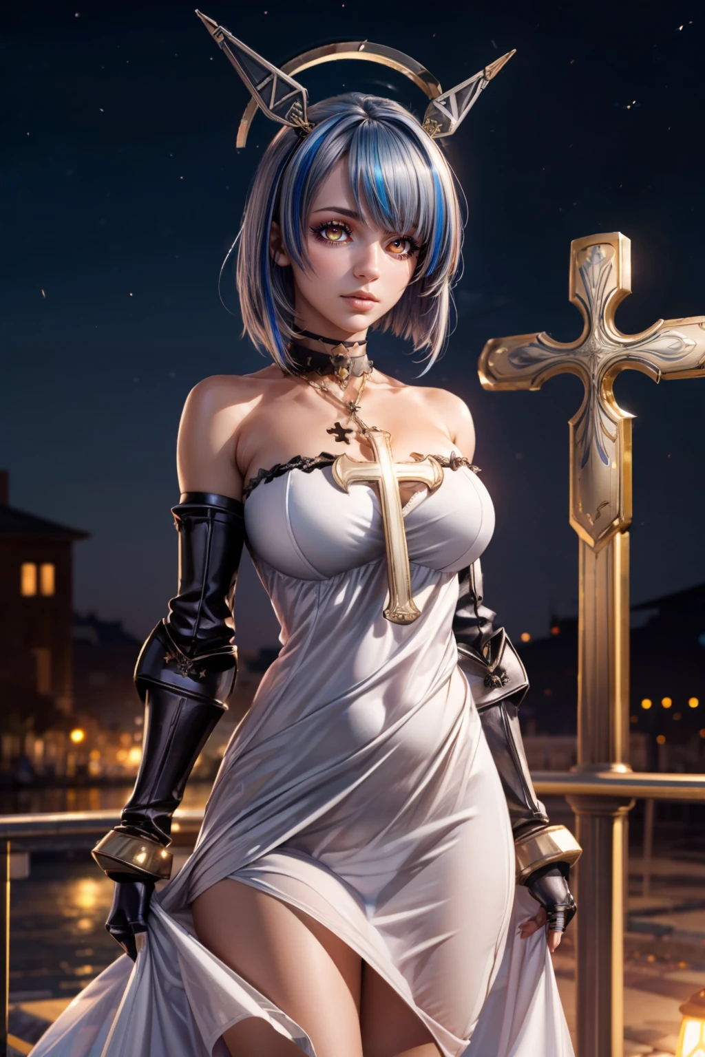 zzGascogne, blue hair, short hair, yellow eyes, headgear, bangs, multicolored hair, streaked hair, mechanical halo, bare shoulders, cross necklace, strapless dress, white dress, gauntlets, cross, choker, cleavage,