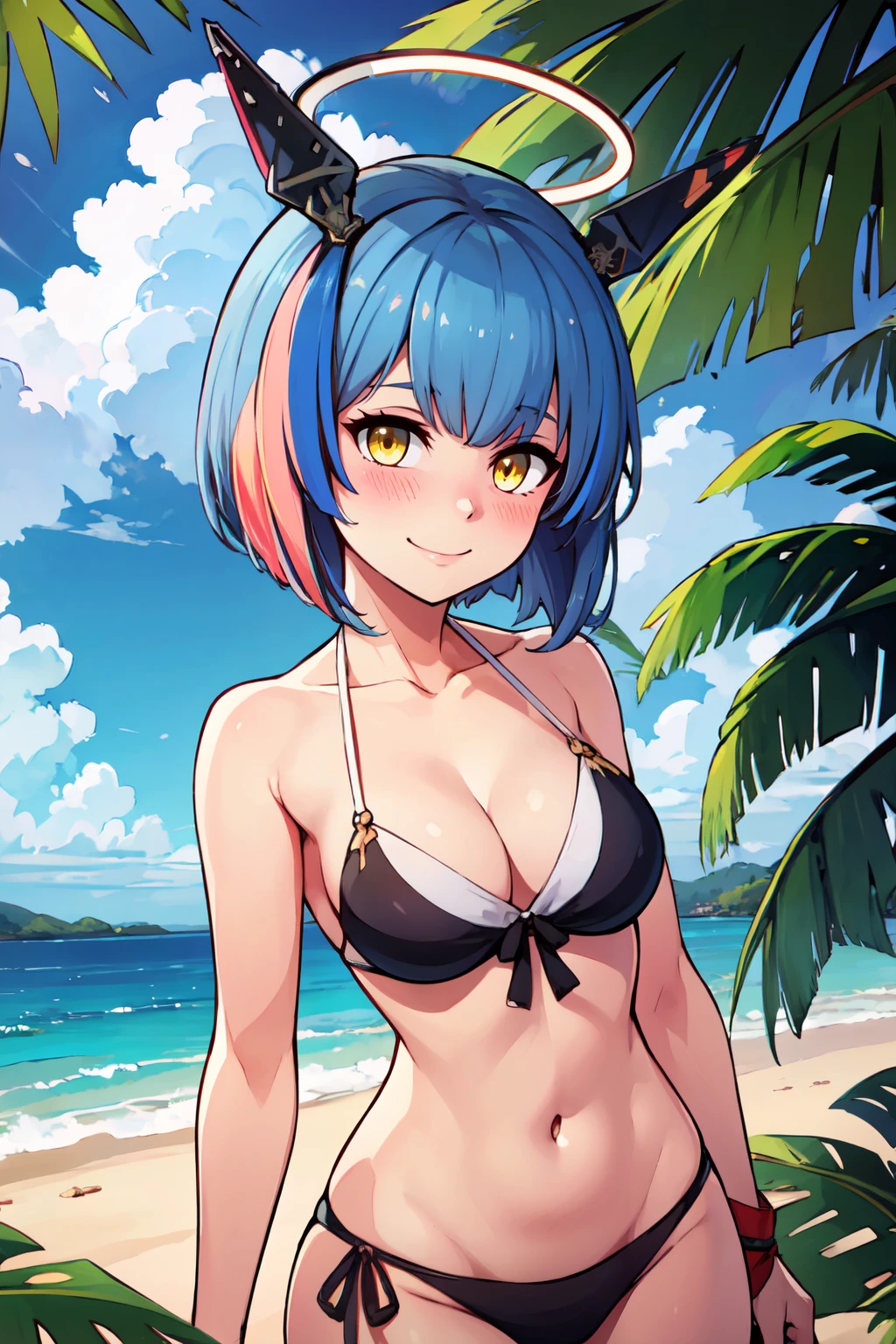 zzGascogne, blue hair, short hair, yellow eyes, headgear, bangs, multicolored hair, streaked hair, mechanical halo,