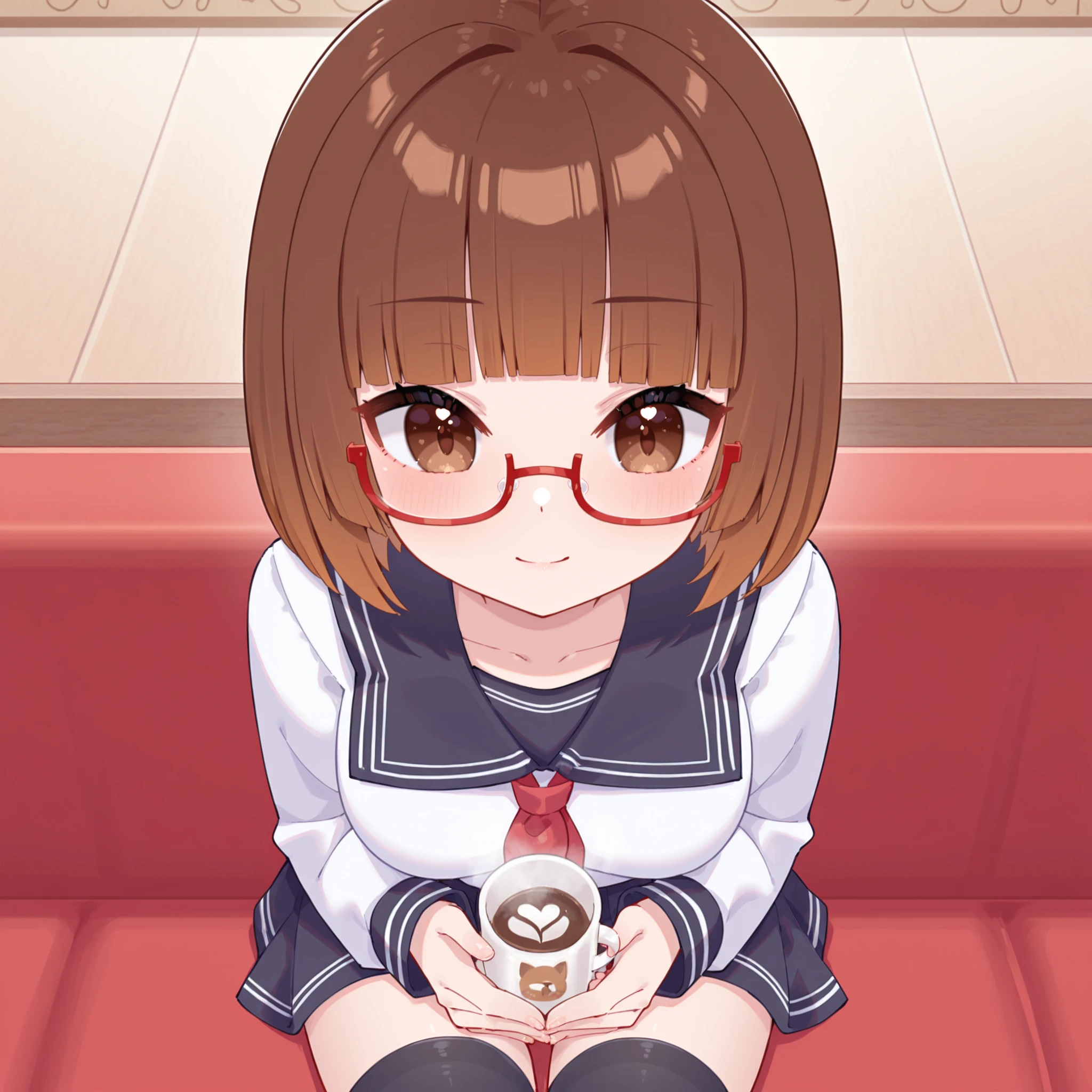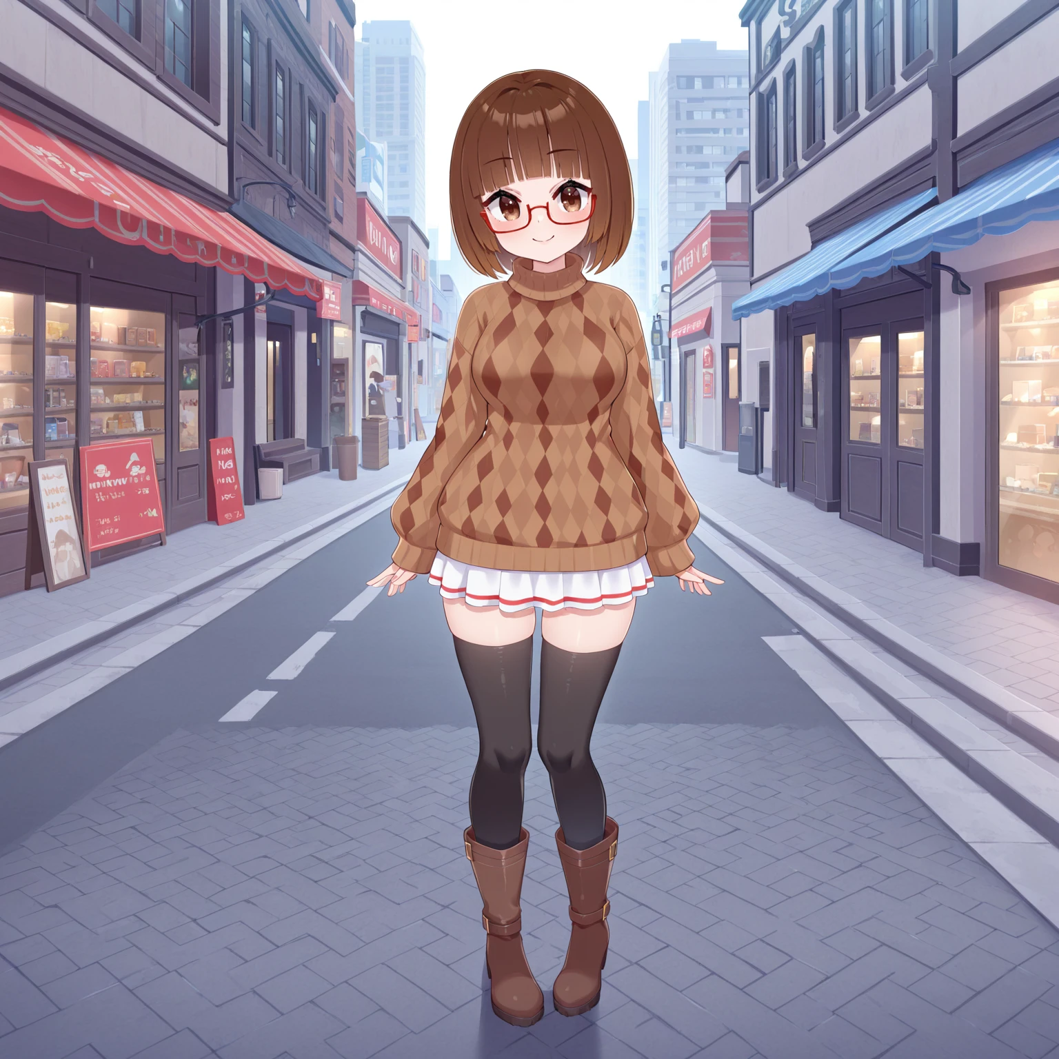 • YUKIAKIKO, 1girl, brown hair, short hair, bangs, brown eyes, red-framed eyewear, black thighhighs, skirt, boots, sweater,