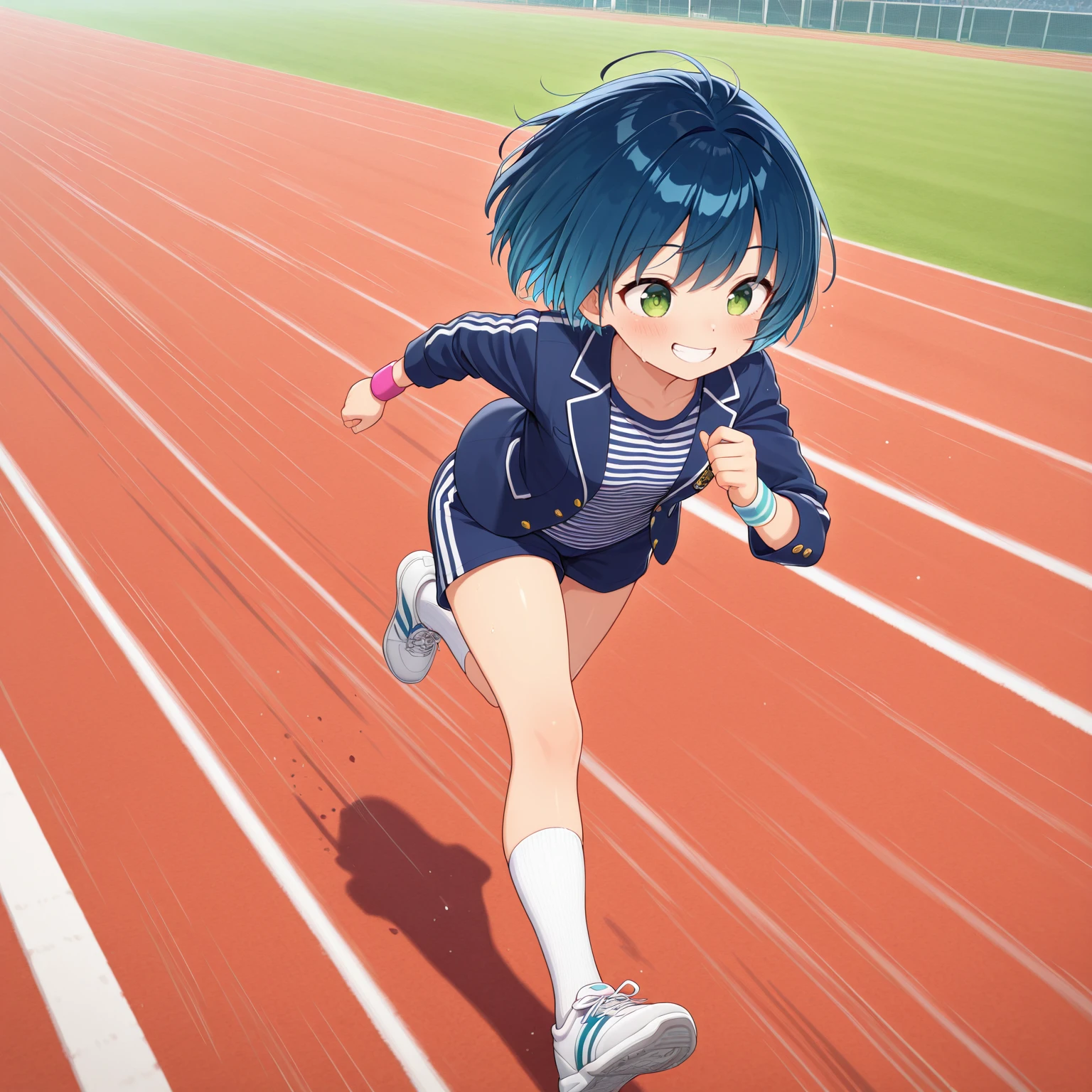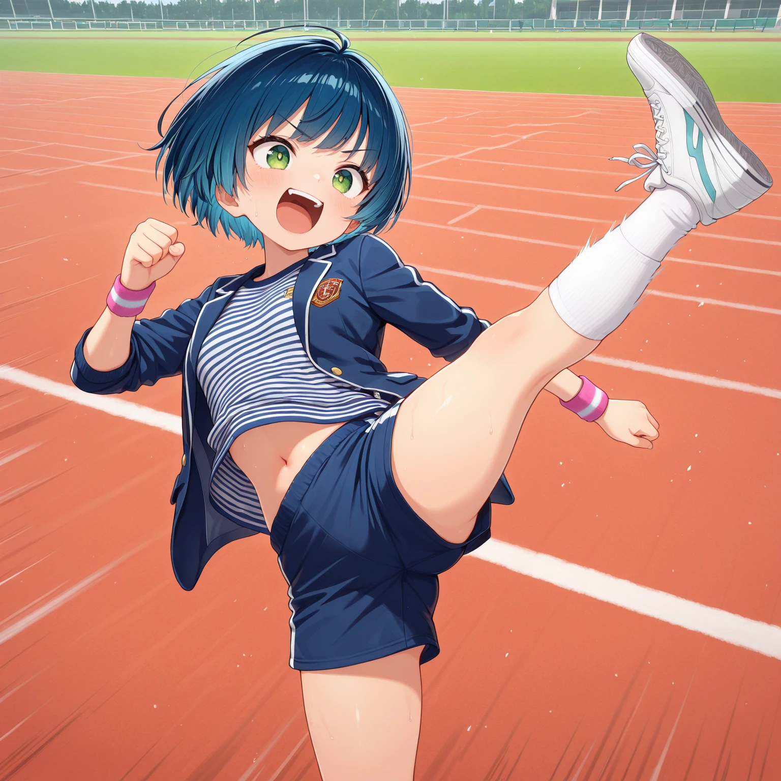 • UMEDAYUURI, 1girl, blue hair, green eyes, short hair, striped shirt, socks, sneakers, shorts, wristband, jacket, small breasts,