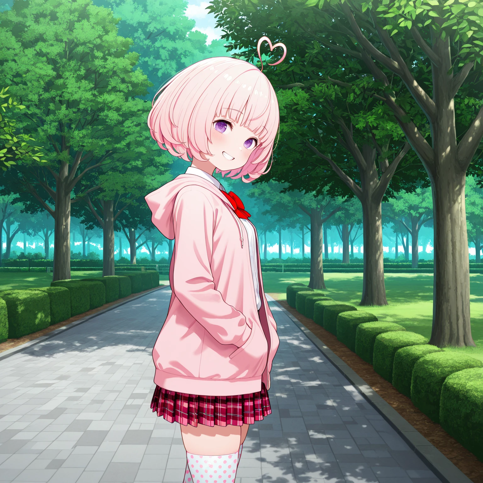 • YOKOIYUZUHA, 1girl, purple eyes, pink hair, short hair, heart ahoge, hearts polka dot thighhighs, plaid skirt, pink hooded jacket, white shirt, red bow, hood down, small breast,
