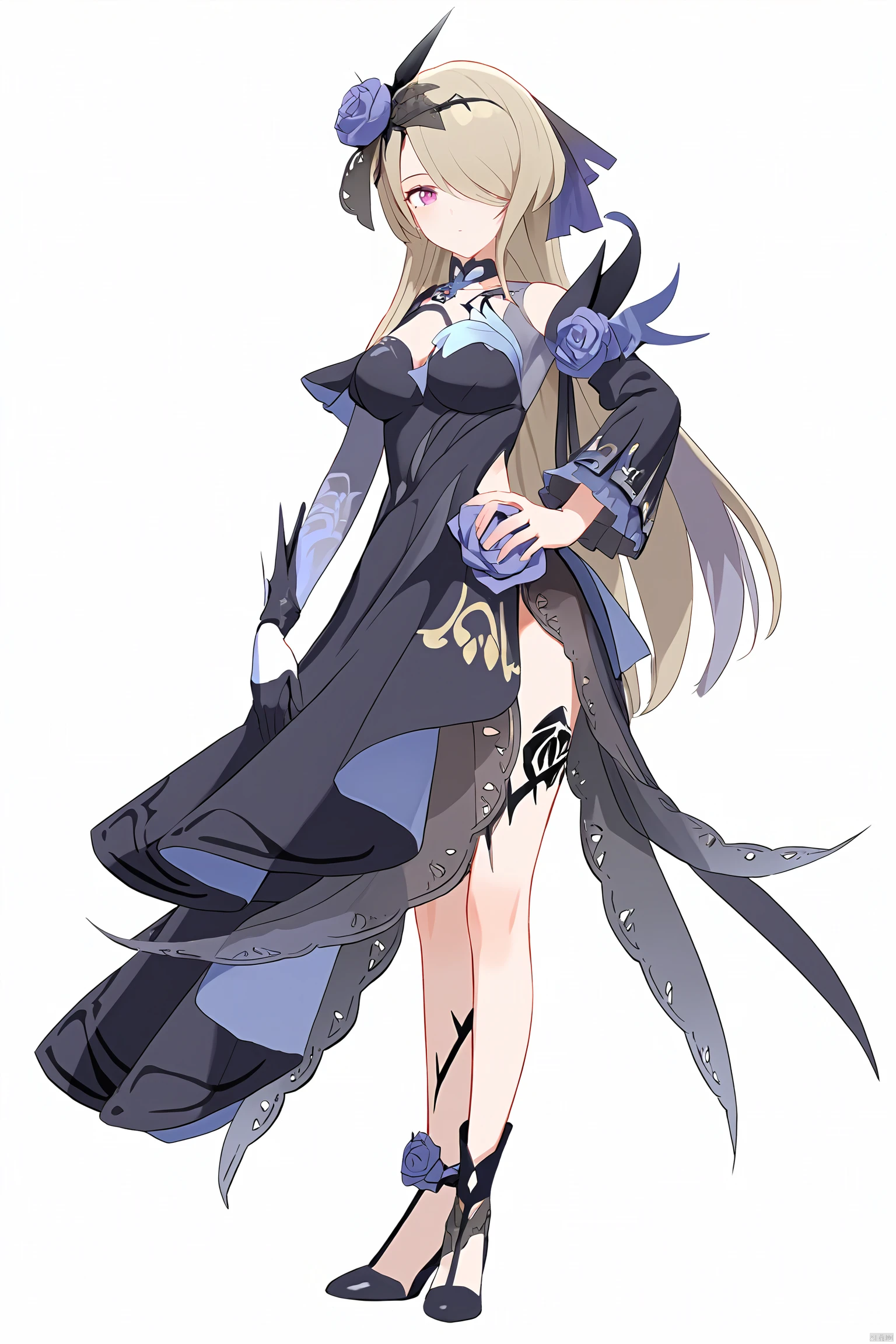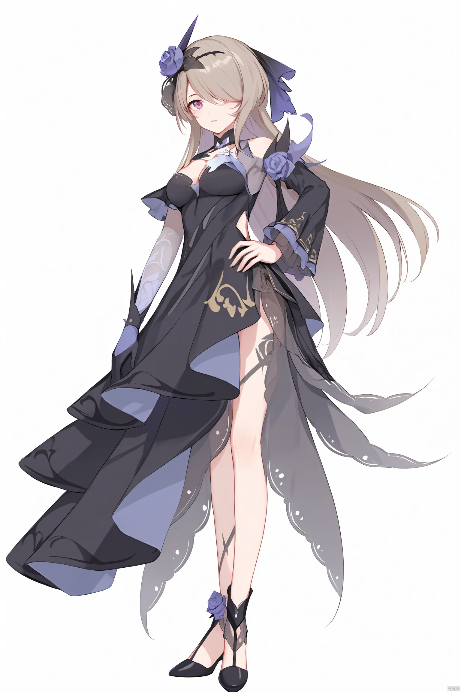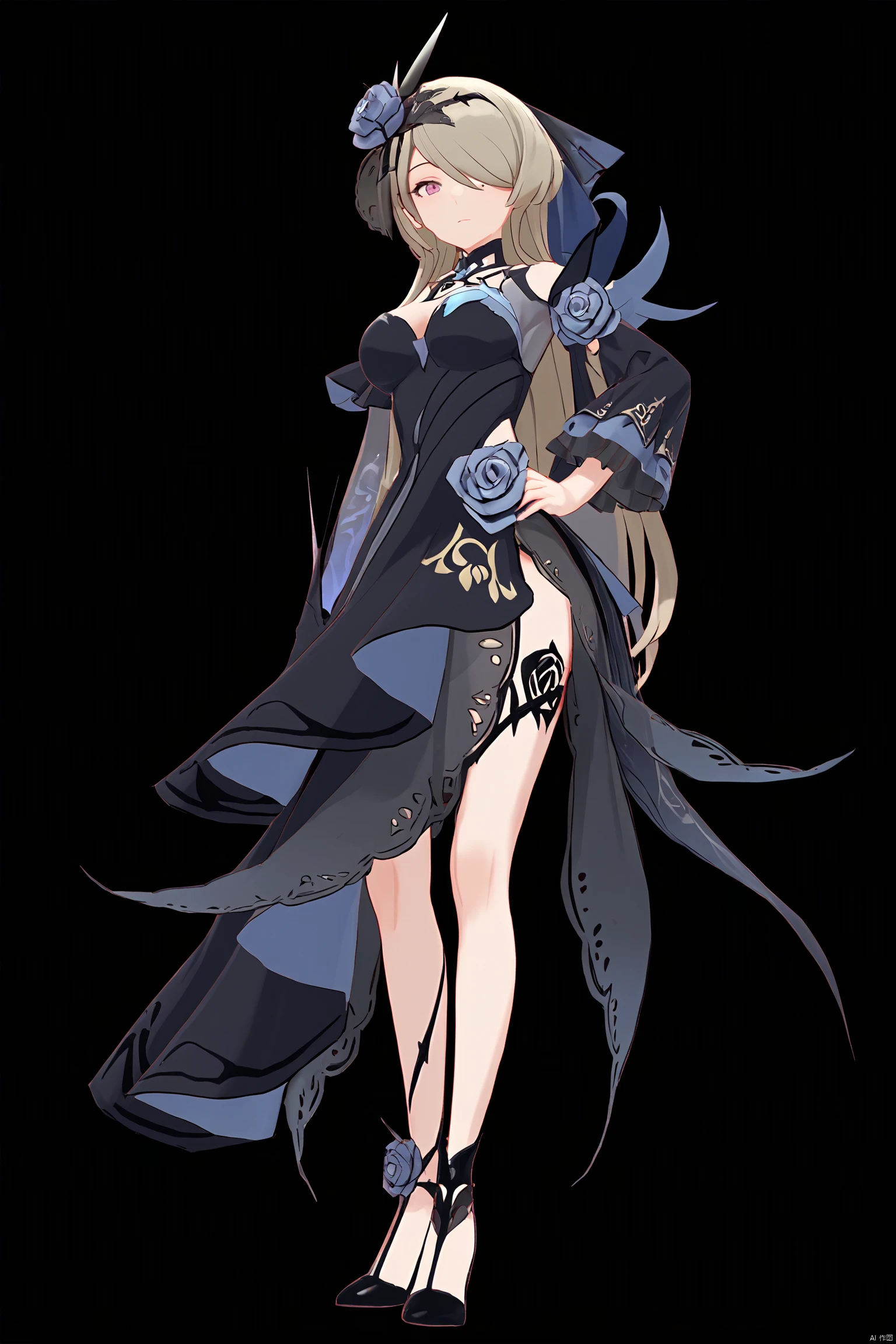 midie,1girl,rita rossweisse,hair over one eye,flower,black single glove,hair ornament,hair flower,rose,breasts,black dress,mole under eye,long brownhair