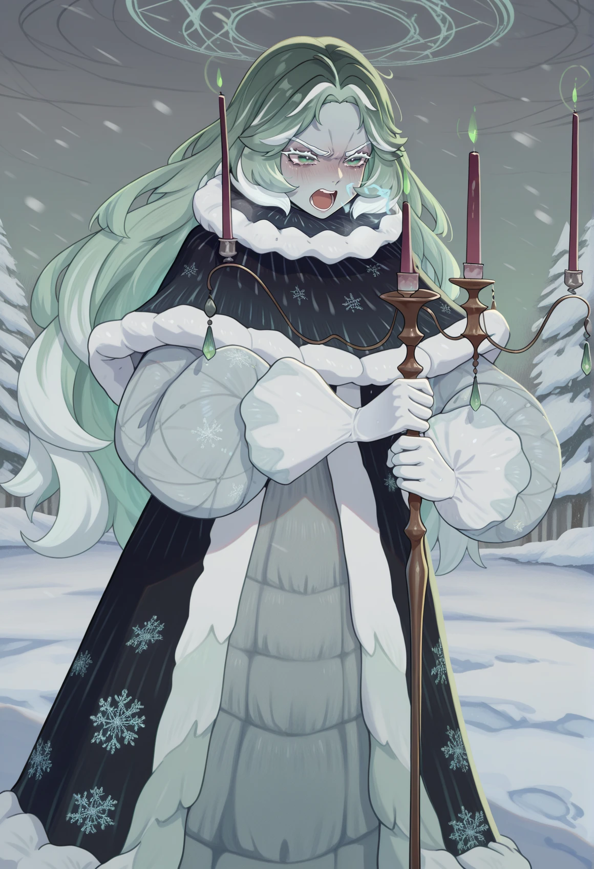 Notable tags: colored skin, grey skin, colored eyebrows, white eyebrows, colored eyelashes, white eyelashes, black eyelashes, multicolored hair, green hair, white hair, green eyes, whinter clothes, dress, coat, puffy sleeves, gloves, capelet, fur trim, snowflake print