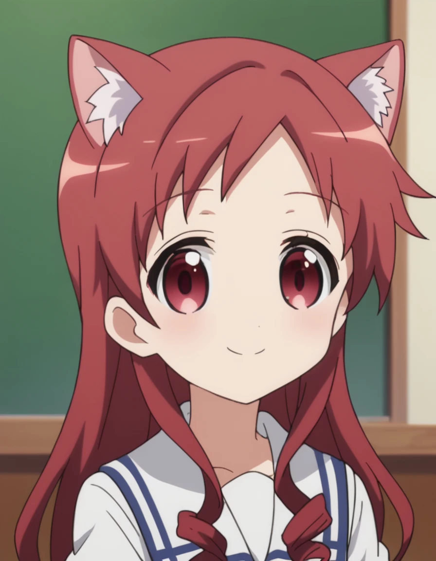 megumi natsu, red hair, long hair, twintails, low twintails, scrunchie, hair scrunchie, red eyes,