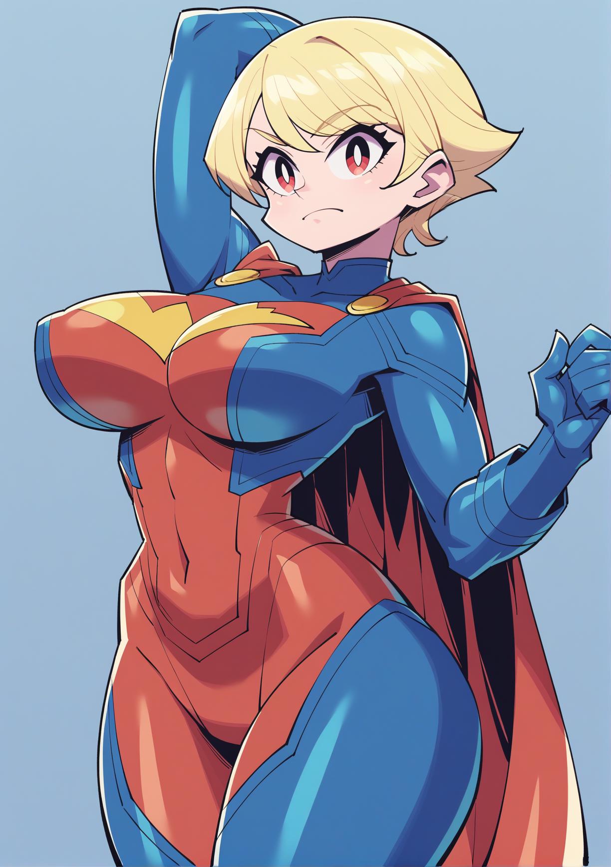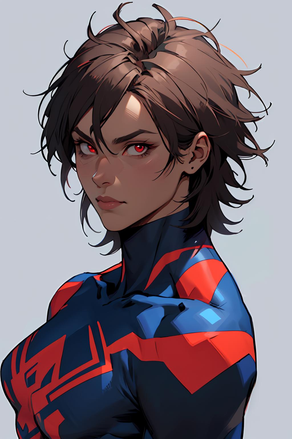 Recommended: "red eyes, superhero, gloves, skin tight, blue bodysuit" in positive prompt help with getting the main outfit to stick. You can also try "Arm blade" which sometimes adds in the arm blades from the original design but it is hit or miss if they work.