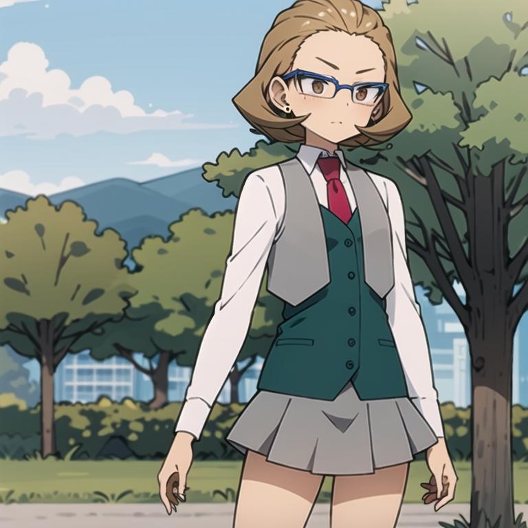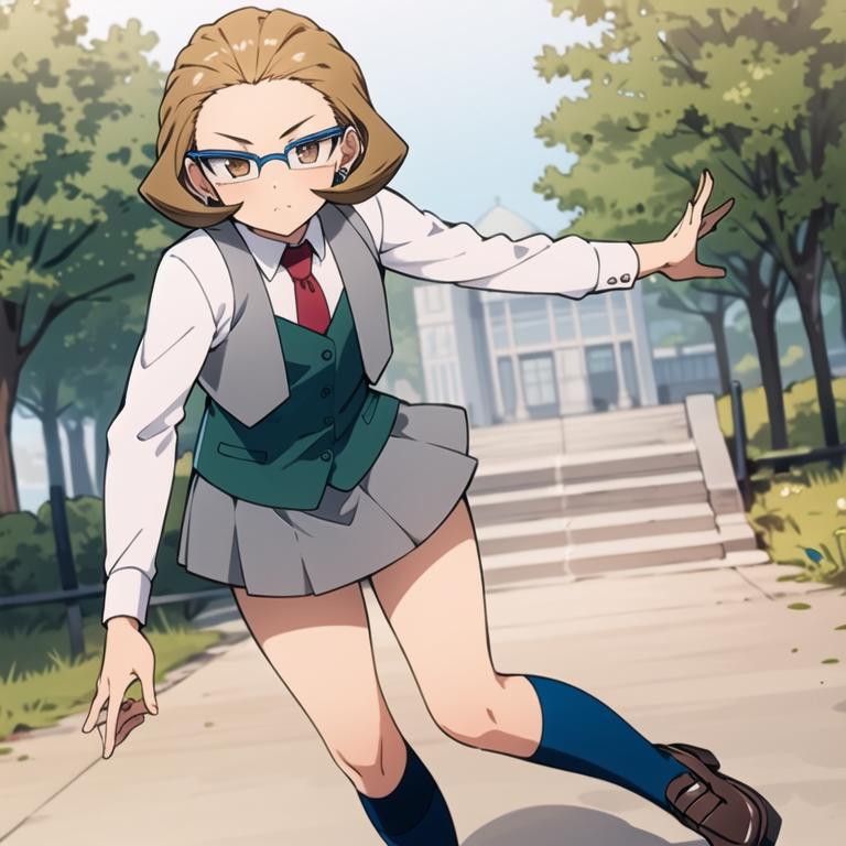 Base outfit: school uniform, necktie, socks, vest, kneehighs, grey skirt, pleated skirt, shoes