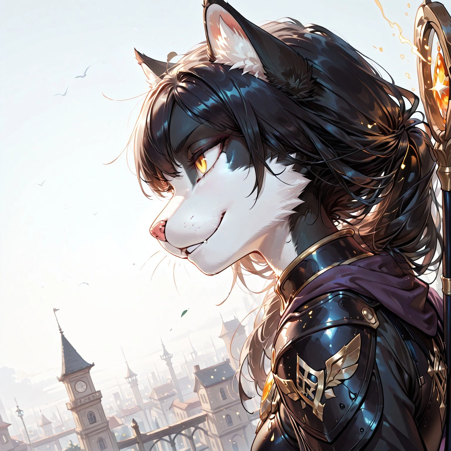 Ember (ESO), furry female, black hair, Feline, black and white fur, yellow eyes, black armor, cat tail